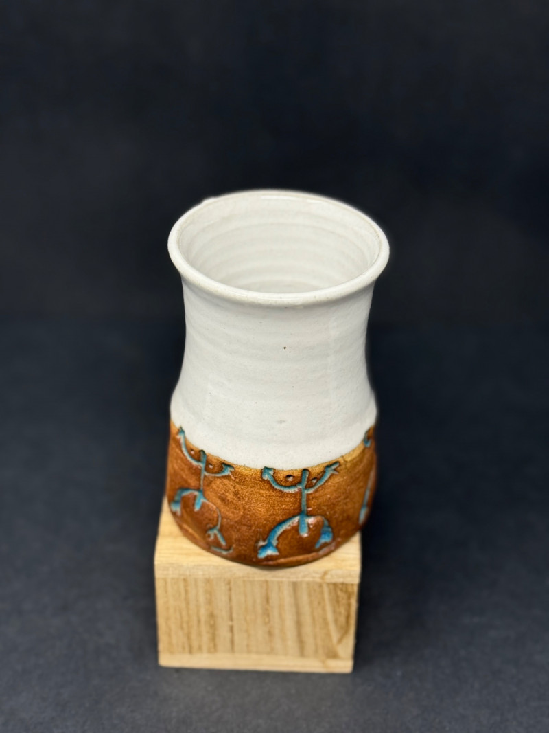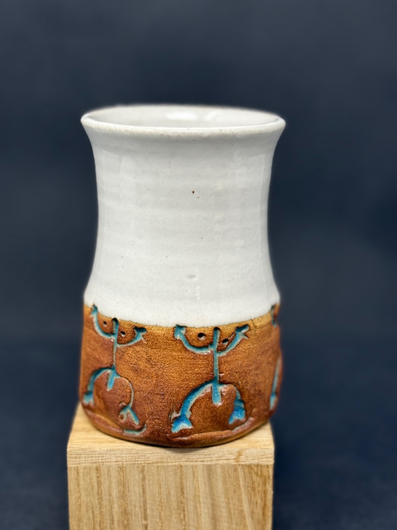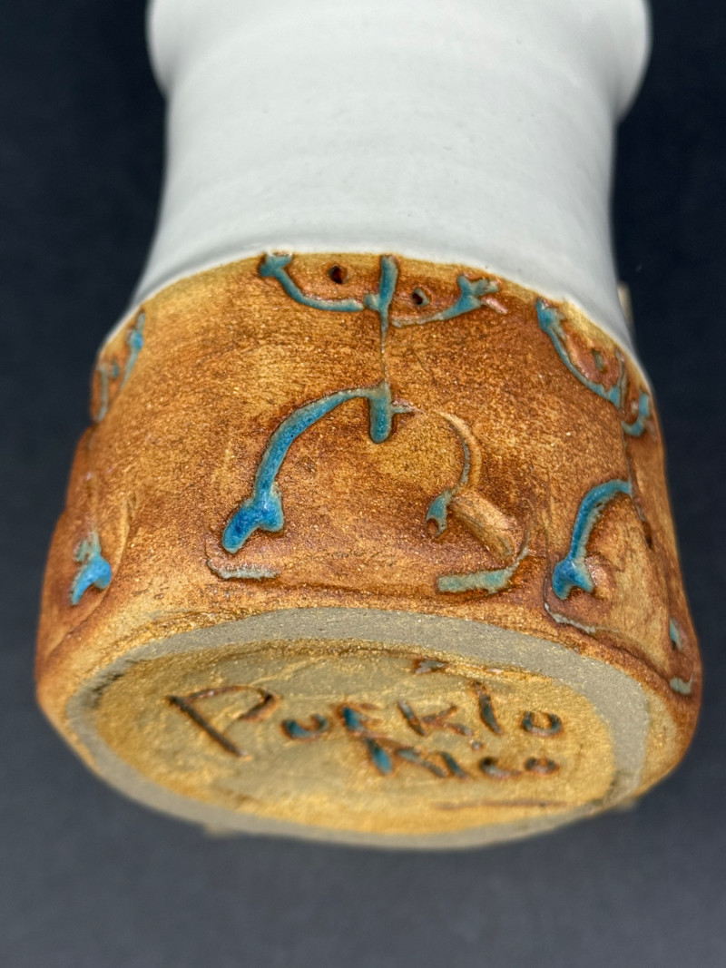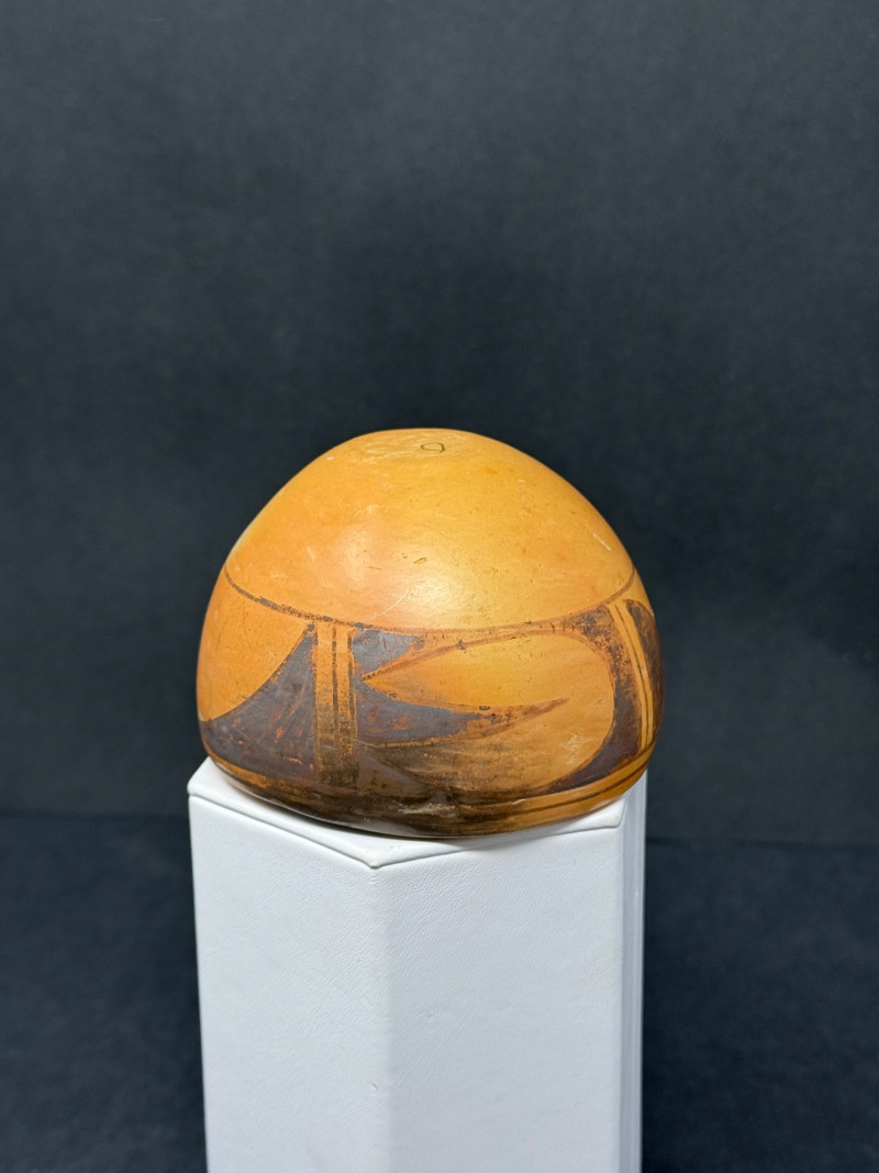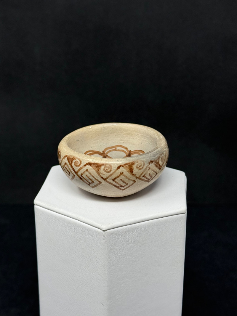 Native American Hopi Pottery Bowl, Miniature Pueblo Pottery, & Hector Marrero Studio Vessel – Lot of 4 A mixed lot of Native American and studio pottery, featuring both traditional pueblo-style bowls and a signed modernist vessel by Puerto Rican potter Hector Marrero. Hopi Pottery Bowl (1): Traditional hand-coiled and painted clay bowl with geometric black-on-red design. Approx. 3.5" H × 4.5" W. Miniature Pueblo Pottery Bowl (1): Light clay with hand-incised Greek key and wave patterns, approx. 2" H × 3.5" W. Hector Marrero Studio Vessel (1): Wheel-thrown stoneware vase with white glazed upper body and textured ochre base featuring stylized human figures in turquoise. Signed piece, Puerto Rico. Approx. 5.5" H × 4" W. Blackware Bowl & Saucer (1 set): Pueblo-inspired black pottery with incised feather and wave designs. Bowl approx. 2.5" H × 4" W; saucer approx. 5.5" diameter. Era: Mid to late 20th Century Makers: Hopi Tribe (USA); Hector Marrero (Puerto Rico); Pueblo style (attributed) Condition: Very good vintage condition; minor surface wear, no major chips or cracks. Historical Note: Hopi pottery continues a centuries-old tradition of coiled clay vessels decorated with symbolic geometric designs representing water, crops, and migration. The Hector Marrero studio piece reflects the influence of Puerto Rican modernist pottery of the mid-20th century, celebrated for blending indigenous Caribbean motifs with contemporary design.