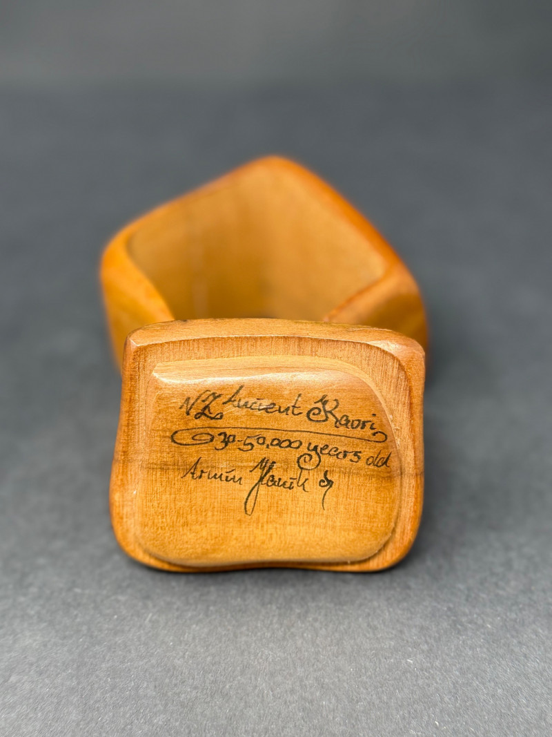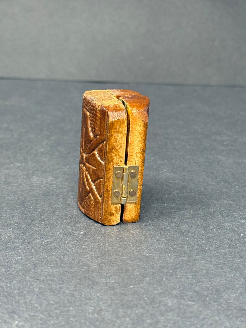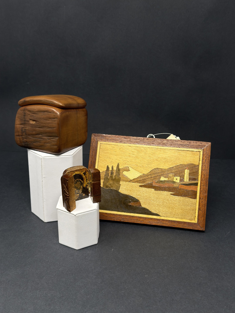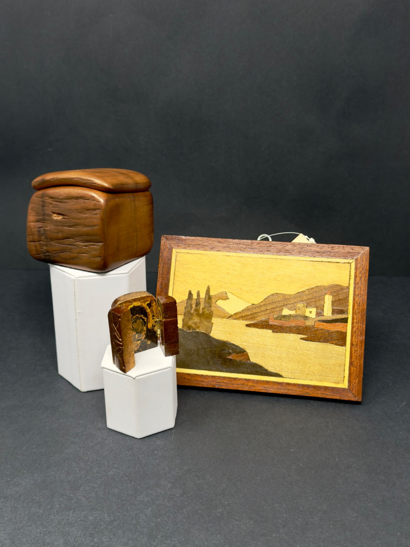 A diverse grouping of artisan and vintage woodcraft, showcasing signed works and skilled hand-carving. Bruce Byall Box (1): Free-form lidded trinket box, hand-carved walnut, dated 1981. Known for its sculptural, organic form. Approx. 2.5" H × 5.5" L. Armin Janell Box (1): Hand-carved box made from ancient New Zealand kauri wood (estimated 30,000–50,000 years old). Signed by maker. Approx. 3" H × 4" L. Tom Woytyshyn Marquetry (1): “Swiss Lake” wood inlay picture, crafted with 13 kinds of wood sourced worldwide. Made under Washington Senior Craftsmen Guild. Approx. 8" W × 6" H. Miniature Shrine (1): Vintage three-panel hinged Christian shrine, intricately hand-carved, approx. 2" H. Era: 20th Century (1980s artisan boxes, mid-century shrine & marquetry) Makers: Bruce Byall (USA), Armin Janell (NZ), Tom Woytyshyn (WA Senior Craftsmen Guild), unknown artisan (shrine) Condition: Very good vintage condition with light wear consistent with age. Historical Note: Bruce Byall became known in the 1980s for his free-form walnut boxes, celebrated for their sculptural elegance. Armin Janell’s use of ancient kauri wood connects contemporary craft to one of the oldest workable timbers in the world. Tom Woytyshyn’s marquetry reflects the Pacific Northwest artisan tradition, with pieces created under the Washington Senior Craftsmen Guild.