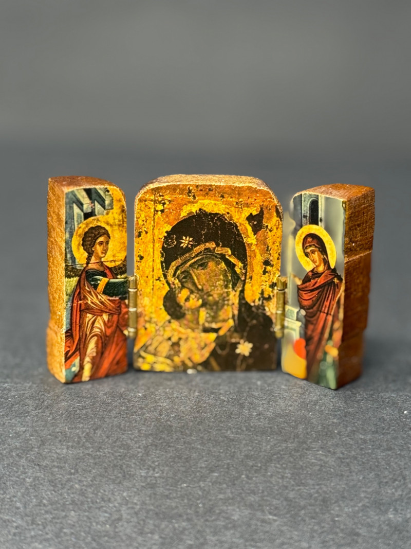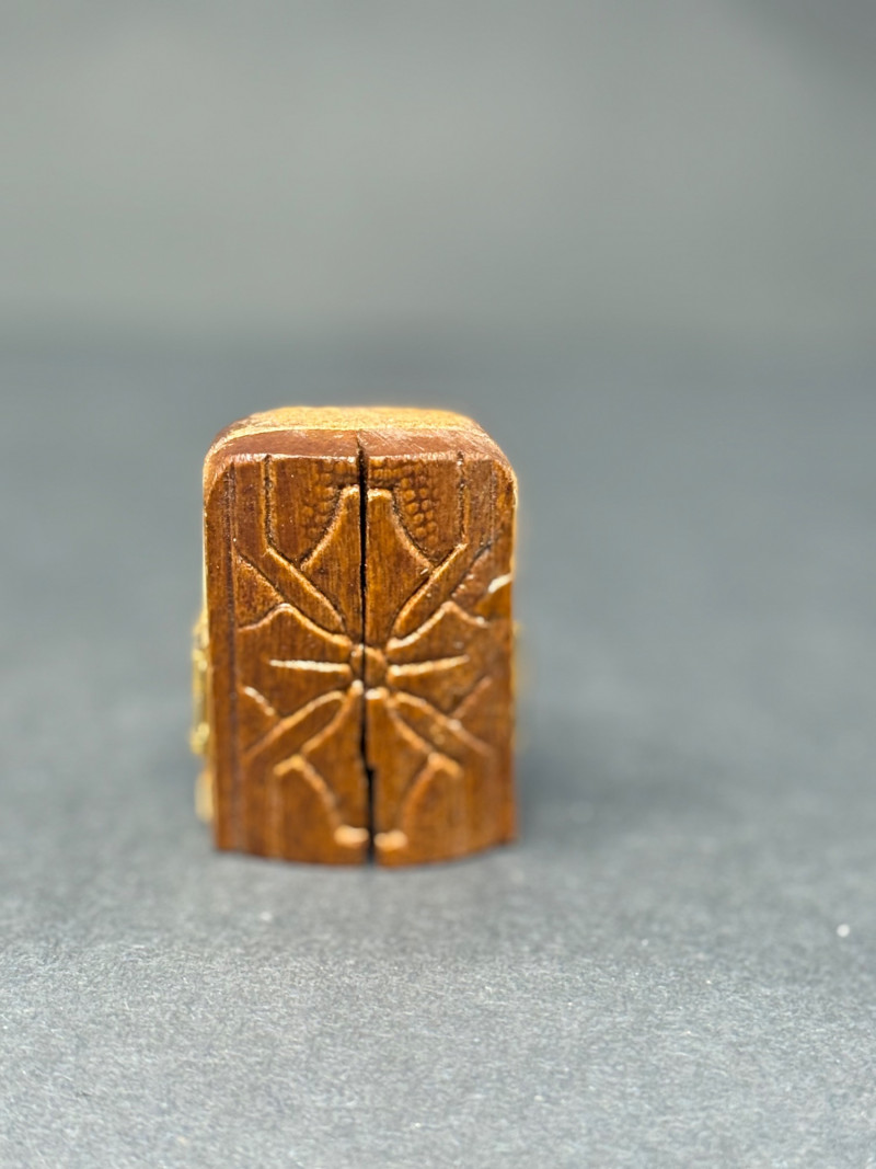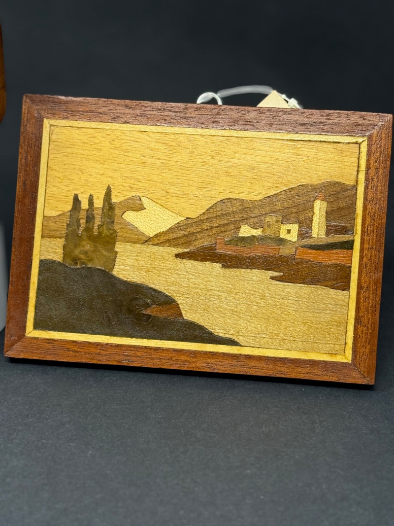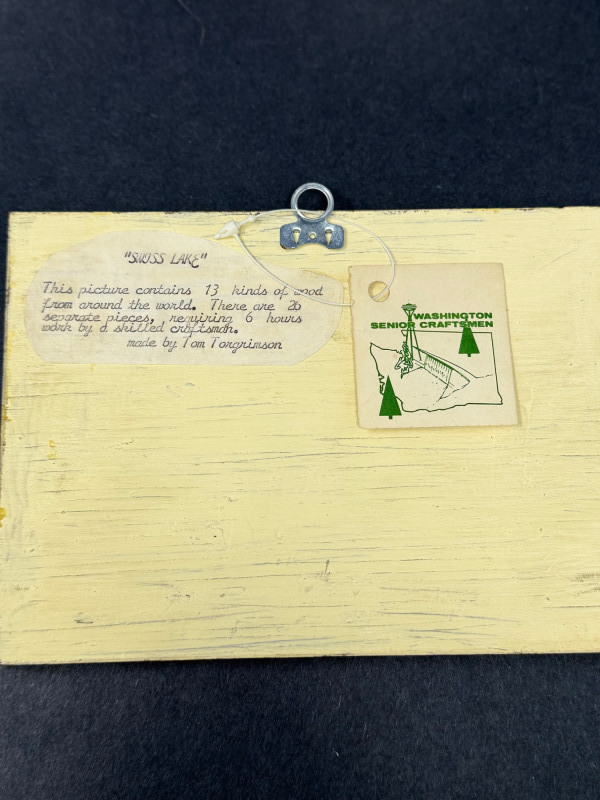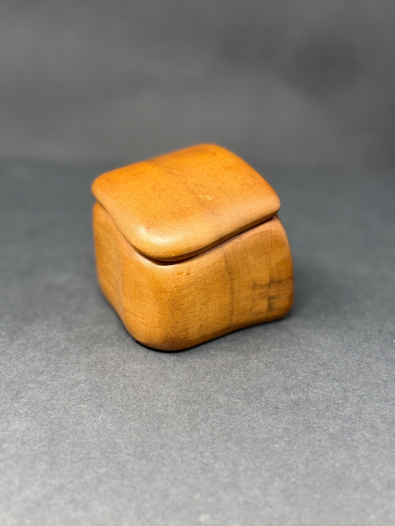 A diverse grouping of artisan and vintage woodcraft, showcasing signed works and skilled hand-carving. Bruce Byall Box (1): Free-form lidded trinket box, hand-carved walnut, dated 1981. Known for its sculptural, organic form. Approx. 2.5" H × 5.5" L. Armin Janell Box (1): Hand-carved box made from ancient New Zealand kauri wood (estimated 30,000–50,000 years old). Signed by maker. Approx. 3" H × 4" L. Tom Woytyshyn Marquetry (1): “Swiss Lake” wood inlay picture, crafted with 13 kinds of wood sourced worldwide. Made under Washington Senior Craftsmen Guild. Approx. 8" W × 6" H. Miniature Shrine (1): Vintage three-panel hinged Christian shrine, intricately hand-carved, approx. 2" H. Era: 20th Century (1980s artisan boxes, mid-century shrine & marquetry) Makers: Bruce Byall (USA), Armin Janell (NZ), Tom Woytyshyn (WA Senior Craftsmen Guild), unknown artisan (shrine) Condition: Very good vintage condition with light wear consistent with age. Historical Note: Bruce Byall became known in the 1980s for his free-form walnut boxes, celebrated for their sculptural elegance. Armin Janell’s use of ancient kauri wood connects contemporary craft to one of the oldest workable timbers in the world. Tom Woytyshyn’s marquetry reflects the Pacific Northwest artisan tradition, with pieces created under the Washington Senior Craftsmen Guild.