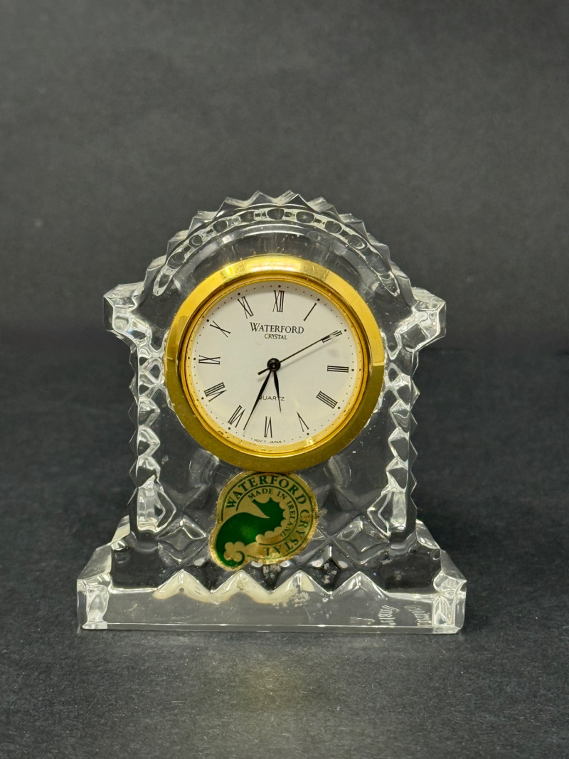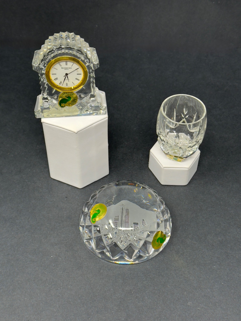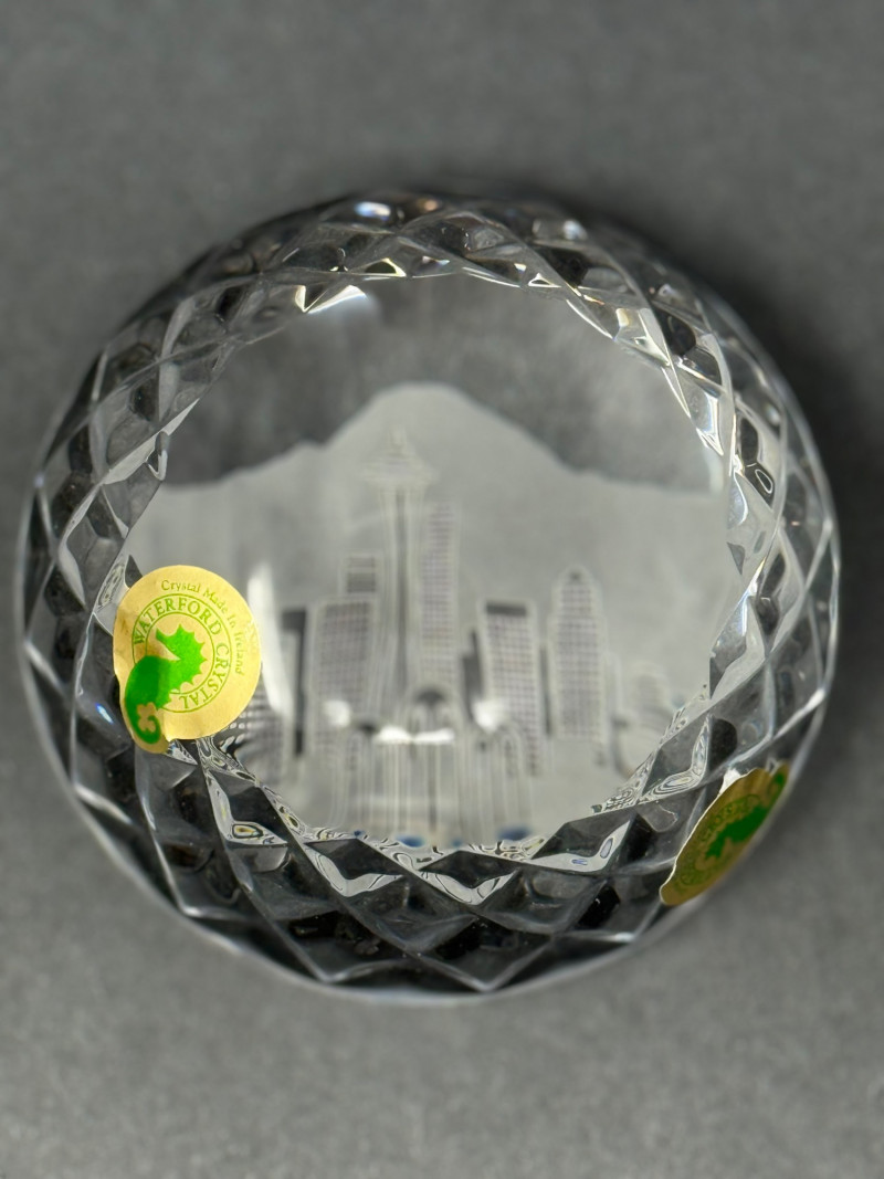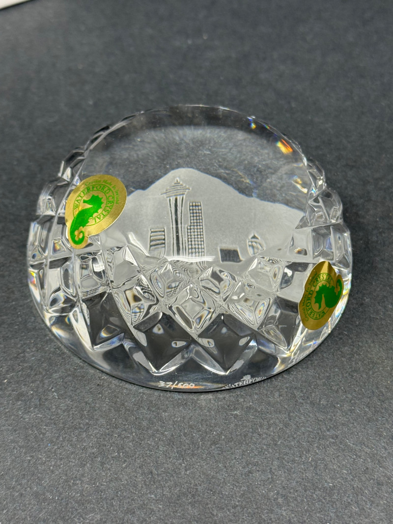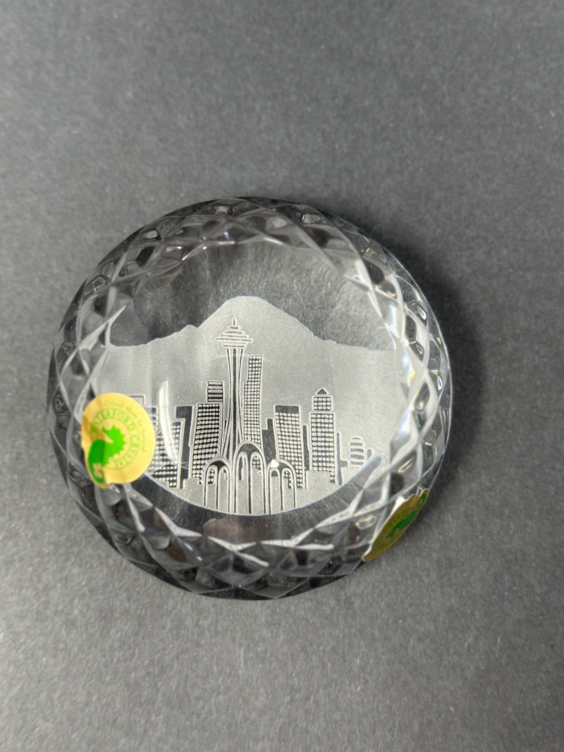 3 Waterford Crystal Pieces – Clock, Seattle Skyline Paperweight & Cut Glass Egg A refined grouping of Waterford Crystal, each piece showcasing the brand’s brilliance and craftsmanship. Includes: Waterford Crystal Clock: Mantel/desk clock with quartz movement, set in a cut crystal case with gold-tone bezel. Approx. 4.5" H. Waterford Crystal Paperweight: Faceted dome-form paperweight etched with the Seattle skyline, featuring the Space Needle and surrounding buildings. Approx. 3.5" diameter. Waterford Crystal Egg: Cut crystal decorative egg with starburst pattern, approx. 3" H. Maker: Waterford Crystal, Ireland Era: Late 20th Century Material: Full lead crystal Condition: Excellent vintage condition; no chips or cracks, clock untested for working order. Collector Note: The Seattle skyline paperweight is a standout among Waterford’s commemorative pieces, often produced in limited runs and prized by both crystal and regional memorabilia collectors.