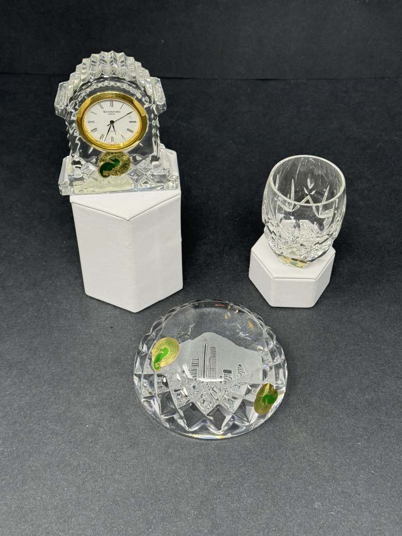Lot # 19 - 3 Waterford Crystal Pieces – Clock, Seattle Skyline Paperweight & Cut