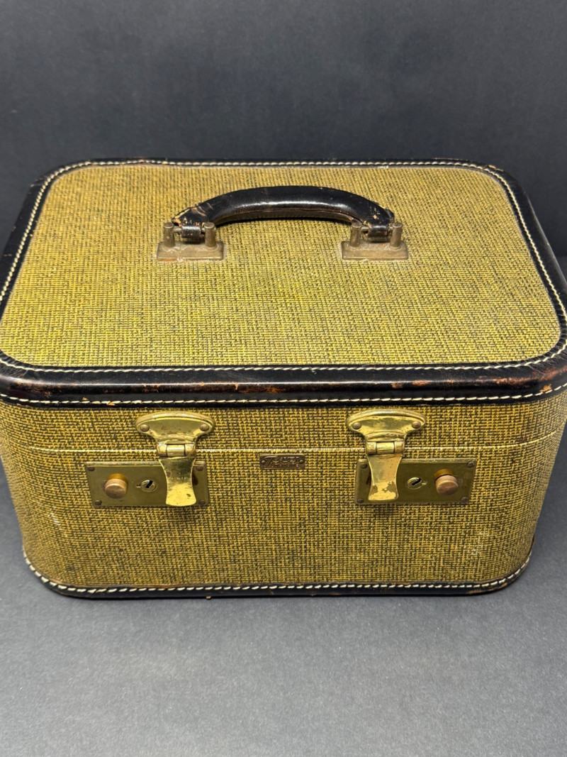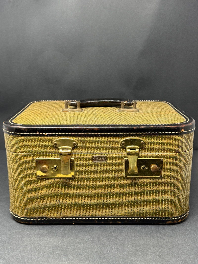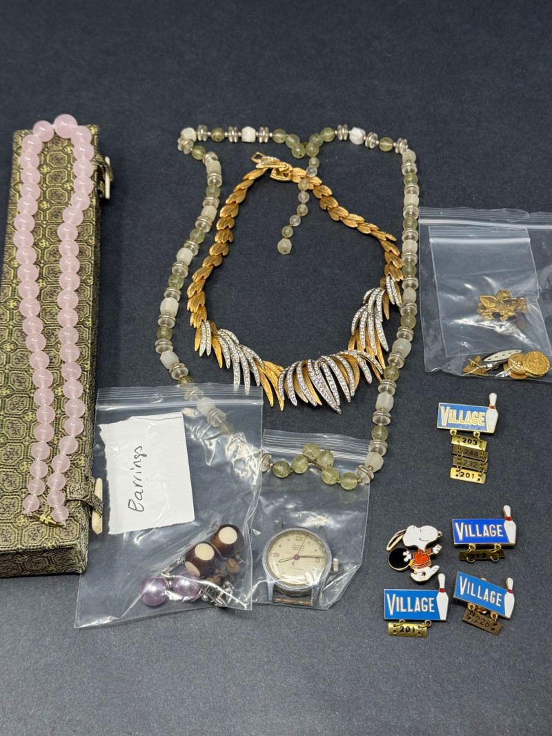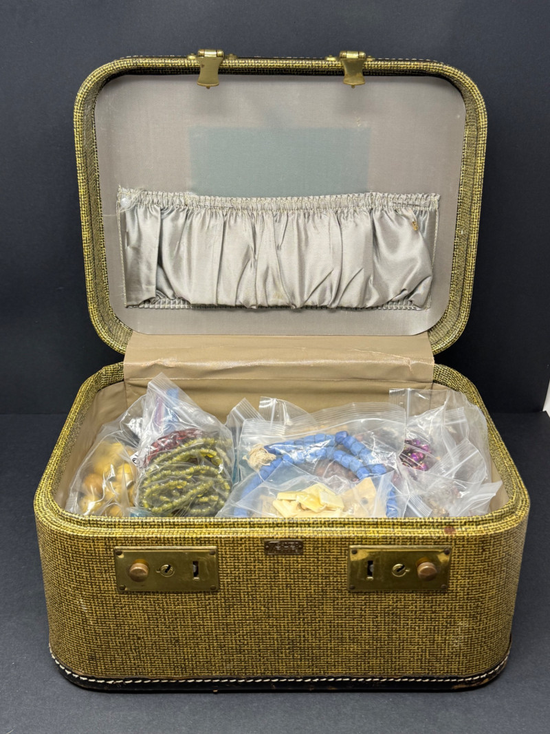 Vintage Suitcase Mystery Lot of Fashion Jewelry – Necklaces, Pins, Watches & More An exciting mystery lot of vintage and costume fashion jewelry, housed in a retro suitcase with satin-lined interior. The case contains numerous bagged pieces, offering a treasure-hunt experience for collectors and resellers alike. Previewed Pieces (examples): Gold-tone leaf necklace with rhinestone accents Beaded gemstone-style necklaces, including rose quartz strand Assorted earrings and pins (including Snoopy Village bowling pins) Vintage wristwatch (untested) Mixed beads and fashion bracelets Suitcase: Vintage fabric-covered hard case with brass hardware and satin interior pocket, approx. 13" W × 9" D × 7" H. Era: Mid to late 20th Century Contents: Dozens of assorted jewelry pieces, primarily fashion/costume, with potential vintage finds Condition: Jewelry untested/uncounted, sold as-is. Suitcase shows light wear consistent with age. Collector Note: Mystery jewelry lots are popular among resellers and collectors, as they often yield unexpected treasures. The included suitcase adds extra charm and practical storage.