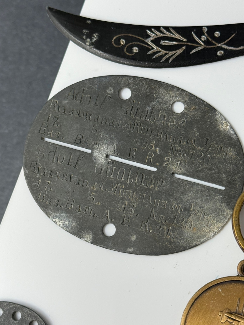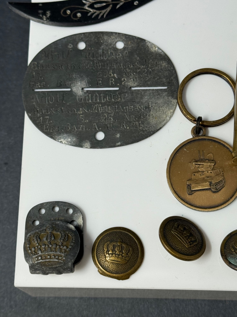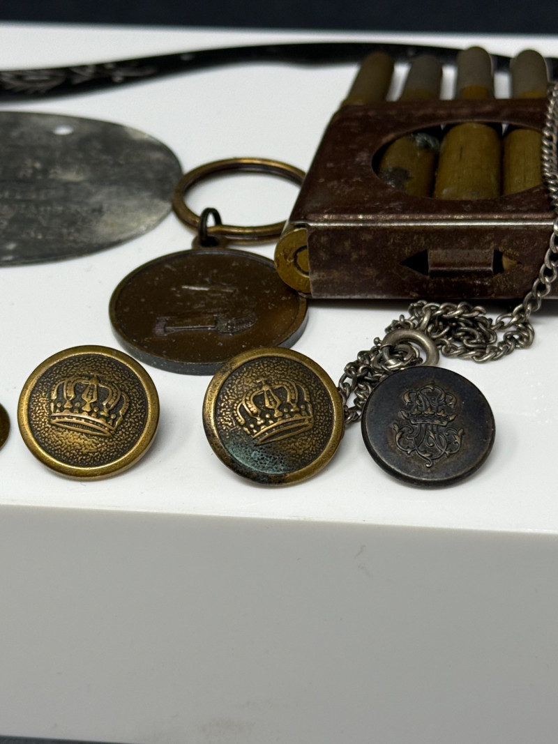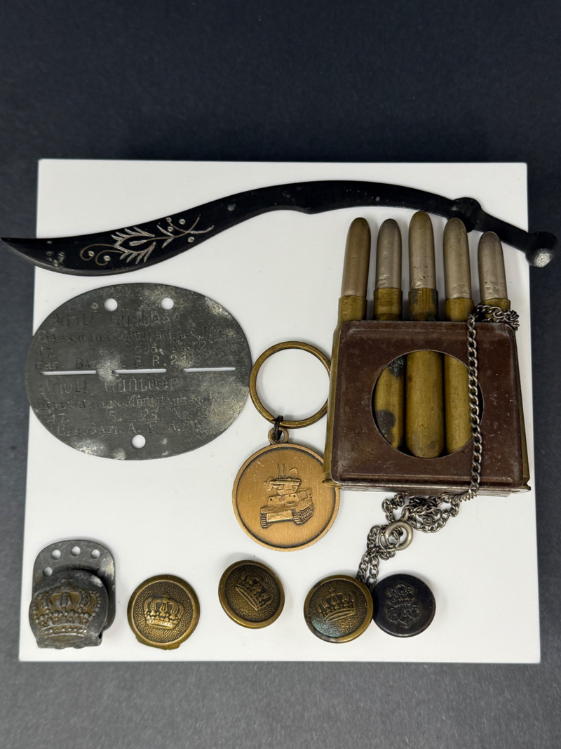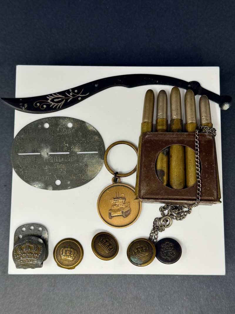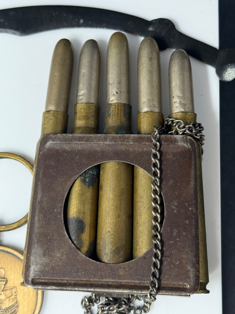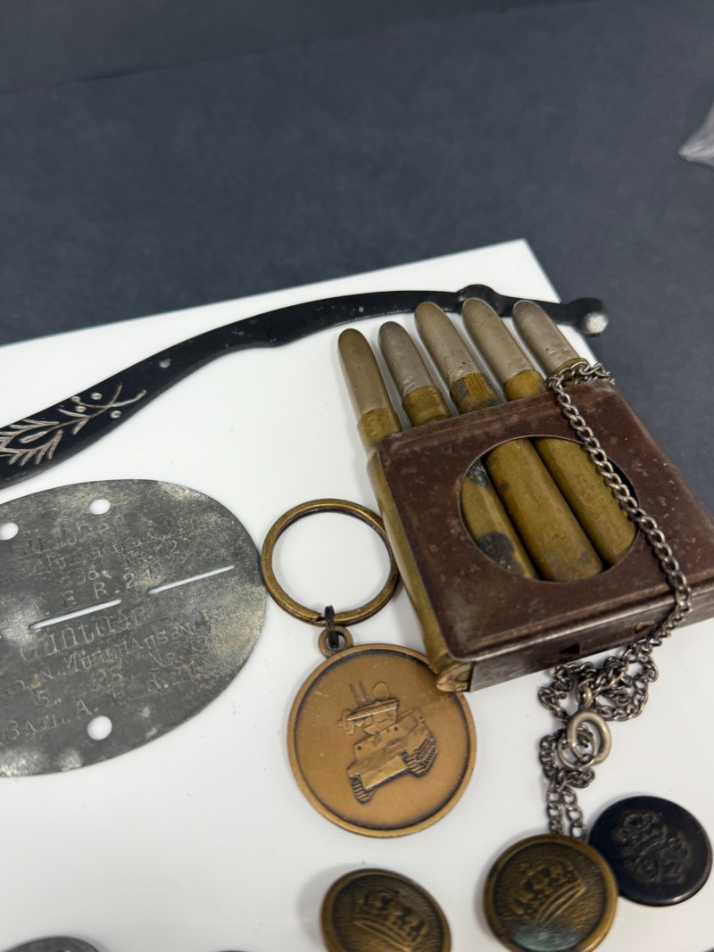 Lot of Military Memorabilia – Dog Tag, Buttons, Kukri Letter Opener, Trench Art & Medals A varied lot of vintage military memorabilia and related items, featuring insignia, field gear, and commemorative pieces. Includes: Military Dog Tag – stamped, oval aluminum style, approx. 2" × 1.5" Miniature Kukri Letter Opener – black handle with inlaid floral design, approx. 7" long Trench Art Lighter – crafted from five brass bullet casings, with attached chain Bronze Tank Medal / Key Fob – approx. 1.5" diameter Assorted Crown Buttons – (5) brass and metal uniform buttons, ranging 0.75"–1" in diameter, various crowned designs Crown Belt/Cap Badge – pressed metal with crown motif, approx. 1.25" Era: Primarily mid–20th Century, with possible WWII items Materials: Mixed metals, brass, aluminum, enamel, composite Condition: Mixed vintage condition; some oxidation and patina consistent with age Collector Note: This grouping combines both official uniform insignia and unique trench art / soldier-made items. Such lots are prized for the glimpse they offer into the personal and practical side of military life, making them highly collectible across military history fields.