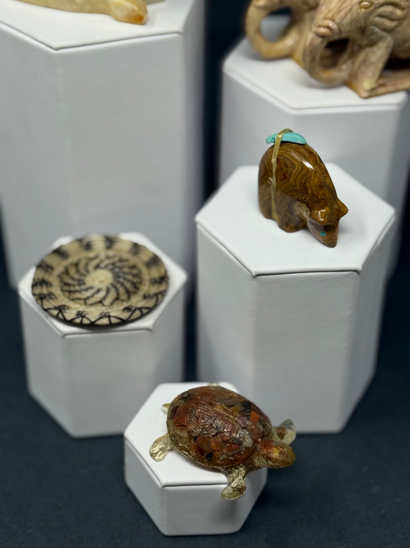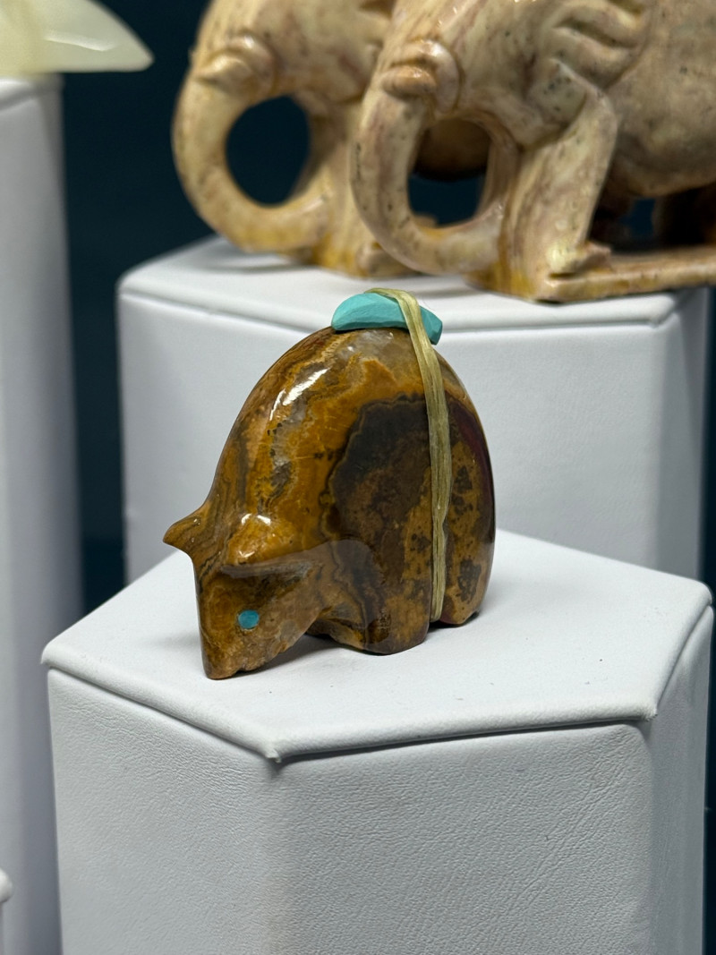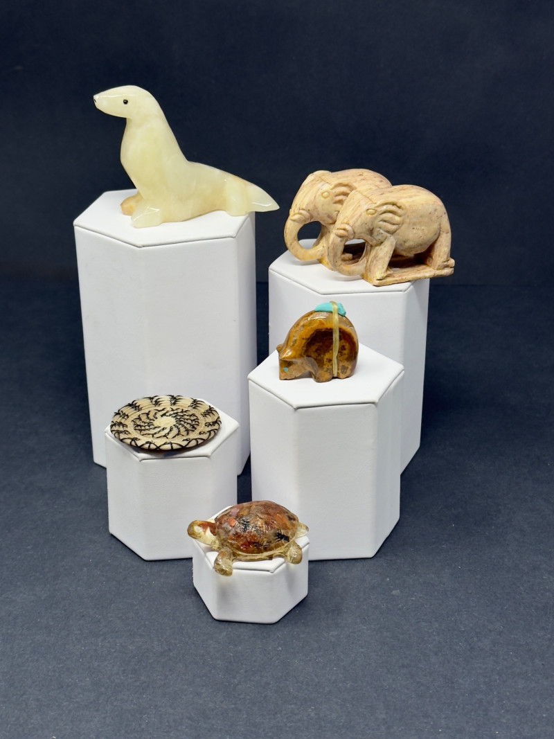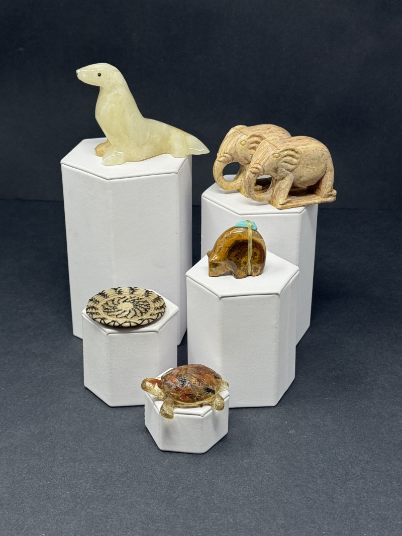 Charming mixed-material lot featuring hand-carved and artisan-crafted pieces, combining natural stone, resin, and Native American–style work. Includes: Vintage 1970s Onyx Seal Figurine – Hand-carved from creamy onyx stone, approx. 4" long. Hand-Carved Soapstone Elephants – Pair of trunk-up elephants symbolizing good luck, approx. 2.5" each. Zuni-Style Boulder Opal Bear Fetish – In the style of Lena Boone, with turquoise and coral offering bundle, approx. 2.25" long. Miniature Horsehair Basket – Native American Tohono O’Odham–style piece, finely woven, approx. 2" diameter. Epoxy Resin Turtle Paperweight – Embedded with dried flowers and natural inclusions, approx. 3" long. Measurements: Range approx. 2" to 4" in length. Condition: Good vintage condition with light age-appropriate wear; no major chips or cracks observed. Why Collectible: