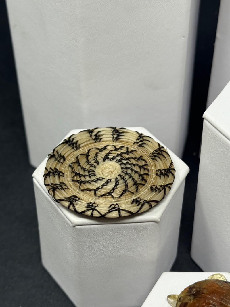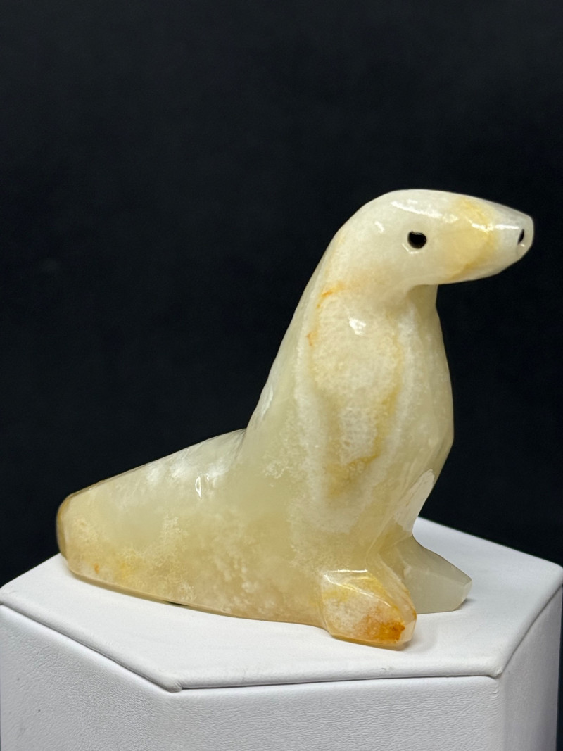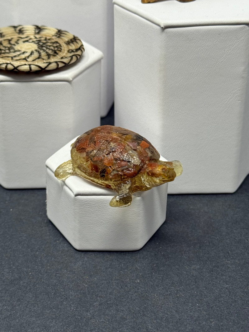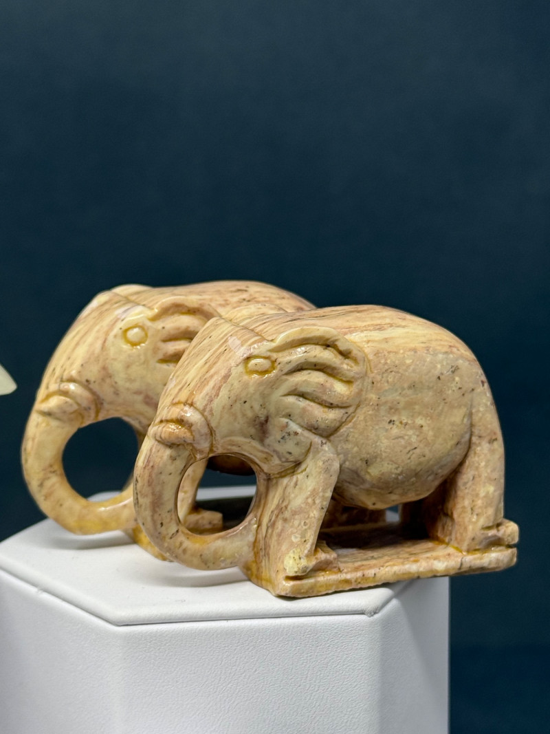 Charming mixed-material lot featuring hand-carved and artisan-crafted pieces, combining natural stone, resin, and Native American–style work. Includes: Vintage 1970s Onyx Seal Figurine – Hand-carved from creamy onyx stone, approx. 4" long. Hand-Carved Soapstone Elephants – Pair of trunk-up elephants symbolizing good luck, approx. 2.5" each. Zuni-Style Boulder Opal Bear Fetish – In the style of Lena Boone, with turquoise and coral offering bundle, approx. 2.25" long. Miniature Horsehair Basket – Native American Tohono O’Odham–style piece, finely woven, approx. 2" diameter. Epoxy Resin Turtle Paperweight – Embedded with dried flowers and natural inclusions, approx. 3" long. Measurements: Range approx. 2" to 4" in length. Condition: Good vintage condition with light age-appropriate wear; no major chips or cracks observed. Why Collectible: