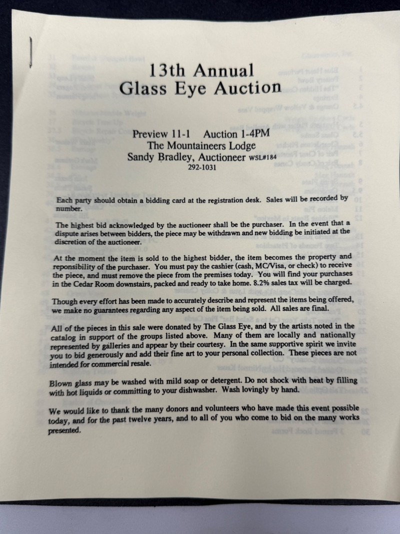 Acquired through the 13th Annual Glass Eye Auction (The Mountaineers Lodge, auctioneer Sandy Bradley). This event was a major showcase of Seattle’s glass art movement, featuring works donated directly by artists and galleries.