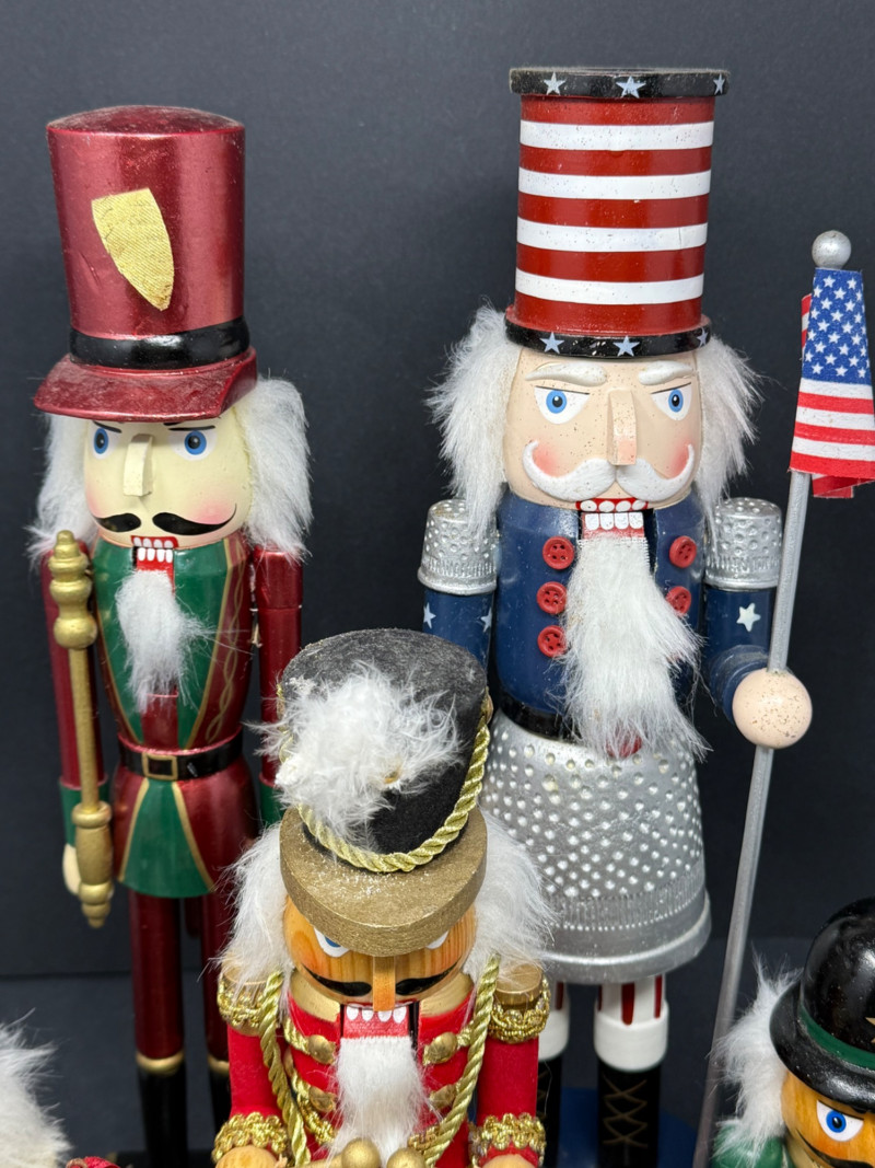 Vintage Wooden Nutcrackers – Patriotic, Drummer, Soldier & Christmas Ornaments Eclectic grouping of 16 vintage wooden nutcrackers, ranging from full-size display figures to miniature ornaments. A festive collection showcasing hand-painted details, whimsical uniforms, and traditional holiday charm. Highlights include: Large Patriotic Nutcracker – Red, white, and blue figure with top hat, American flag, and studded detail, approx. 16" tall. Traditional Red & Gold Soldiers – Regal designs with staffs, crowns, and gilded accents, ranging 10"–14". Classic Drummer & Military Figures – Bold painted uniforms with expressive faces, approx. 6"–8". Miniature Nutcracker Ornaments – Small hanging versions in festive colors, approx. 2"–4" each. Variety of styles: soldier, king, drummer, whimsical holiday characters, and a star-topped jester-style nutcracker. Measurements: Range approx. 2" to 16" tall. Condition: Good vintage condition overall; light wear consistent with age and display use. Why Collectible: