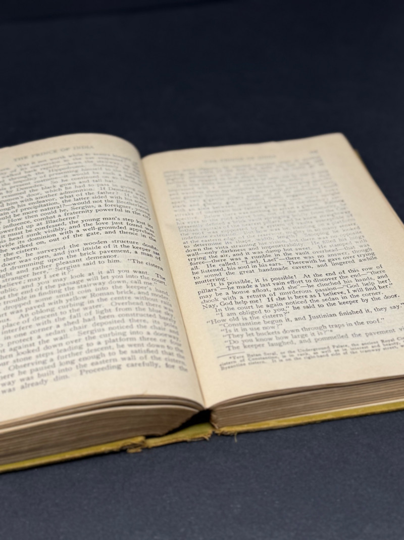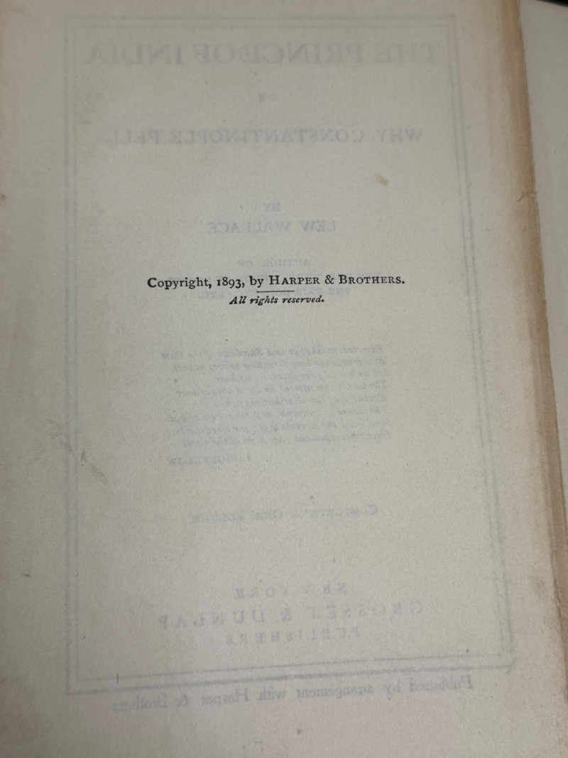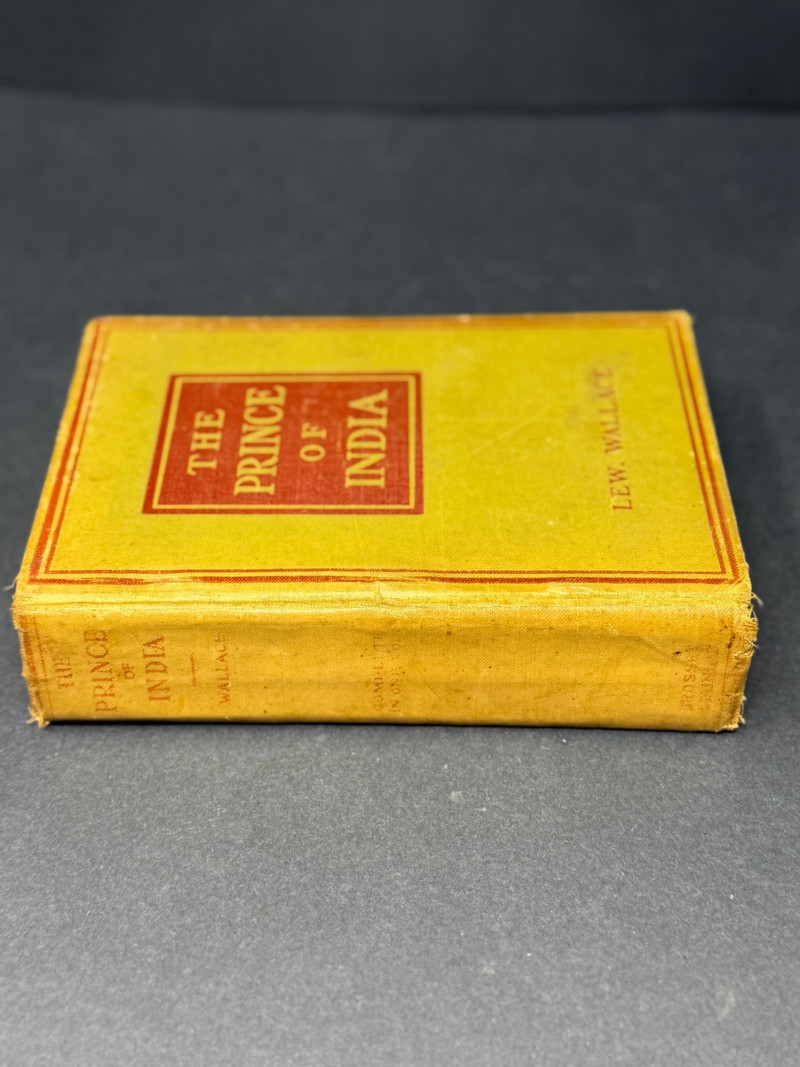 Lew Wallace – The Prince of India; or, Why Constantinople Fell – First Edition, 1893 First edition of Lew Wallace’s sweeping two-volume historical romance, The Prince of India, published in 1893 by Harper & Brothers (New York). Best known as the author of Ben-Hur, Wallace here turns his imagination to the fall of Constantinople in 1453, weaving themes of faith, empire, and destiny into an ambitious narrative. Details: Author: Lew Wallace (1827–1905) Title: The Prince of India; or, Why Constantinople Fell Edition: First Edition, 1893 Publisher: Harper & Brothers, New York Binding: Original mustard cloth with red stamped title panel and ruled borders Size: Approx. 7.5" tall × 5.25" wide × 2" thick Condition: Good overall. Cloth shows age toning and surface wear, with light soiling and softening at corners and spine ends. Hinges tender but intact, pages clean with moderate toning typical of 19th-century paper. Why Collectible: