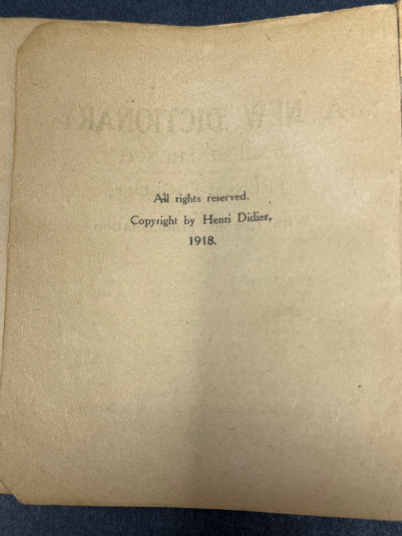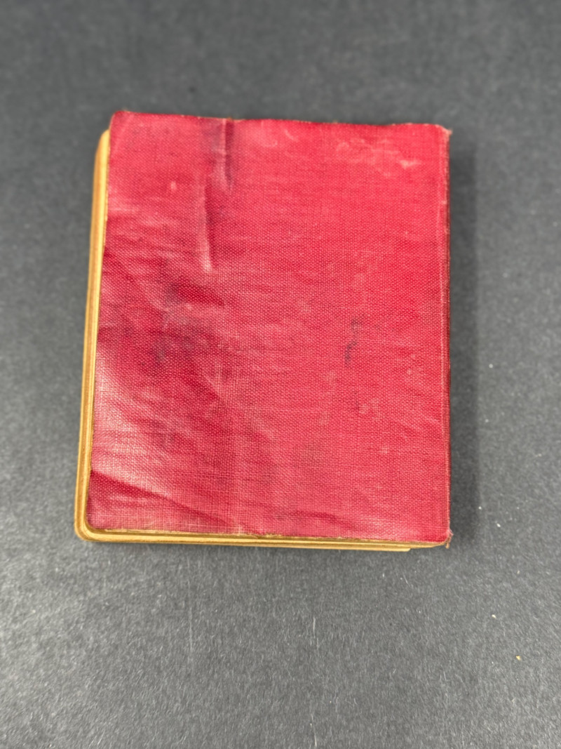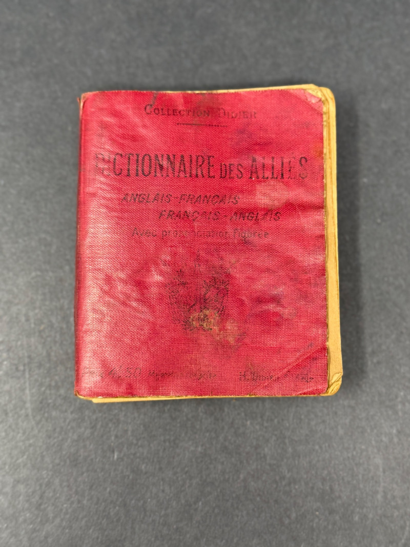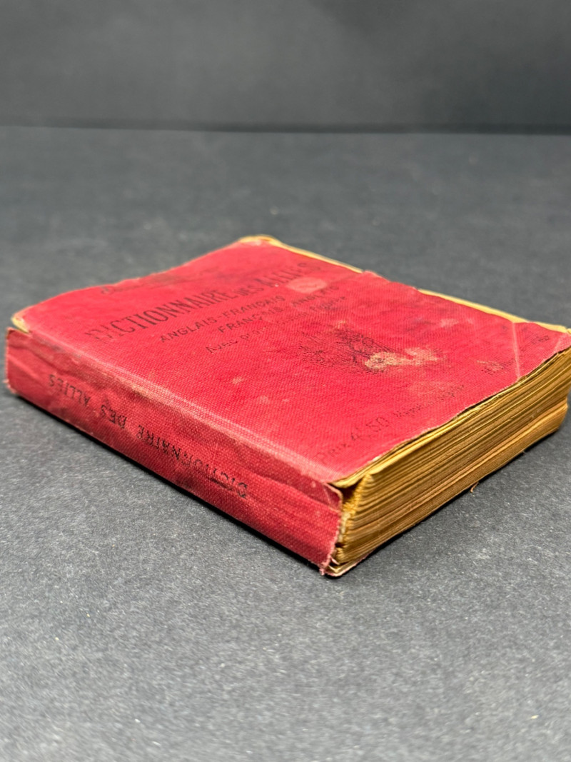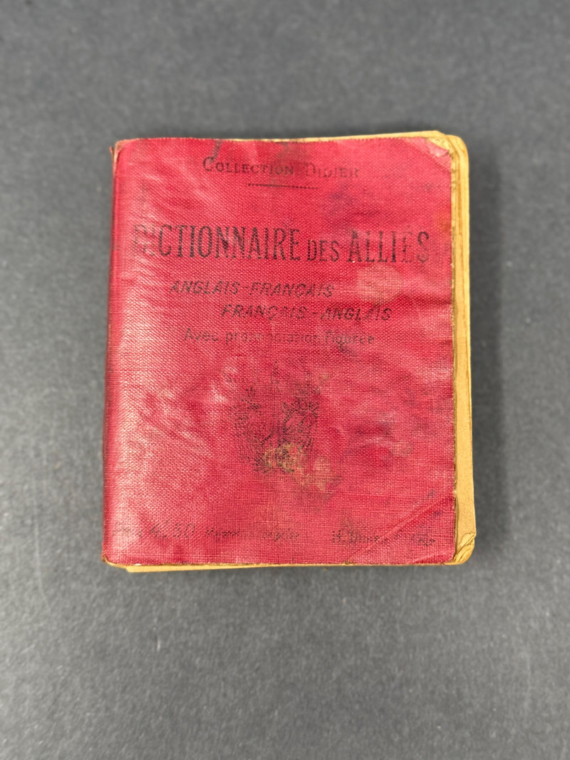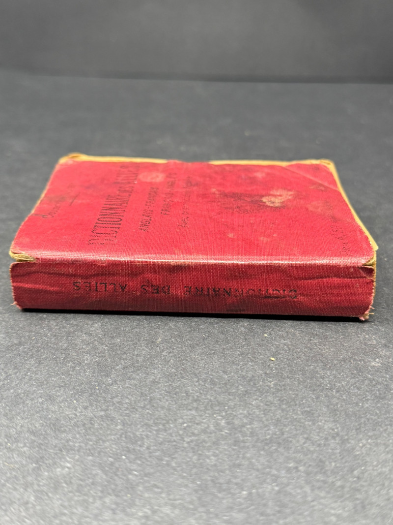 Dictionnaire des Alliés – English-French / French-English – WWI/WWII Era Pocket Edition A compact bilingual military dictionary titled Dictionnaire des Alliés, designed for Allied soldiers and travelers to quickly translate between English and French. Bound in its original red cloth flexible covers with black lettering, this volume would have been an essential field tool during wartime, small enough to carry in a pocket or pack. Title: Dictionnaire des Alliés (Anglais–Français / Français–Anglais) Publisher/Series: Collection Didier (Paris) Date: Circa WWI–WWII (early–mid 20th century) Binding: Sturdy pocket-sized red cloth with black stamped title Dimensions: Approx. 4.5" H × 3.5" W × 1" D Condition: Good for age. Wear to cloth with some fading, small stains, and softened corners from field use. Interior pages remain intact and legible, showing expected toning. Historical Note: