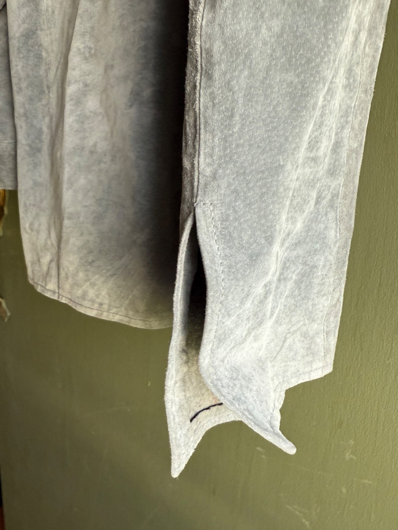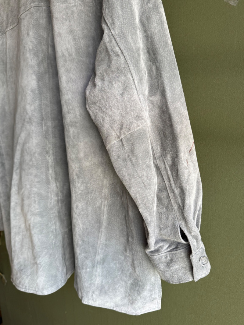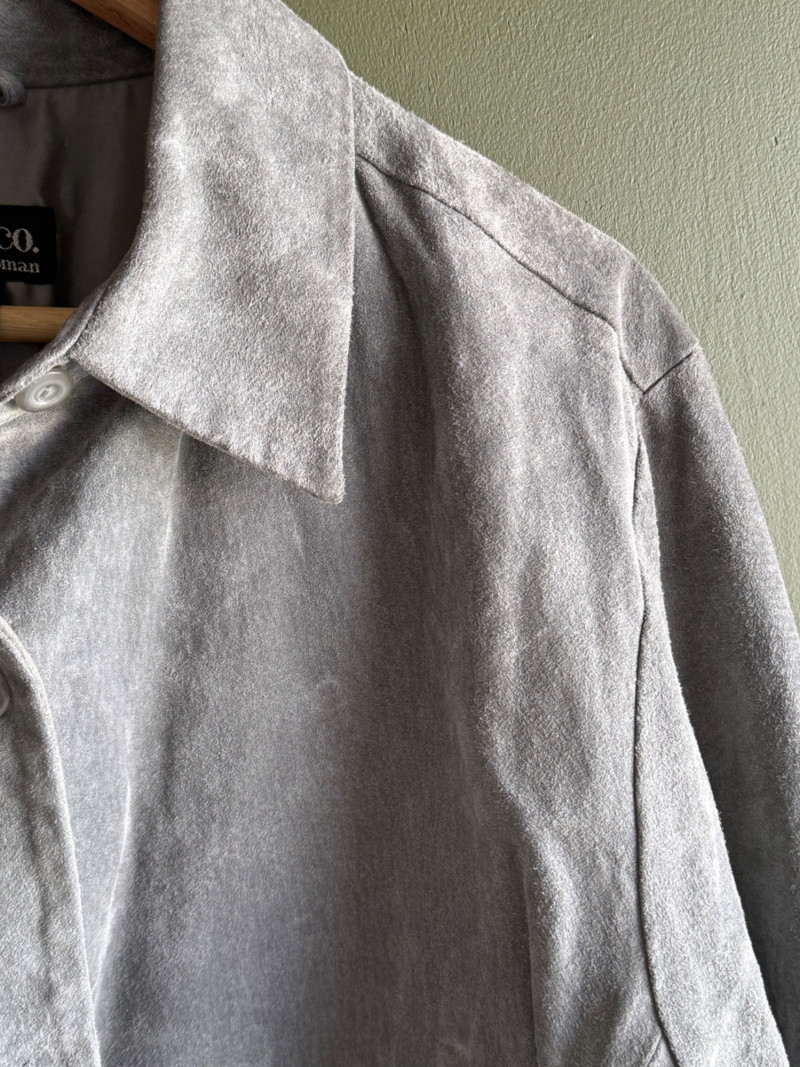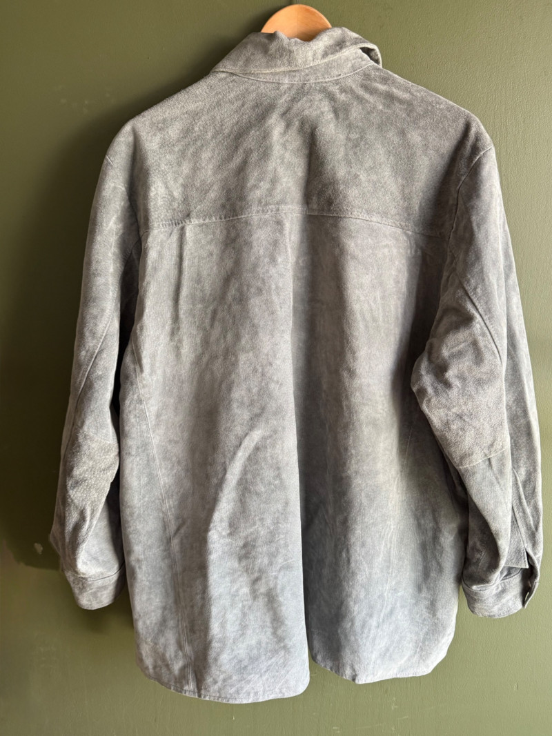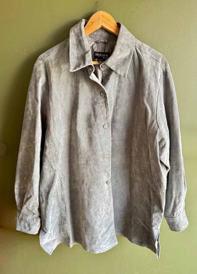 Style & Co. Woman Gray / Slate Suede Leather Jacket – Size 16 Elegant and timeless, this Style & Co. Woman jacket is crafted from 100% genuine leather with a soft suede finish in versatile gray. Featuring a button-front closure, collared neckline, and full lining in 100% acetate, it balances durability with a smooth, comfortable fit. Brand: Style & Co. Woman Size: 16 Material: Shell – 100% Leather | Lining – 100% Acetate Color: Gray / Slate suede Design: Classic button-up with collared neckline, long sleeves, and straight hem Condition: Good vintage condition with natural variations and light wear consistent with suede leather. Why it’s special: