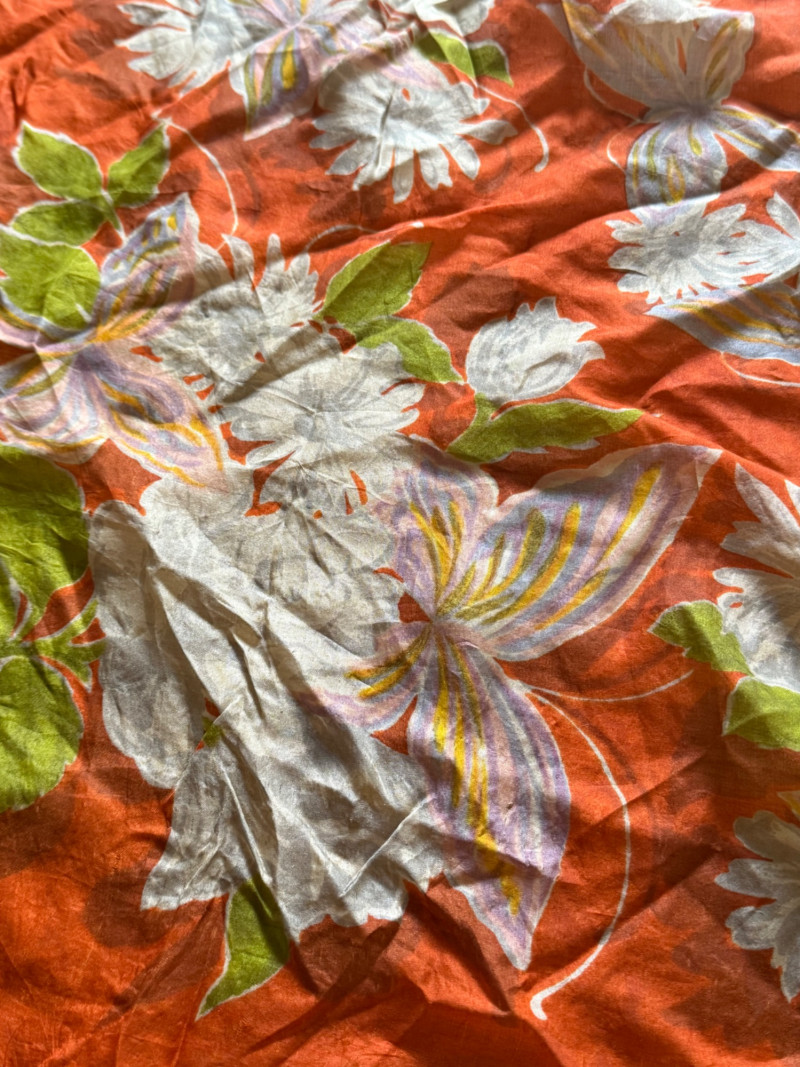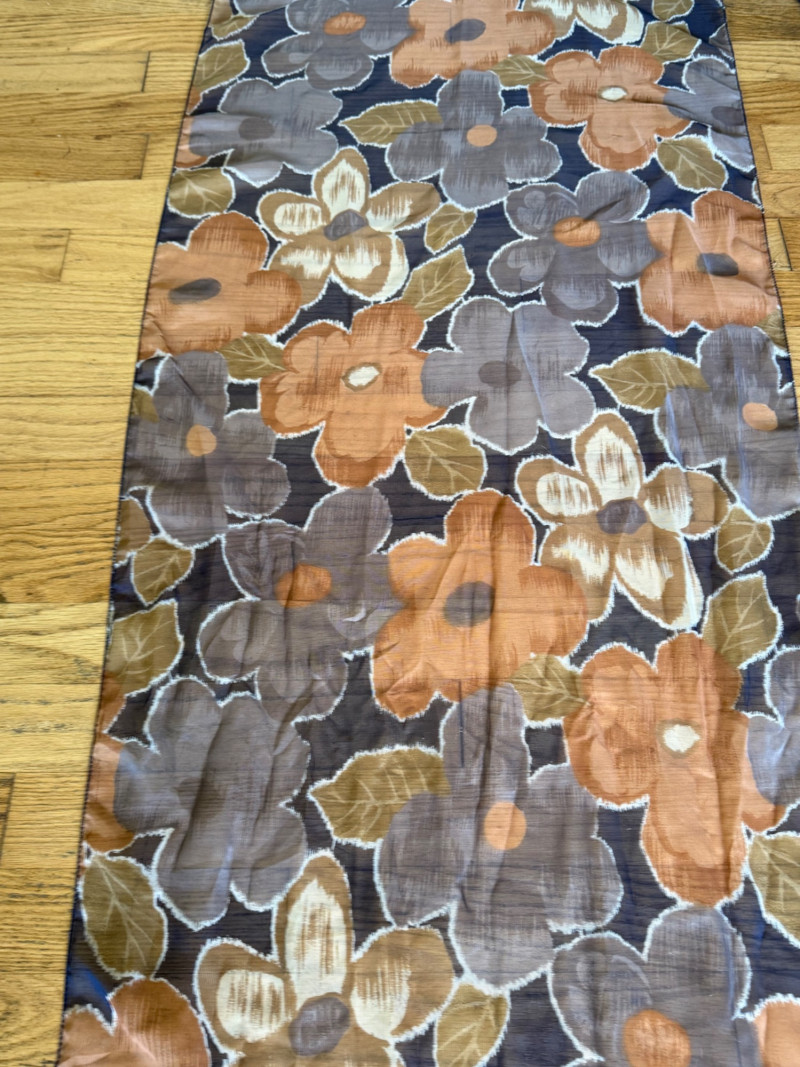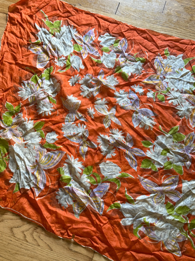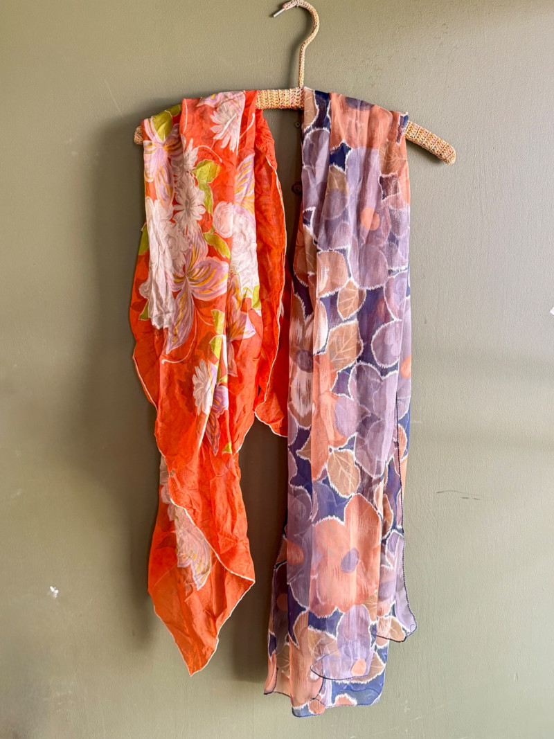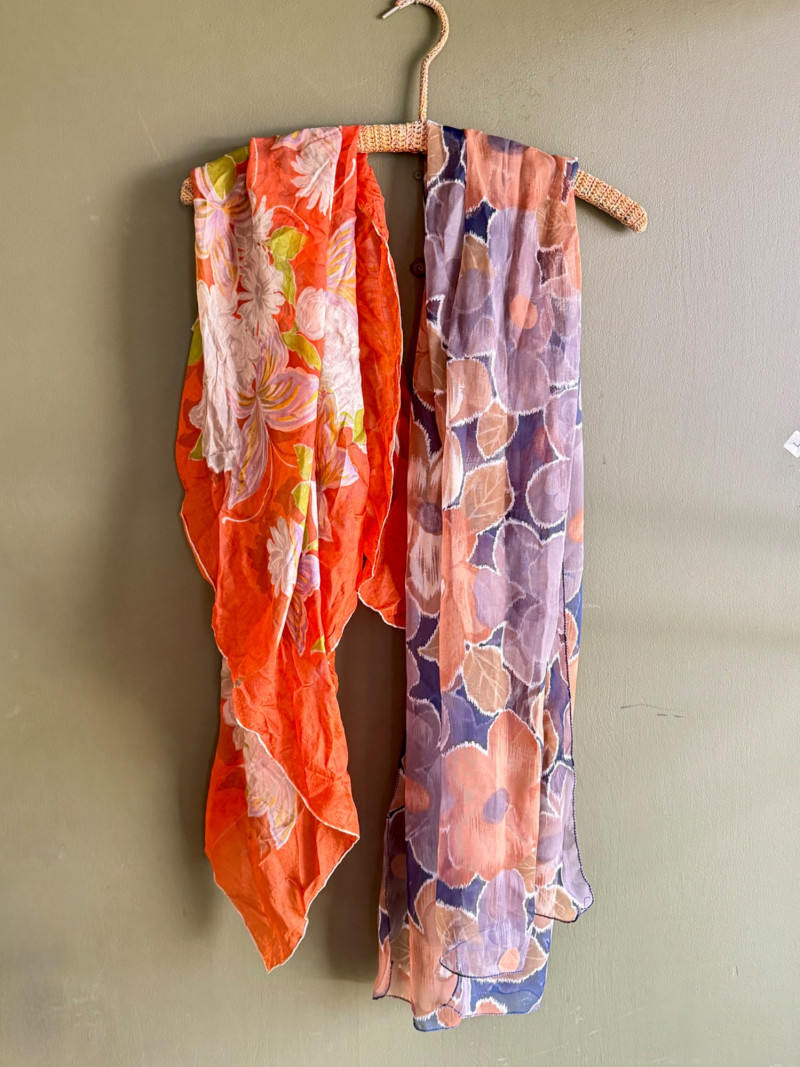 2 Vintage Sheer Floral Scarves – Bold Mid-Century Prints A charming pair of vintage sheer scarves, each featuring bold floral designs in vivid palettes. Lightweight and airy, these scarves offer a versatile splash of color—whether styled as accessories, framed as textile art, or incorporated into creative projects. Purple Floral Scarf – Approx. 62.5" L x 19.5" W, sheer fabric with abstracted floral print in purple, peach, and soft neutrals. Orange Floral Scarf – Approx. 29" L x 32.5" W, square format with vibrant orange ground and oversized pastel florals. Era: Mid-20th century Condition: Very good vintage condition with light wear consistent with age; colors remain bright and lively. Why it’s special: