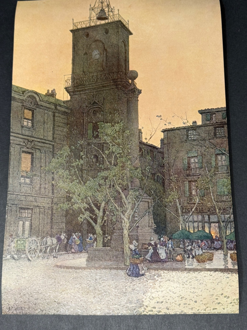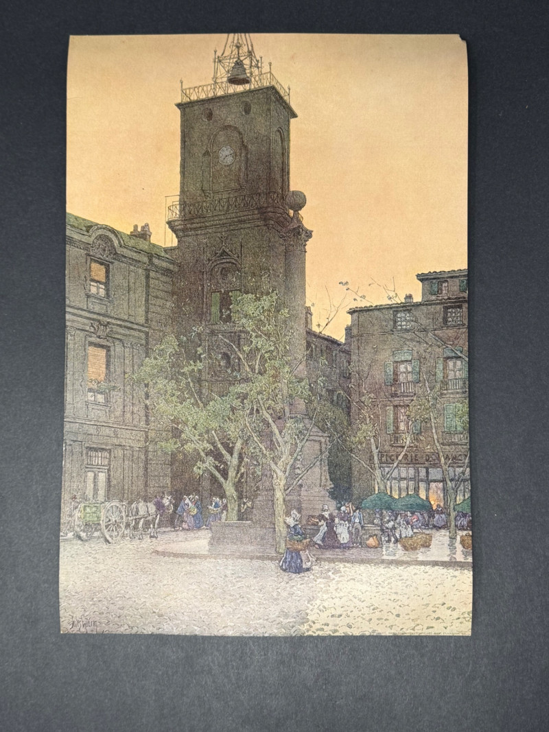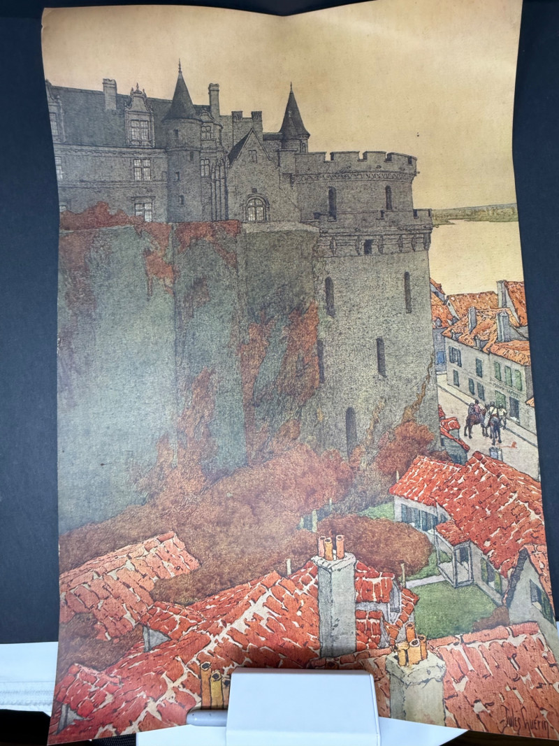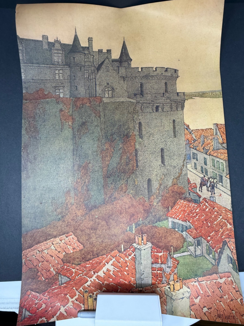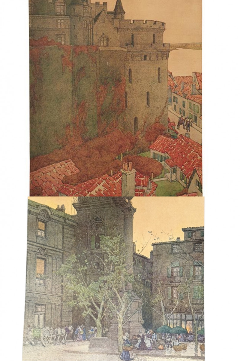 Pair of Jules Guérin Prints – Architectural & European Street Scenes – Early 20th Century Offered here is a pair of original color prints by renowned American artist Jules Guérin (1866–1946), celebrated for his architectural renderings and atmospheric cityscapes. Both works are finely detailed, with Guérin’s signature use of rich washes of color, precision linework, and tonal balance that evoke the romantic character of Europe. First Print: Market square scene featuring a tall clock tower, horse-drawn carriage, and bustling figures beneath trees and awnings. Second Print: Dramatic view of a hilltop château with stone towers, overlooking a town with red-tiled roofs and horsemen in the street below. Artist: Jules Guérin (signed in plate) These works exemplify Guérin’s mastery of architectural perspective and atmospheric illustration. He is widely known for his collaborations with Charles Moore on The Lincoln Memorial and his murals at the 1915 Panama-Pacific Exposition. Ideal for collectors of fine architectural art, early 20th century prints, or those seeking historic European views with timeless decorative appeal.