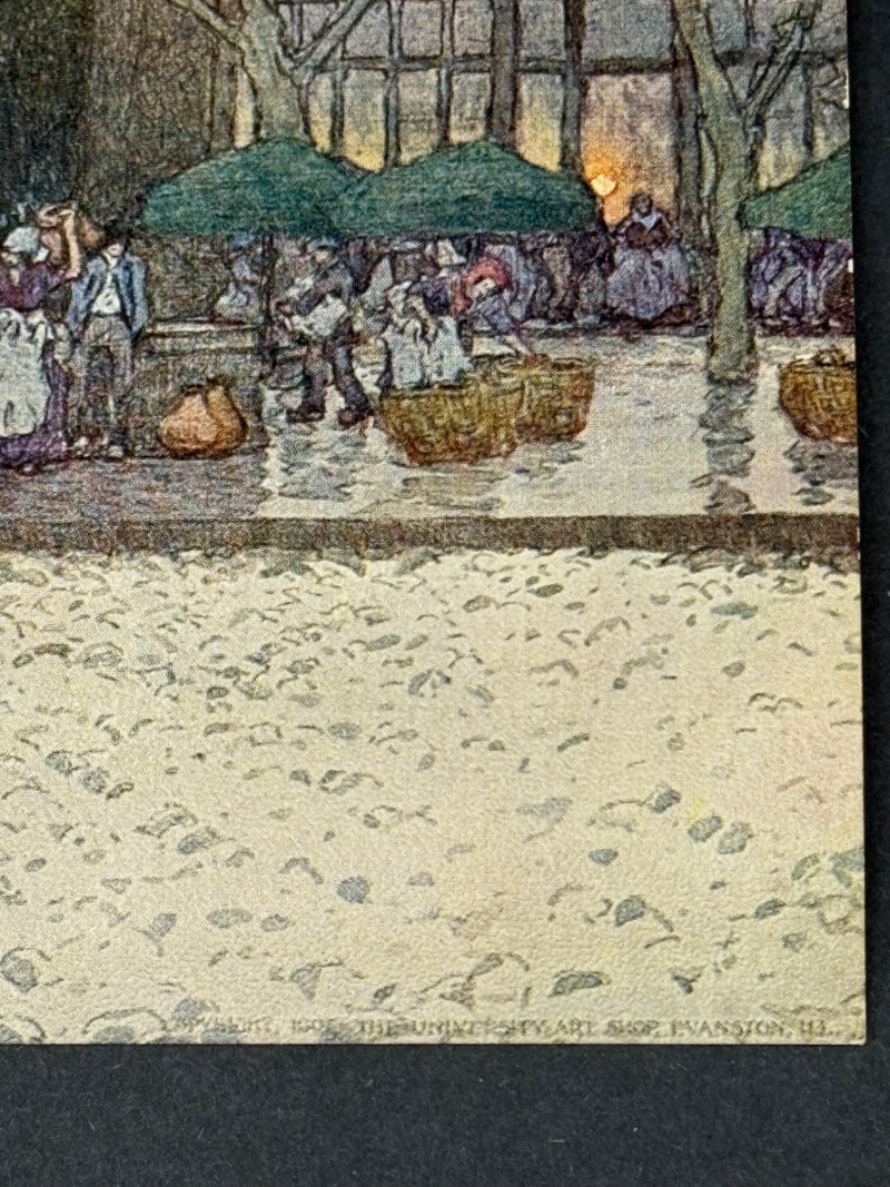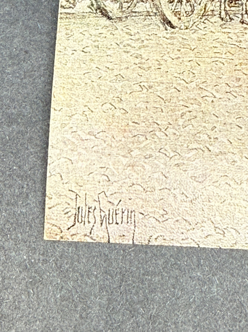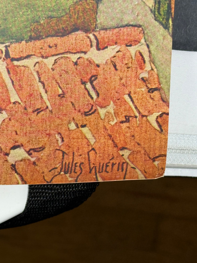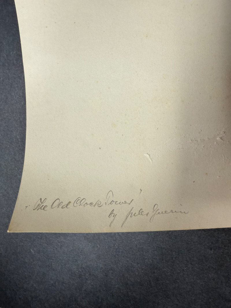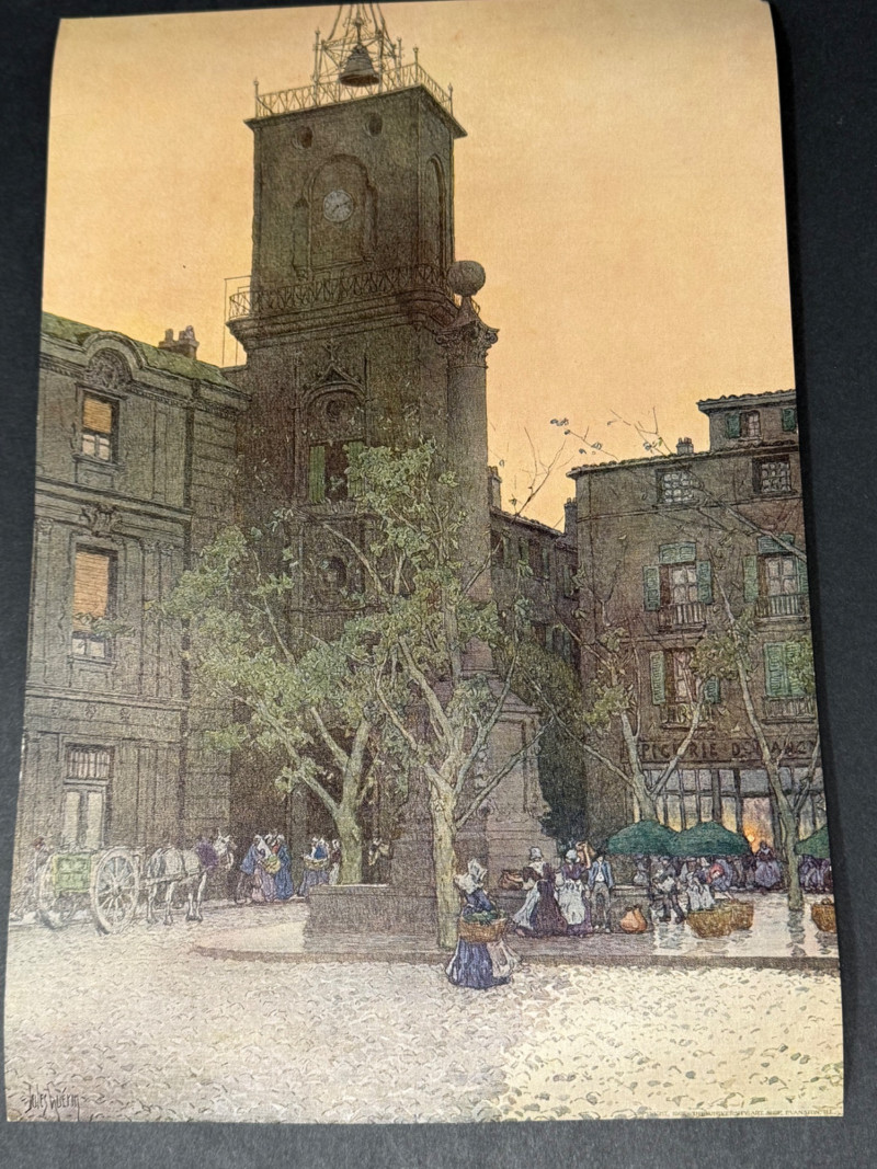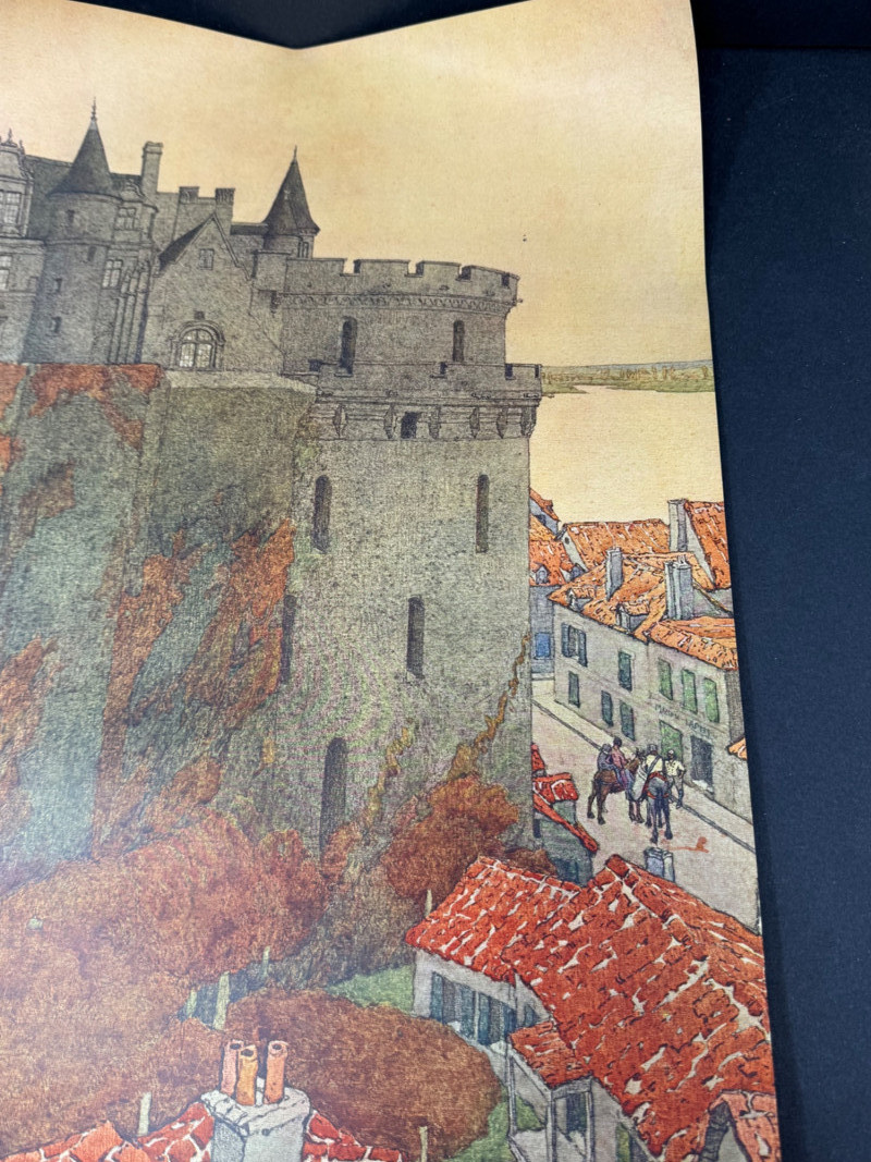 Pair of Jules Guérin Prints – Architectural & European Street Scenes – Early 20th Century Offered here is a pair of original color prints by renowned American artist Jules Guérin (1866–1946), celebrated for his architectural renderings and atmospheric cityscapes. Both works are finely detailed, with Guérin’s signature use of rich washes of color, precision linework, and tonal balance that evoke the romantic character of Europe. First Print: Market square scene featuring a tall clock tower, horse-drawn carriage, and bustling figures beneath trees and awnings. Second Print: Dramatic view of a hilltop château with stone towers, overlooking a town with red-tiled roofs and horsemen in the street below. Artist: Jules Guérin (signed in plate) These works exemplify Guérin’s mastery of architectural perspective and atmospheric illustration. He is widely known for his collaborations with Charles Moore on The Lincoln Memorial and his murals at the 1915 Panama-Pacific Exposition. Ideal for collectors of fine architectural art, early 20th century prints, or those seeking historic European views with timeless decorative appeal.