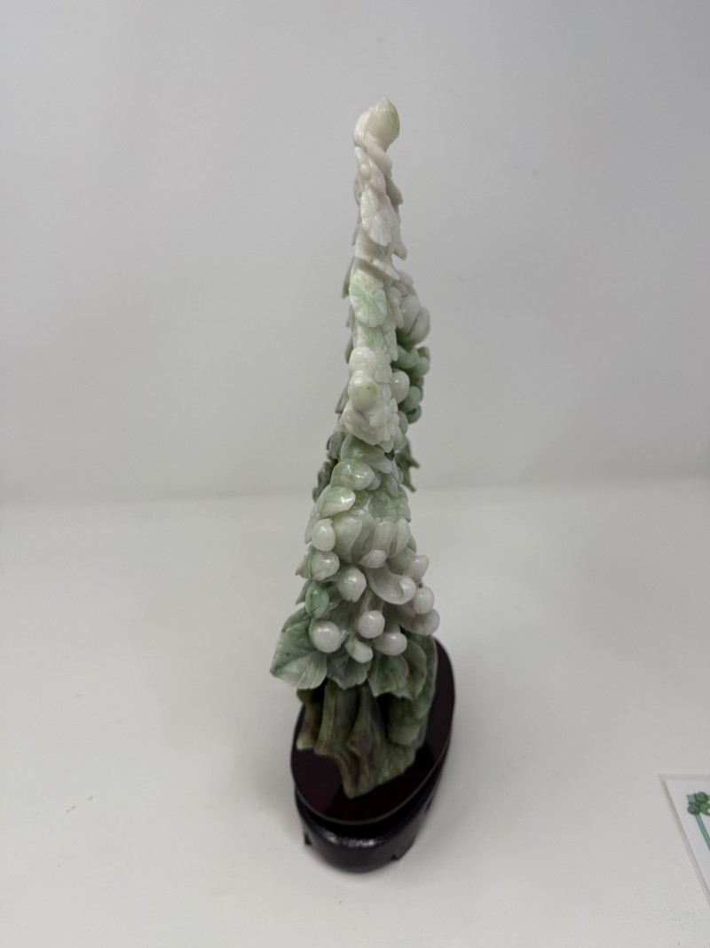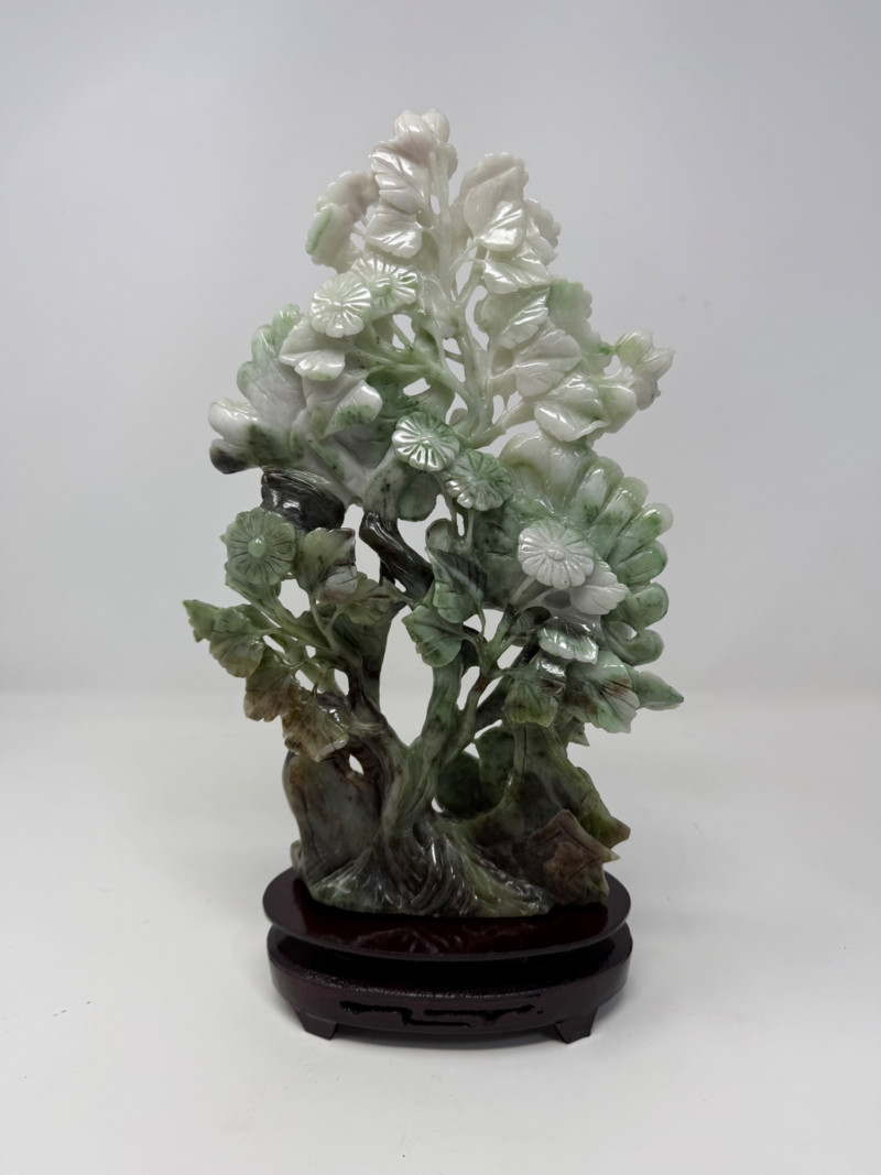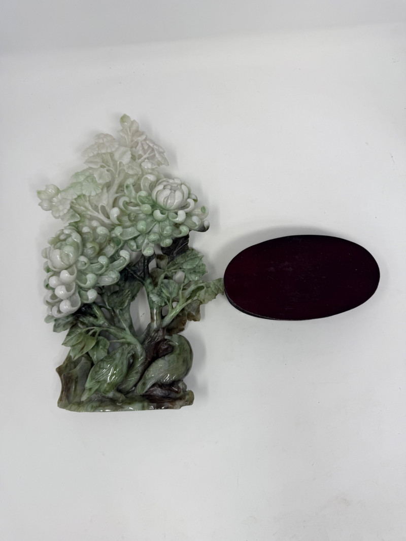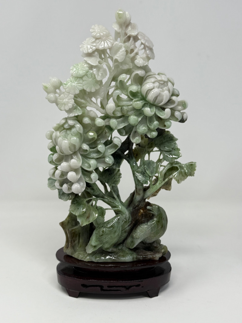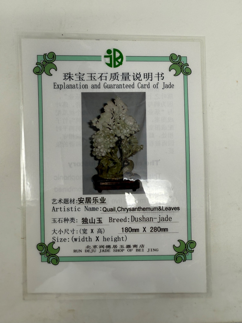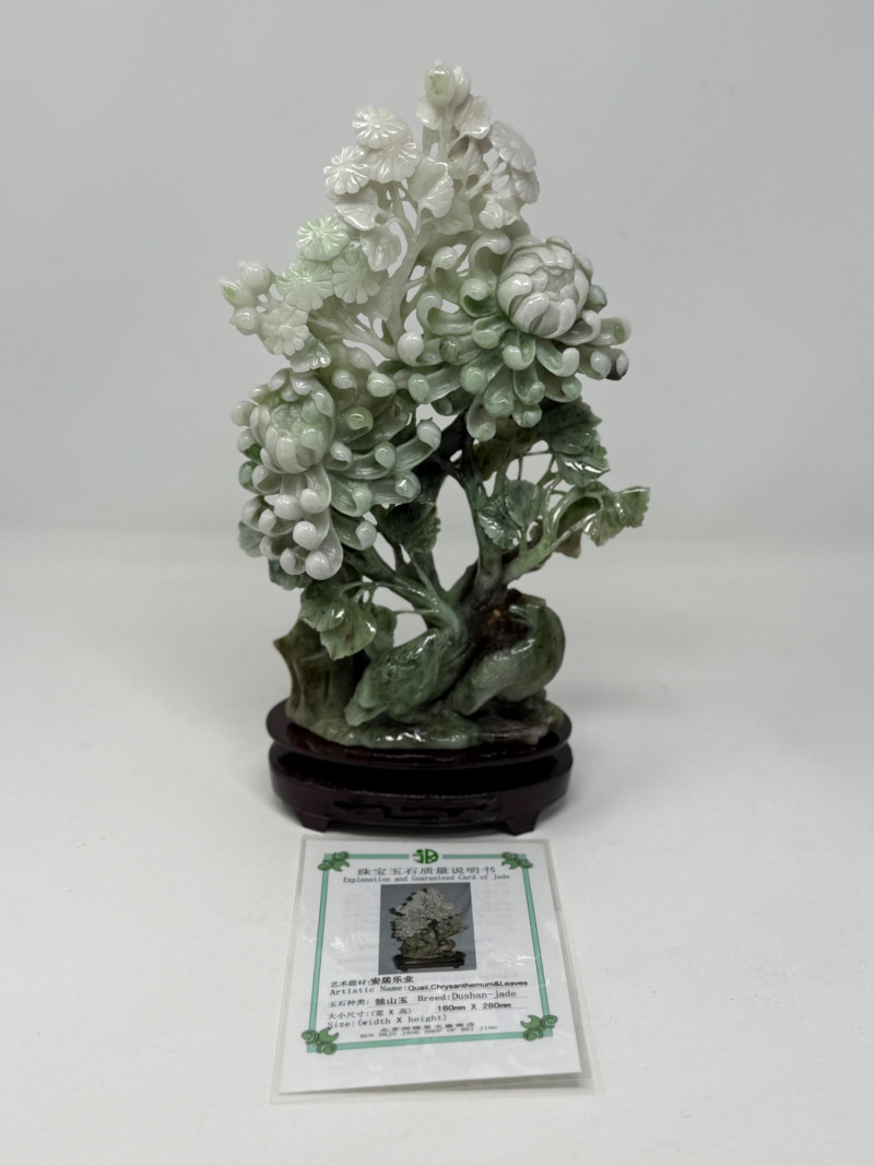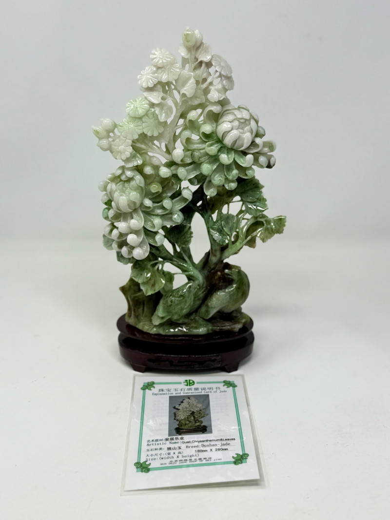 Chinese Carved Dushan Jade Sculpture – Chrysanthemum & Leaves – with Certificate Exquisite hand-carved jade sculpture depicting a lush bouquet of chrysanthemums and leaves, symbolizing longevity and nobility in Chinese culture. The piece is crafted from Dushan jade, known for its beautiful range of soft green to creamy white tones, and rests on a polished wooden stand. Material: Dushan jade Design: Chrysanthemum and foliage, finely detailed with layered petals and textured leaves Dimensions: Approx. (7" × 11") Stand: Included, dark wood base Documentation: Comes with original certificate of authenticity (as pictured) A striking decorative piece and collectible work of Chinese jade artistry, blending natural beauty with symbolic meaning. Perfect for display in a fine art, Asian décor, or jade collection.