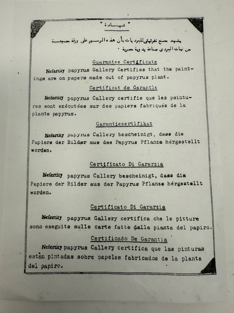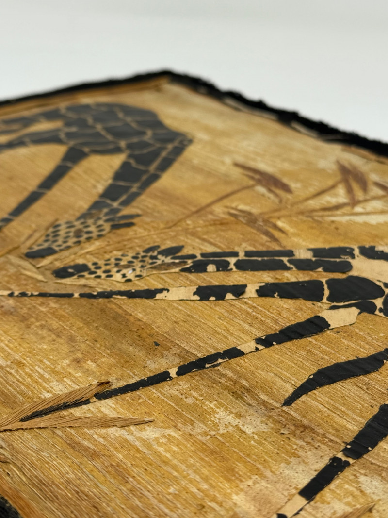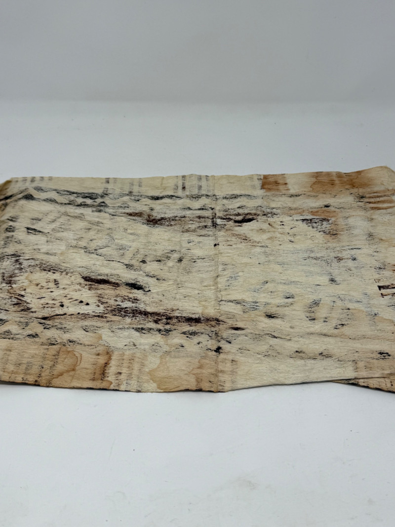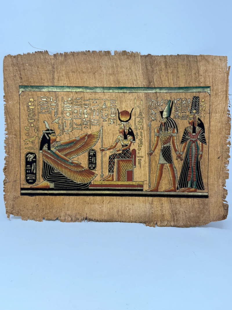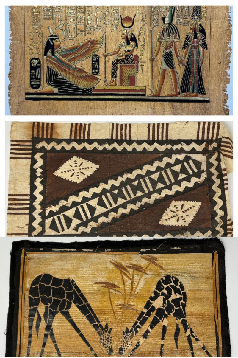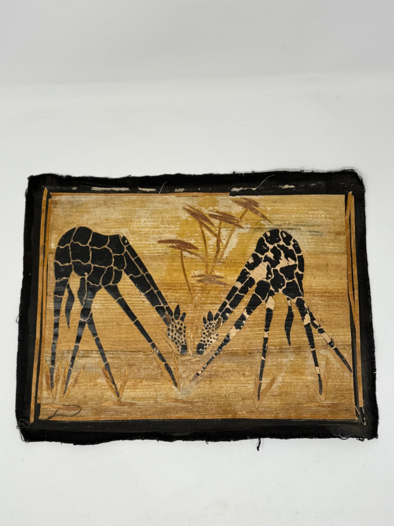 A unique trio of handcrafted artworks representing diverse cultural traditions from across the globe. Each piece is created on natural materials such as papyrus and barkcloth, highlighting the artistry and symbolism of its region. Egyptian Papyrus Painting – A traditional scene featuring gods and goddesses, hand-painted in vivid tones of gold, red, and black. Certified by the Nefertiti Papyrus Gallery, with original certificate included. Approx. 14" × 10". Polynesian Tapa Bark Cloth – A hand-crafted textile made from mulberry bark, decorated with bold geometric tribal patterns in earthy browns and blacks. Approx. 16.5" × 11.5". African Papyrus Artwork – A wildlife depiction of two giraffes grazing among tall grasses, hand-painted in black and natural tones. Approx. 15" × 11". Materials: Papyrus and barkcloth with natural pigments and hand-painted details This lot offers a cross-cultural collection of authentic folk and traditional artworks—ideal for collectors of world art, interior decorators, or those seeking distinctive cultural conversation pieces.Collection of World Cultural Artworks on Handmade Papyrus & Barkcloth