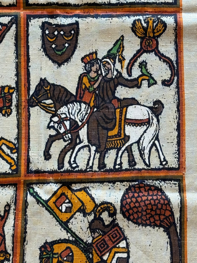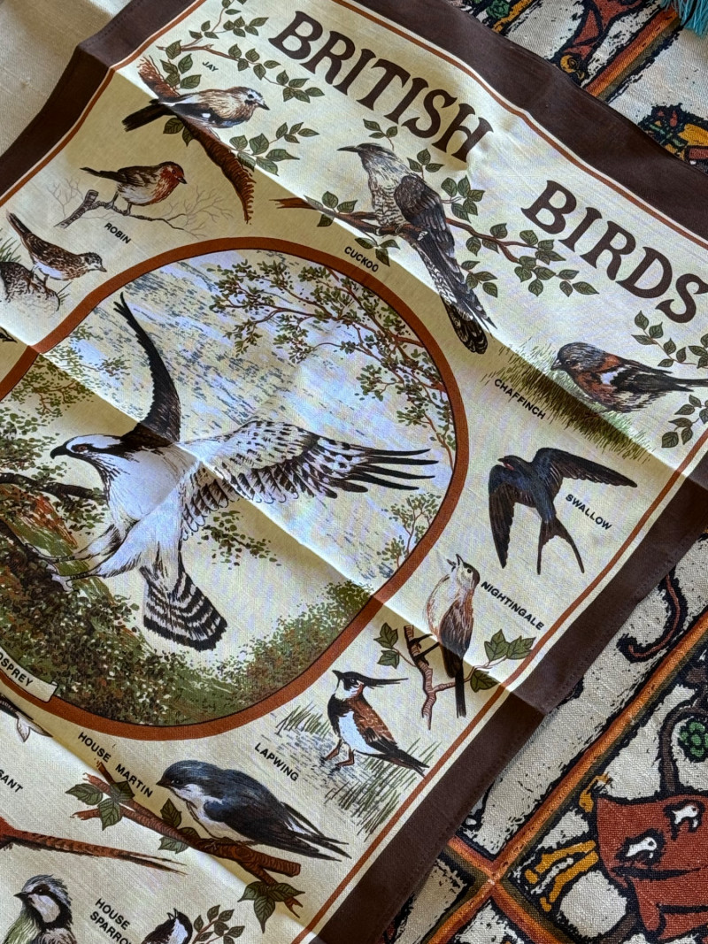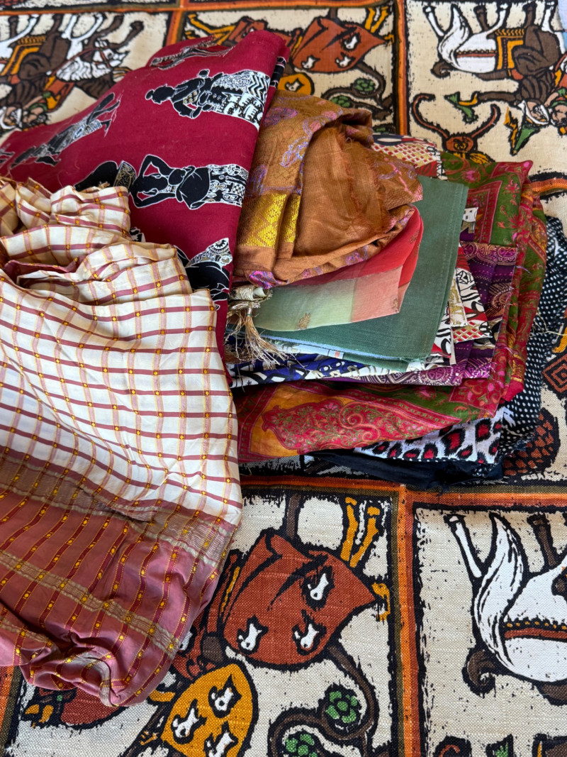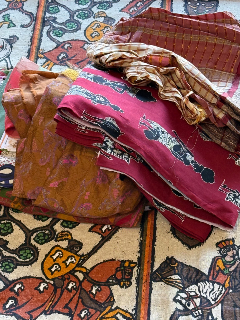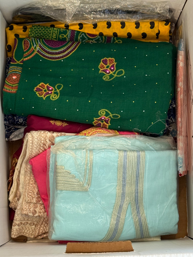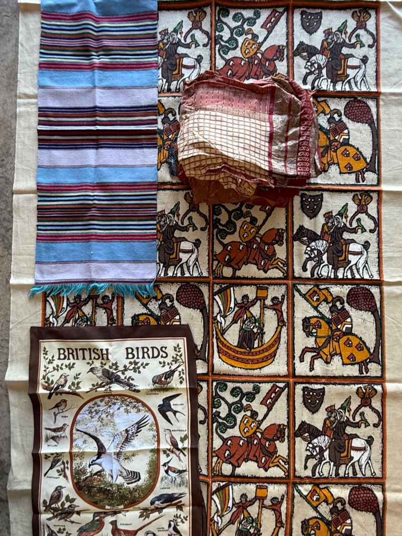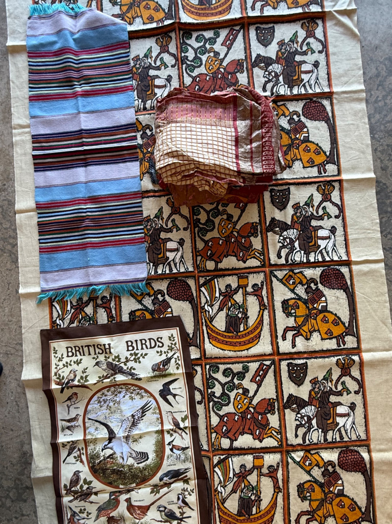 This eclectic collection of fabrics and textiles brings together a diverse mix of global influences, perfect for collectors, crafters, or decorators looking for unique material. Textiles & Scarves: Includes a striped cotton scarf in blue tones, a woven checked silk-like fabric in burgundy and gold, and additional assorted scarves. Wall Hangings & Decorative Panels: Medieval knight-themed printed textile panel, a vintage “British Birds”illustrated cotton tea towel, and various patterned cloths suitable for framing, display, or repurposing. Mystery Fabric Box: A box filled with assorted fabrics of various origins and materials, including embroidered green textile with jewel-like embellishments, pastel blue fabric with decorative trim, vibrant pinks, yellows, and patterned pieces. Several items appear to be of South Asian origin, possibly sari or traditional dress materials. Dimensions: Vary per piece (scarves approx. 60" L; tea towel approx. 18" x 28"; large fabric panels and folded yardage included). Notes: A unique opportunity to acquire a mixed collection of global fabrics and textiles—ideal for resale, sewing projects, or creative repurposing.Assorted Vintage & Global Textiles – Scarves, Tapestries, and Fabrics