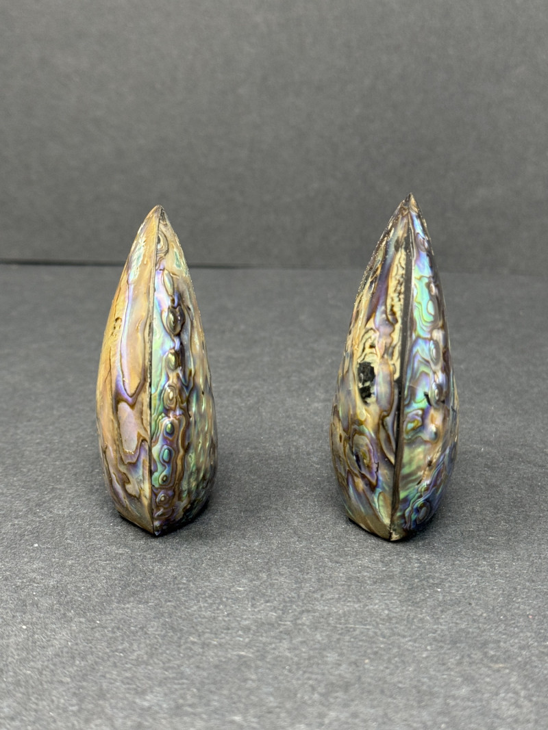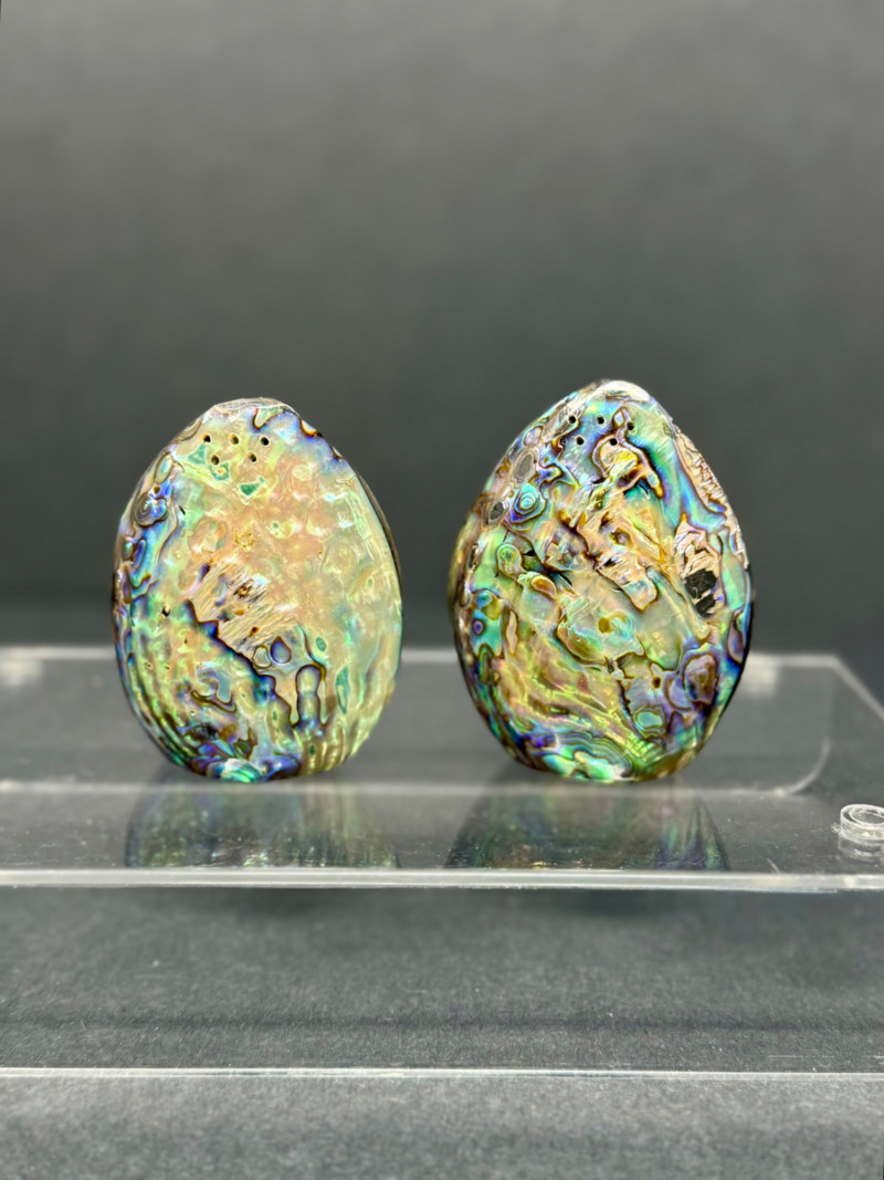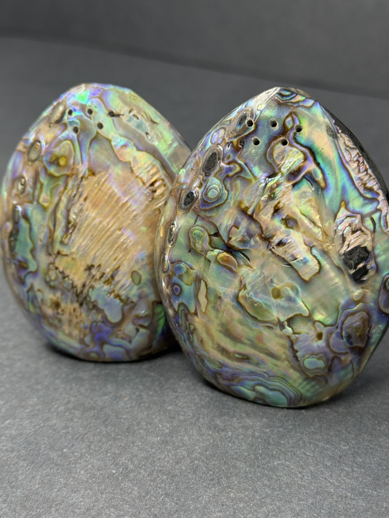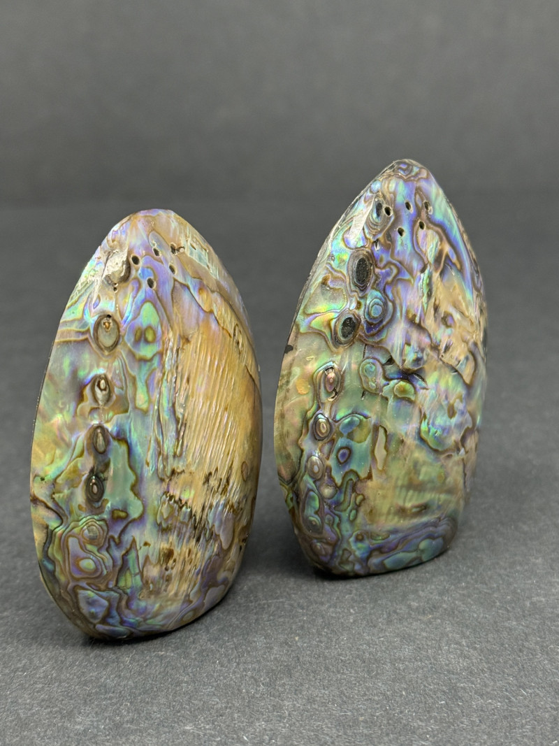 1960s Mother of Pearl Salt & Pepper Shakers – Iridescent Abalone Finish A vintage pair of salt and pepper shakers crafted in the 1960s with a stunning mother of pearl (abalone) finish. These oval-shaped shakers feature a highly iridescent surface with natural tones of blue, green, and violet, reflecting the beauty of abalone shellwork from the mid-century era. Brand/Style: 1960s Mother of Pearl Notes: A rare and collectible set — functional as salt and pepper shakers, but also a striking decorative accent for mid-century or coastal-inspired décor.