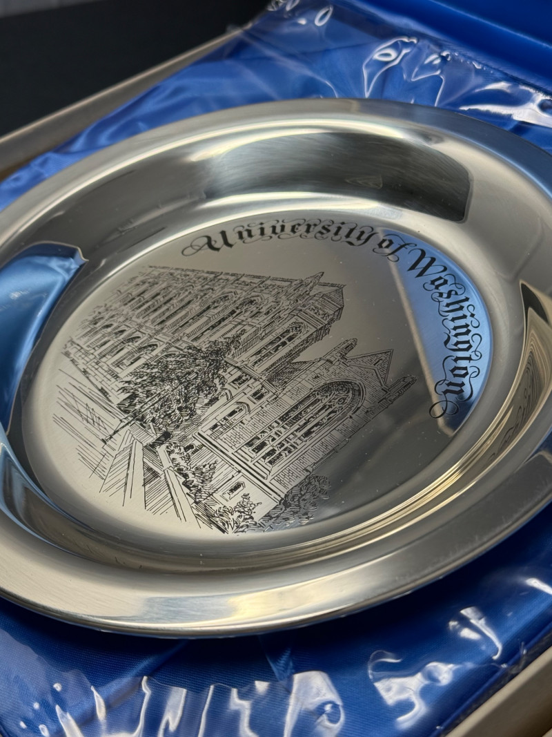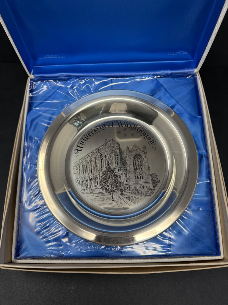 University of Washington Sterling Silver Commemorative Plate – Suzzallo Library – Limited Edition Beautifully crafted sterling silver commemorative plate, featuring a detailed engraved depiction of the Suzzallo Library at the University of Washington. This limited-edition piece was produced as part of a collector’s series and comes in its original presentation box with satin lining. Maker: The Franklin Mint (noted inside box) Notes: A collectible heirloom-quality piece celebrating one of Seattle’s most iconic landmarks. Perfect for alumni, collectors of sterling silver, or admirers of architectural history.