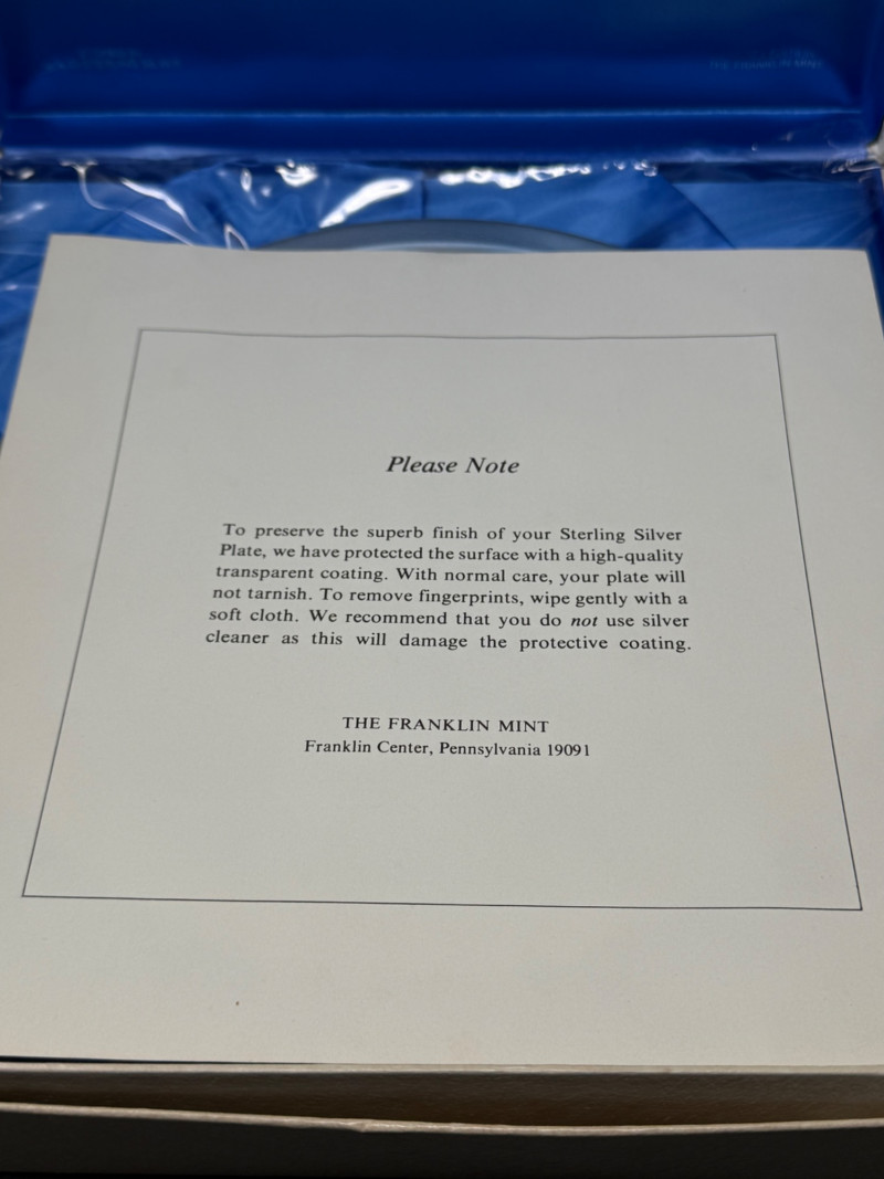 Condition: Excellent vintage condition; plate remains bright with fine engraving detail. Box shows light shelf wear from storage.