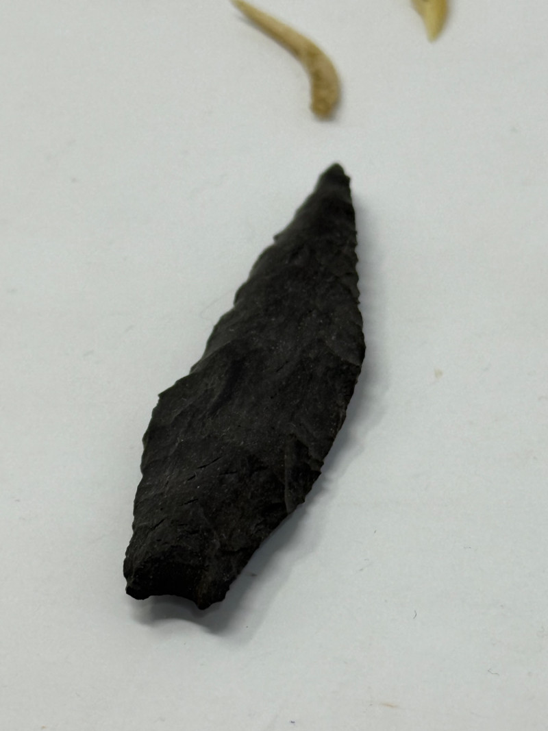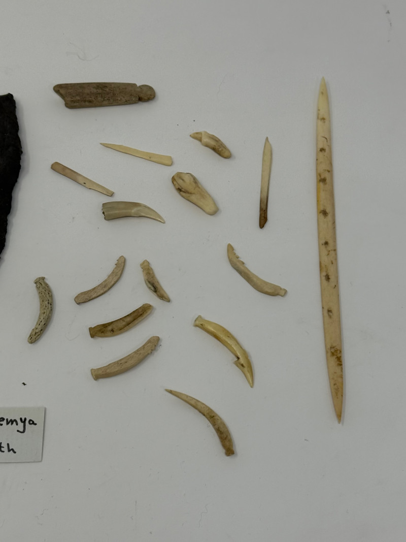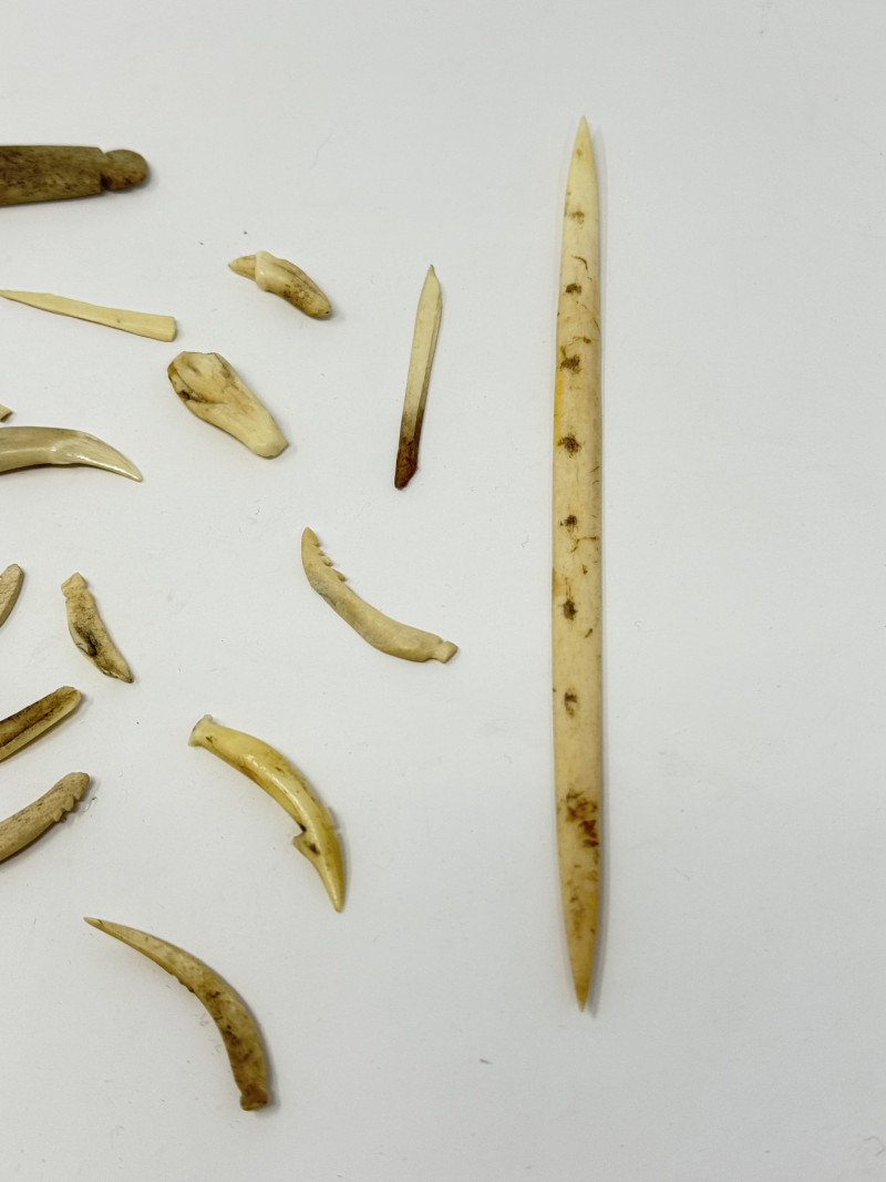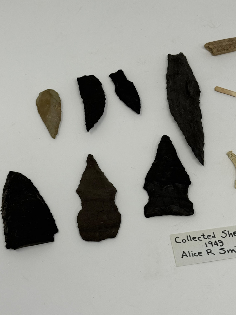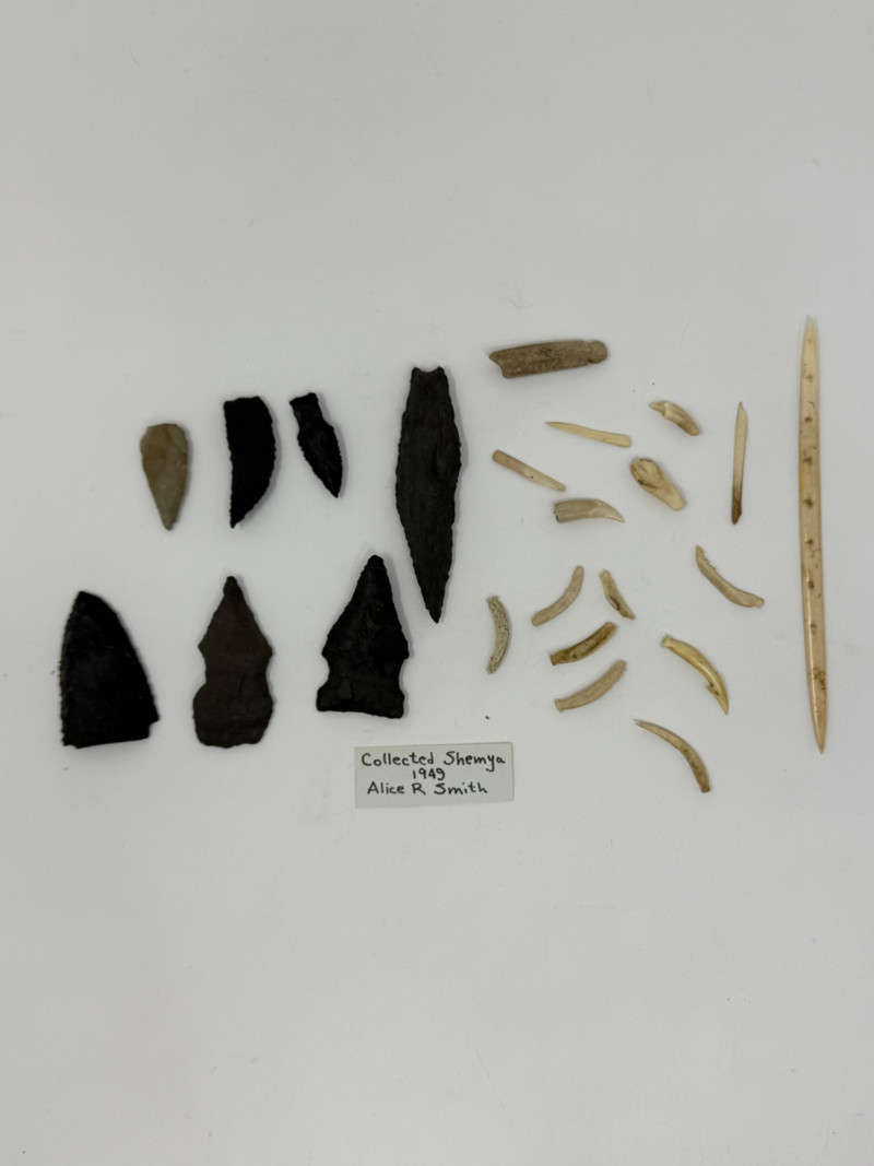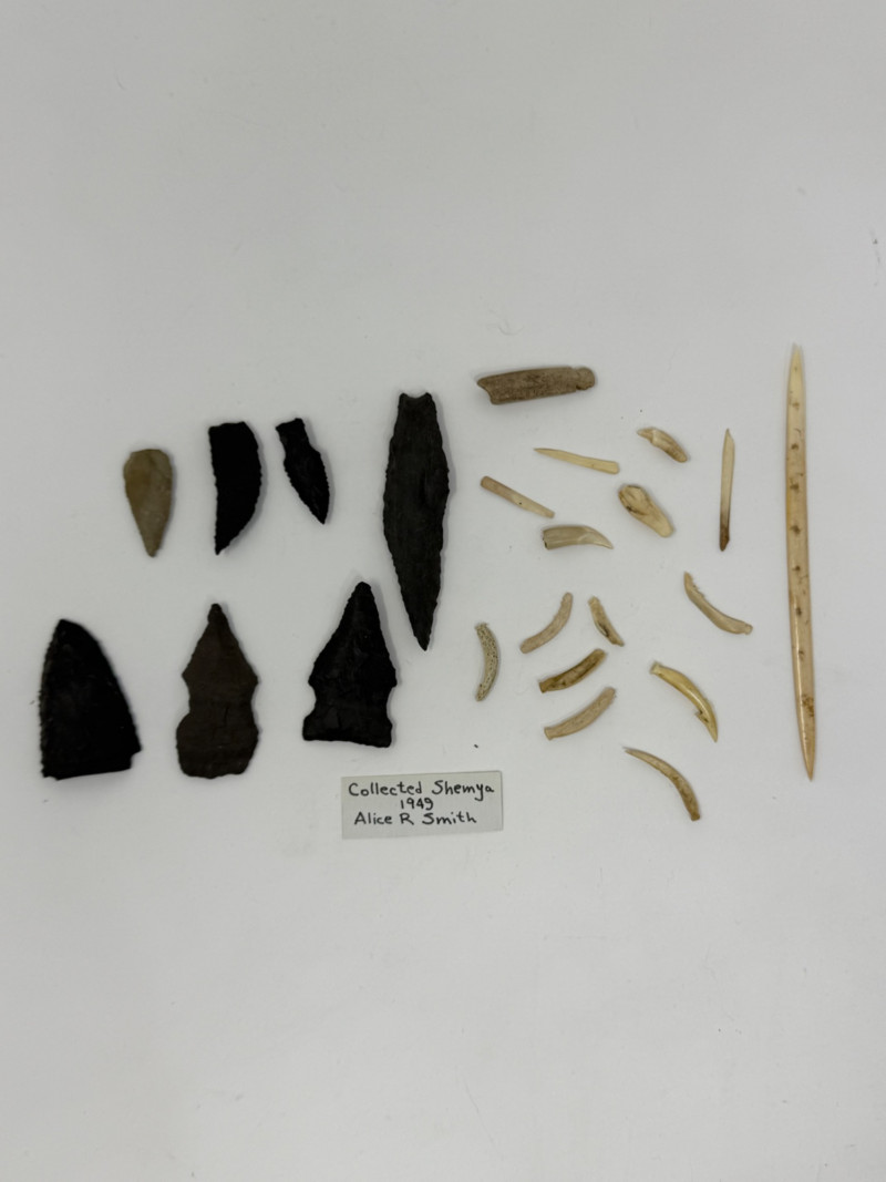 Mid-Century Collected Study Set – Obsidian & Bone Fragments (Shemya Island, 1949) A fascinating small study collection of stone and bone fragments, gathered in 1949 on Shemya Island, Alaska by Alice R. Smith (documented by original handwritten note included). Contents include: Obsidian and stone fragments, some worked into sharp-edged points Carved and polished bone pieces in assorted sizes, likely used for practical or decorative purposes Natural bone and tooth fragments with rich aged patina Provenance: Collected Shemya Island, 1949 (noted by Alice R. Smith) Notes: This collection was assembled as part of mid-century field interest in geology and natural history. Presented together, they serve as an excellent study group or display set for enthusiasts of natural materials and early collecting practices.