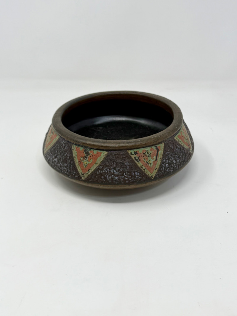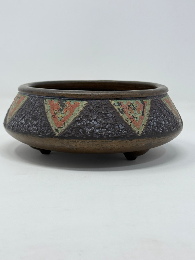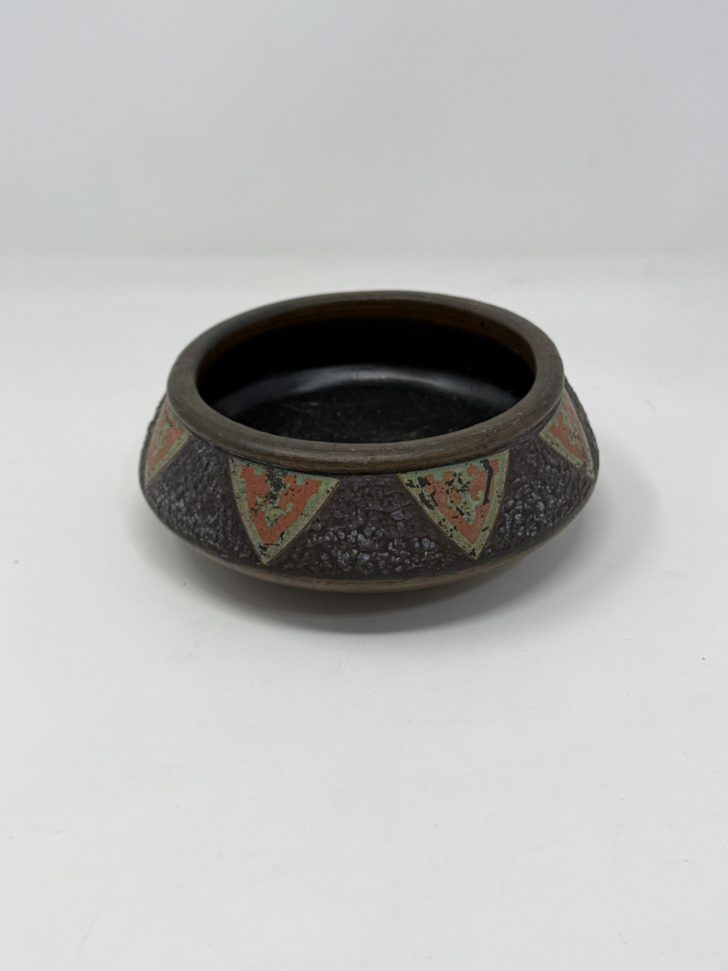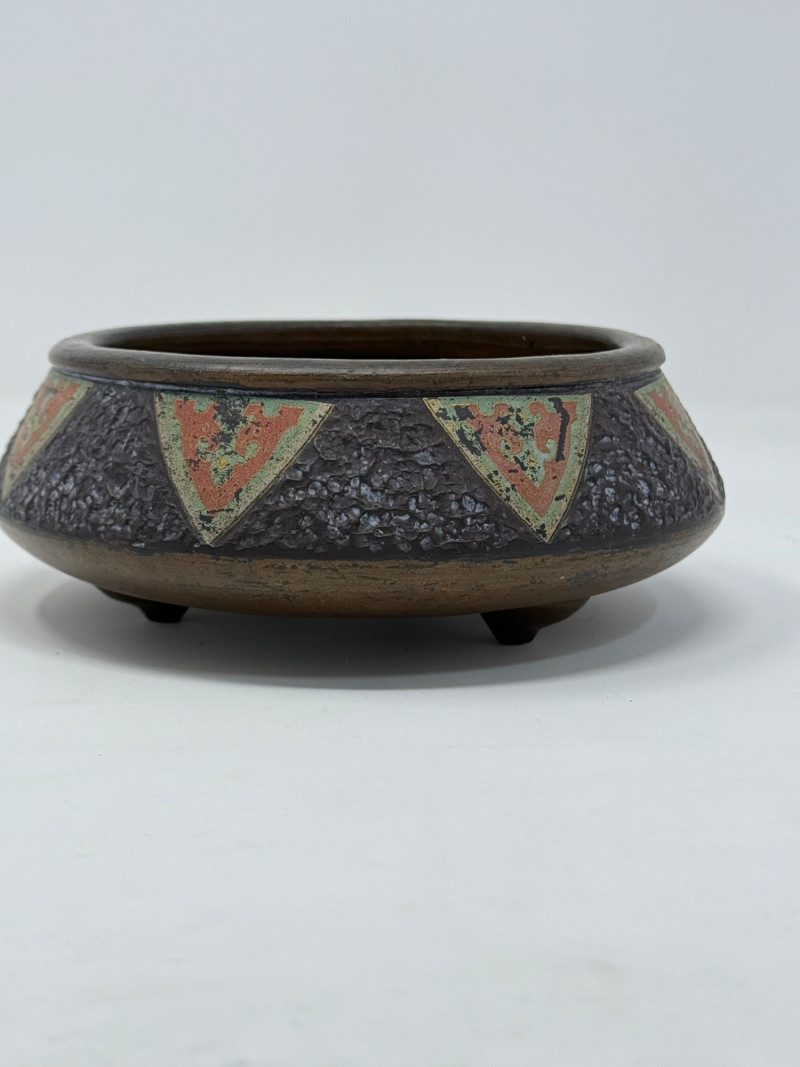 This vintage mid-century pottery planter is marked Made in Japan on the base, dating it to the post-war export era (circa 1950s–1960s). The footed bowl features a textured surface with a triangular geometric motif in orange and green, giving it a bold and decorative style. Its low, wide form makes it versatile as a bonsai pot, planter, or centerpiece.