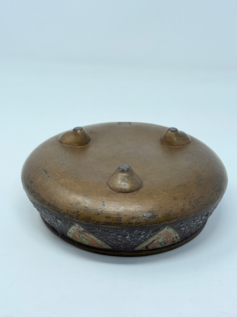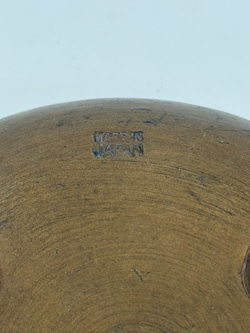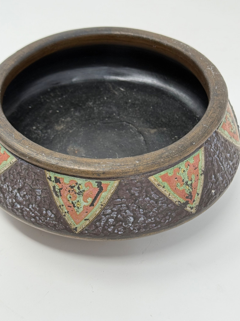 Mid-Century Japanese Pottery Planter – Made in Japan – Footed Bowl with Geometric Design Maker: Japanese pottery (marked Made in Japan) Era: Mid-Century, 1950s–1960s Material: Ceramic with painted geometric decoration Design: Textured body with repeating triangular patterns, footed base Dimensions: Approx. 3–4" tall x 6–7" diameter Condition: Great vintage condition with light wear consistent with age A collectible piece of mid-century Japanese ceramics, perfect for display or practical use.