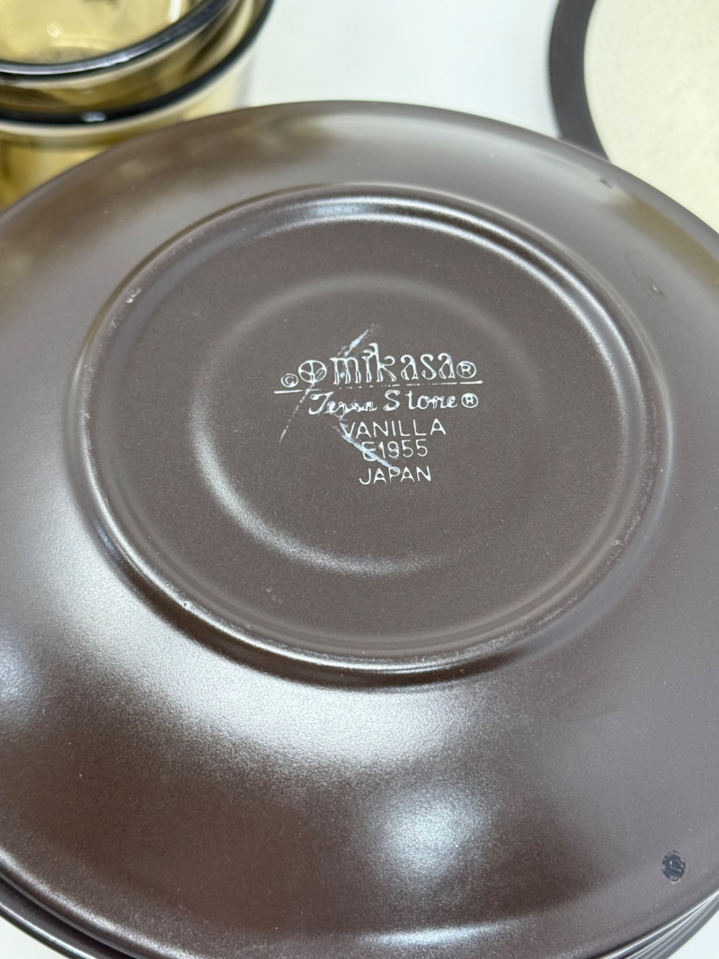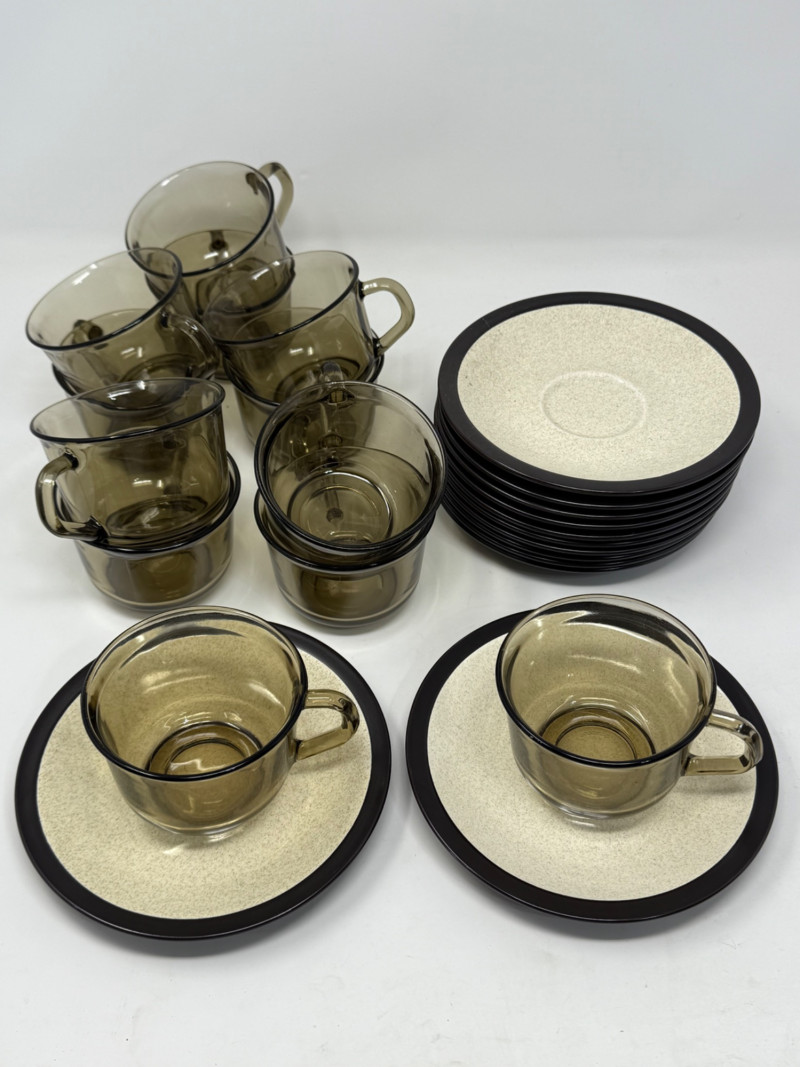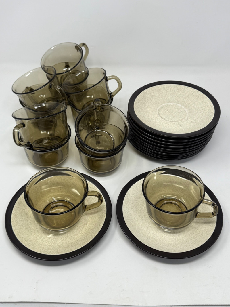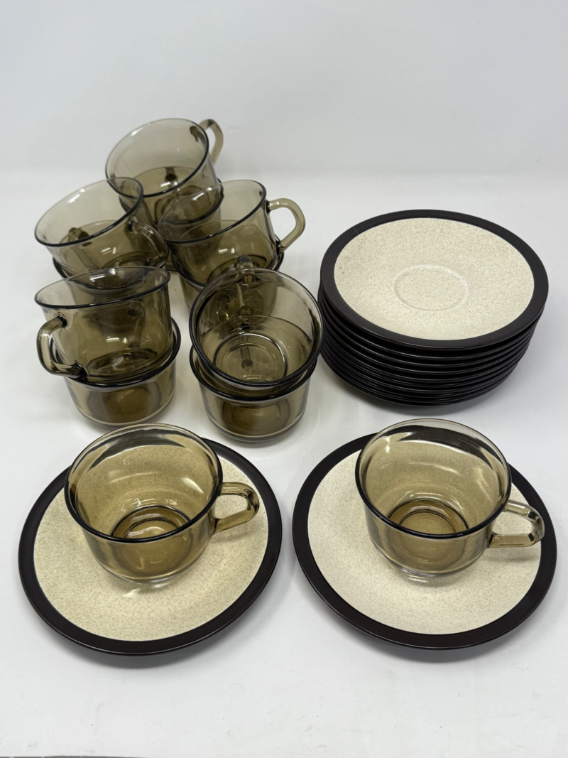 Vintage Mikasa Terra Stone "Vanilla" Tea Cups & Saucers – Japan, 1970s Details: Brand: Mikasa, Terra Stone Collection Pattern: Vanilla (E1955) Origin: Japan, circa 1970s Material: Amber glass cups with stoneware saucers Includes: Matching set of 12 cups and saucers Style: Mid-Century Modern, Retro Japanese Stoneware Historical Note: