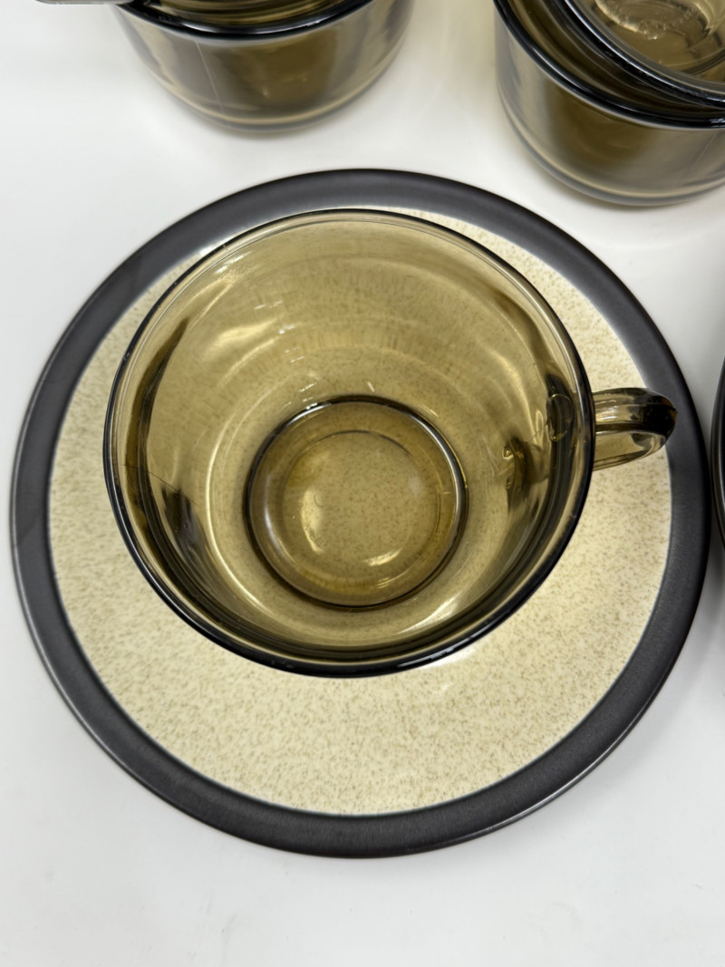 A beautiful mid-century set from Mikasa’s Terra Stone collection in the discontinued Vanilla (E1955) pattern. The set features smoky amber glass tea cups paired with stoneware saucers in a speckled cream with chocolate-brown rims. The combination of glass and stoneware creates a striking modern contrast, perfect for both display and use.