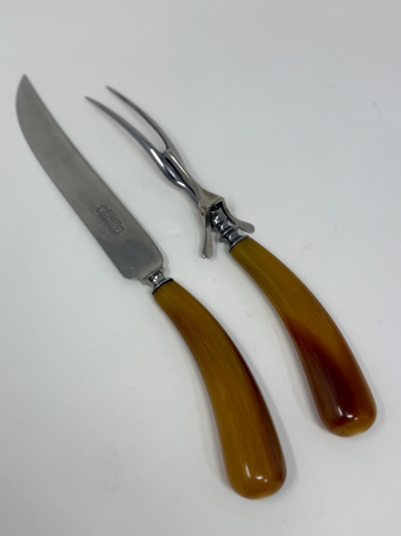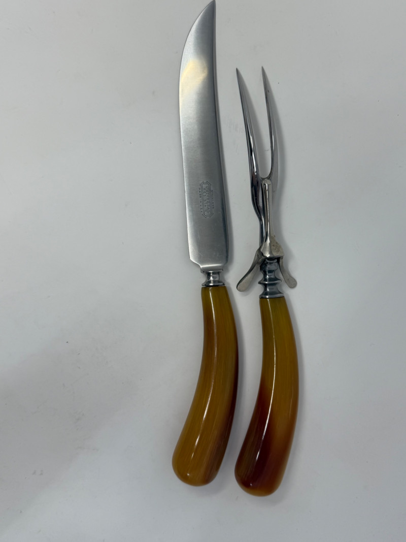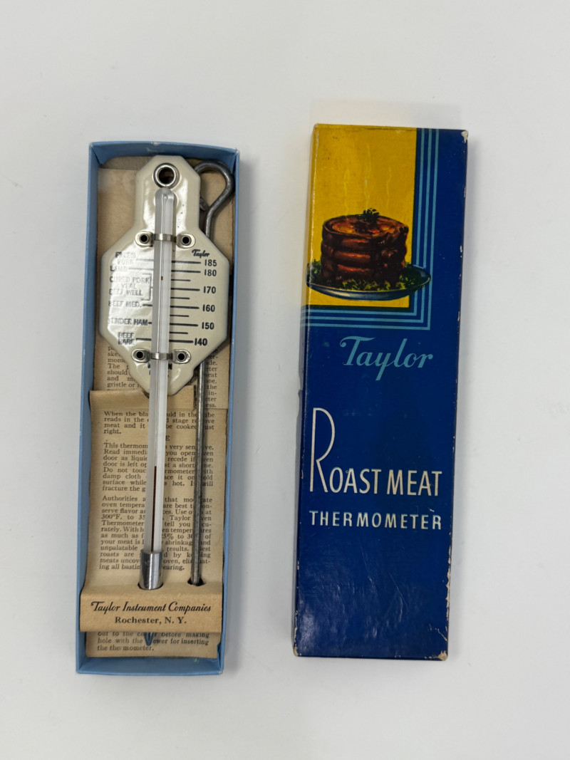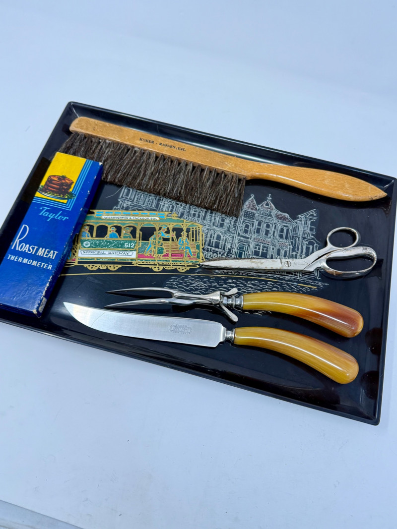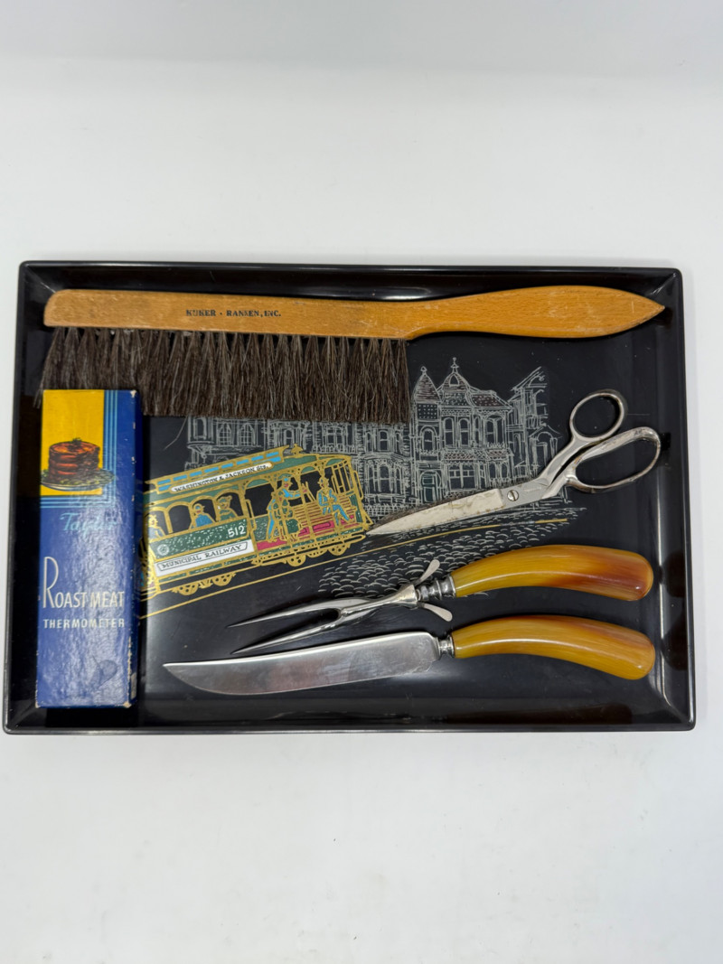Vintage Mixed Lot – Carving Set, Thermometer, Brush & Couroc Tray Includes: Taylor Roast Meat Thermometer – Mid-century boxed thermometer, a staple in retro kitchens. Carving Knife & Fork Set – Faux horn handles, stainless blades, classic mid-century dinner service. Metal Utility Shears – Heavy-duty vintage scissors with authentic patina. Kuner-Raasch Inc. Horsehair Brush – Wooden handle with original maker’s stamp. Couroc of Monterey Tray – 1970s black resin tray featuring San Francisco’s iconic cable car, hand-inlaid with metallic detailing. Era: 1950s–1970s Historical Note: