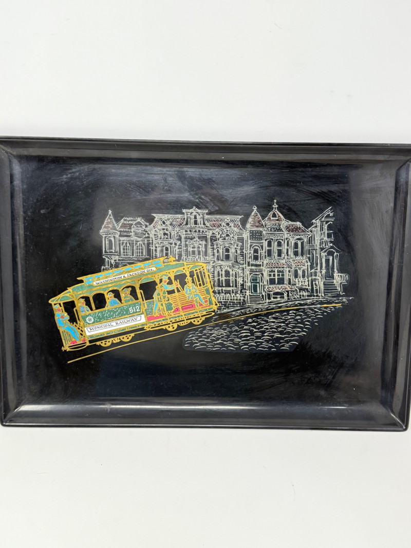 Couroc trays were made in Monterey, California, from the 1950s through the 1990s, prized for their durability and inlaid artistry. This cable car design is one of their most collectible pieces, celebrating the cultural icon of San Francisco. Together with the other vintage tools and utensils, this lot showcases the craftsmanship and domestic lifestyle of post-war America.