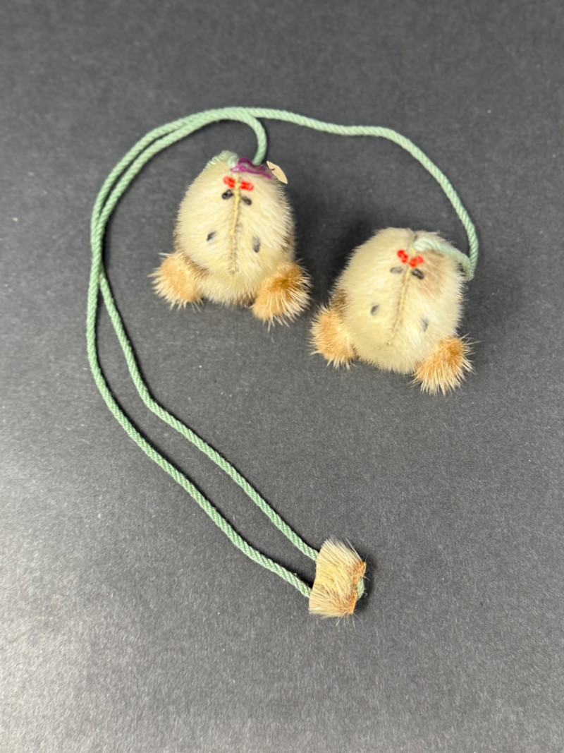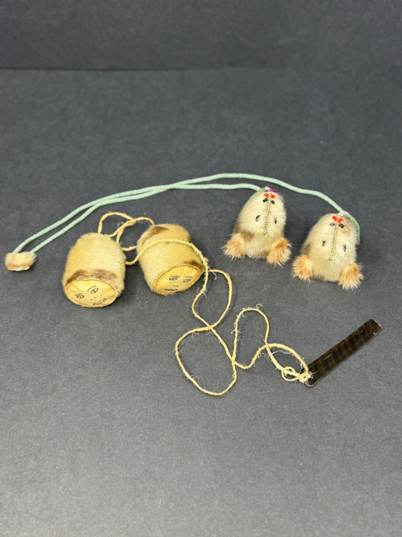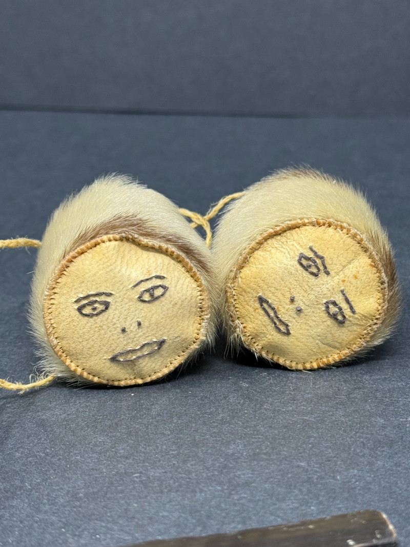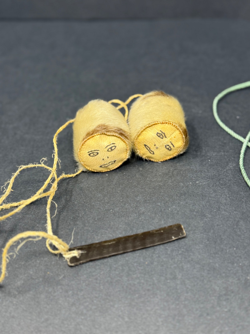 Vintage Eskimo Yo-Yo (Alaska Native Toy) – Sitka Arts & Crafts – Mid-20th Century Maker: Sitka Arts & Crafts, Alaska Era: Mid-20th Century (circa 1950s–1970s) Material: Fur, string, and fiberboard bases with drawn faces Size Range: Each ball approx. 2" diameter; string length approx. 18–20" Provenance: Includes original instruction sheet with hand-drawn graphics and artisan signatures Historical Note: