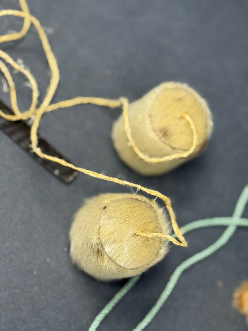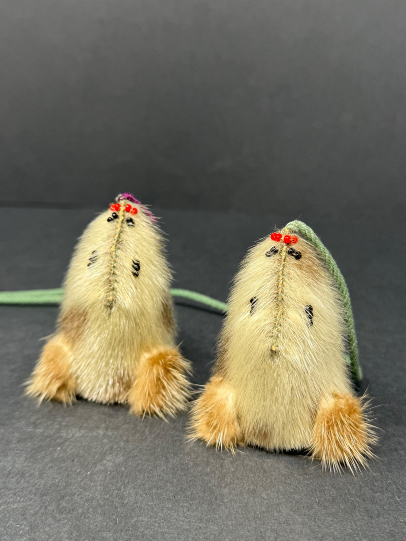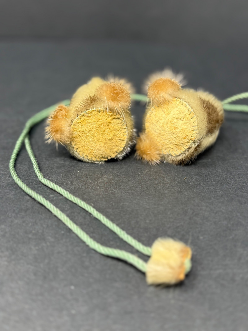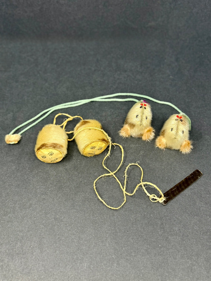 Vintage Eskimo Yo-Yo (Alaska Native Toy) – Sitka Arts & Crafts – Mid-20th Century Maker: Sitka Arts & Crafts, Alaska Era: Mid-20th Century (circa 1950s–1970s) Material: Fur, string, and fiberboard bases with drawn faces Size Range: Each ball approx. 2" diameter; string length approx. 18–20" Provenance: Includes original instruction sheet with hand-drawn graphics and artisan signatures Historical Note: