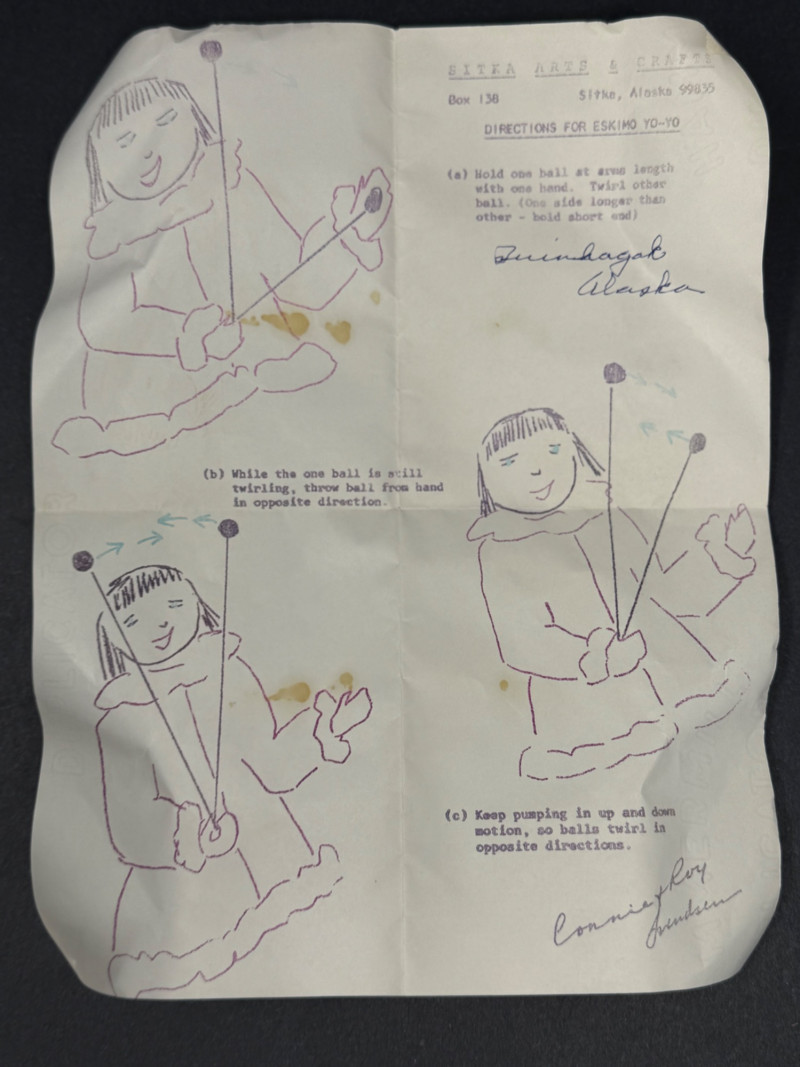 A traditional Eskimo yo-yo, hand-crafted from fur and string, with two weighted fur balls attached to cords for play. This unique Alaskan toy was made by Sitka Arts & Crafts (Sitka, Alaska) and comes with its original printed instruction sheet. The instruction sheet includes hand-drawn illustrations and handwritten location notes (Quinhagak, Alaska), providing cultural and regional provenance.