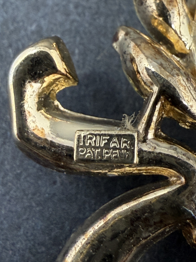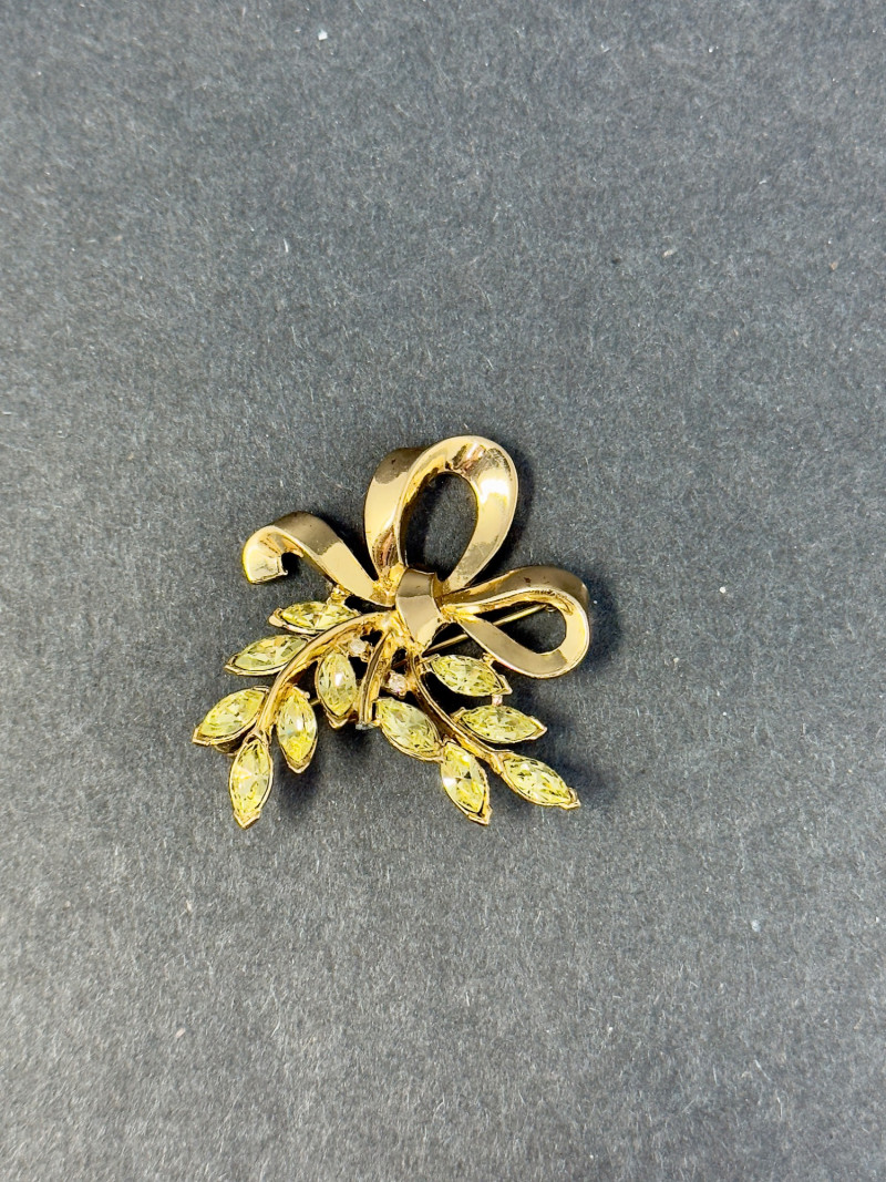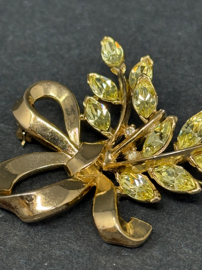 Vintage 1960s Trifari Rhinestone Bow & Laurel Brooch – Gold-Tone with Citrine Crystals This elegant mid-century brooch by Trifari, one of the most iconic American costume jewelry houses, features a flowing bow with laurel leaf detail. Maker: Trifari Era: 1960s Design: Sculpted bow motif with cascading laurel leaves Stones: Marquise-cut rhinestones in citrine-yellow, prong-set for brilliance Material: Gold-tone metal with crystal rhinestones Size: Approx. 2.25" tall x 2" wide Why It’s Special: Trifari was known for its exquisite craftsmanship and timeless designs, often worn by Hollywood stars and society women. This brooch showcases the brand’s signature quality and glamorous mid-century aesthetic, making it both a wearable accessory and a collector’s treasure.