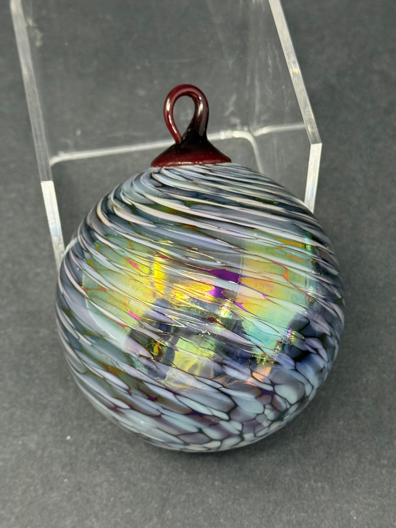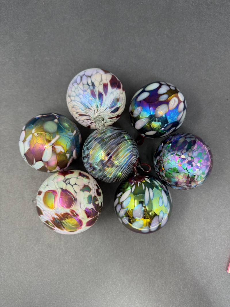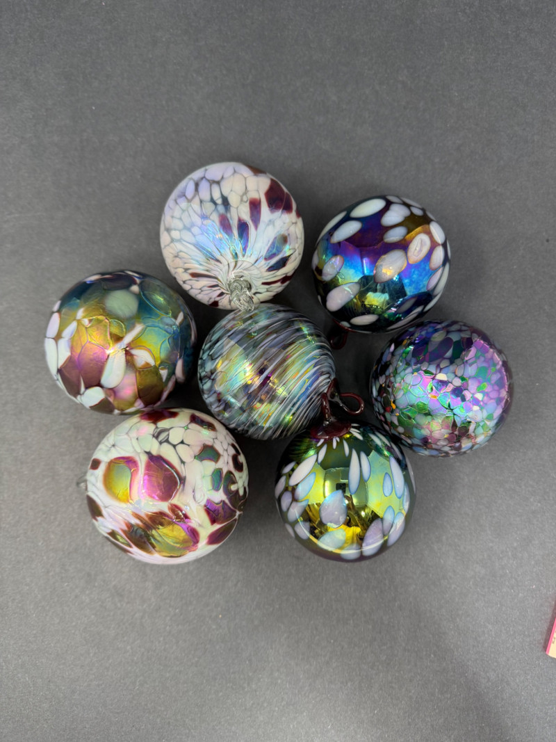 A vibrant collection of 7 vintage Friendship hand-blown swirl glass ornaments, also known as witch balls, crafted in the 1960s–1970s. Each ornament features a luminous iridescent finish with multicolored swirls, feathered white spotting, and rich jewel tones that shift beautifully in the light. Designed with traditional blown-glass hanging loops, these pieces embody both artistry and folklore.