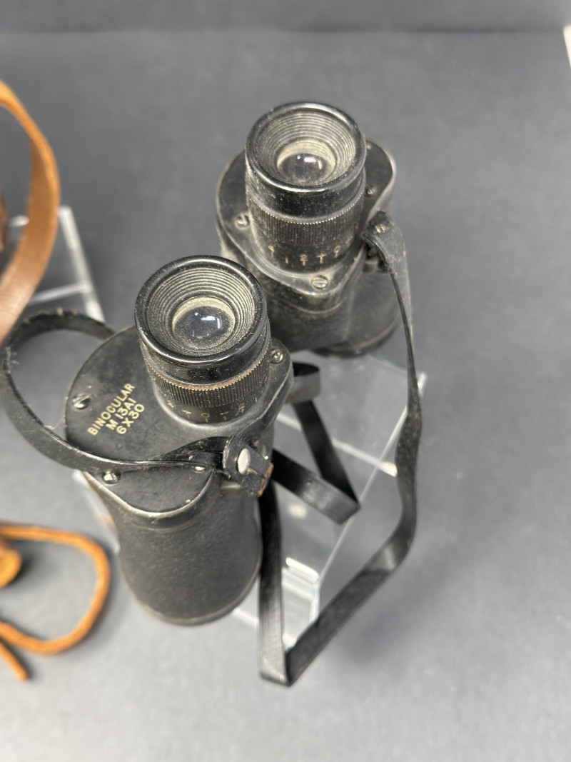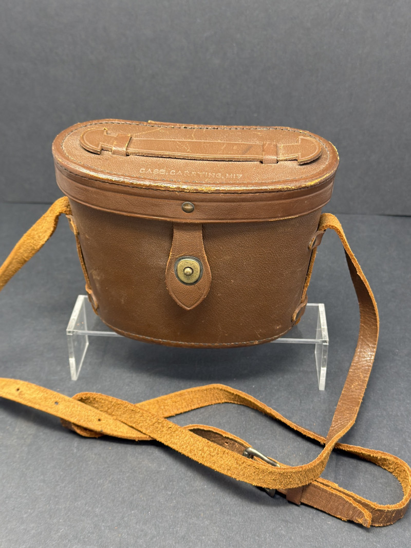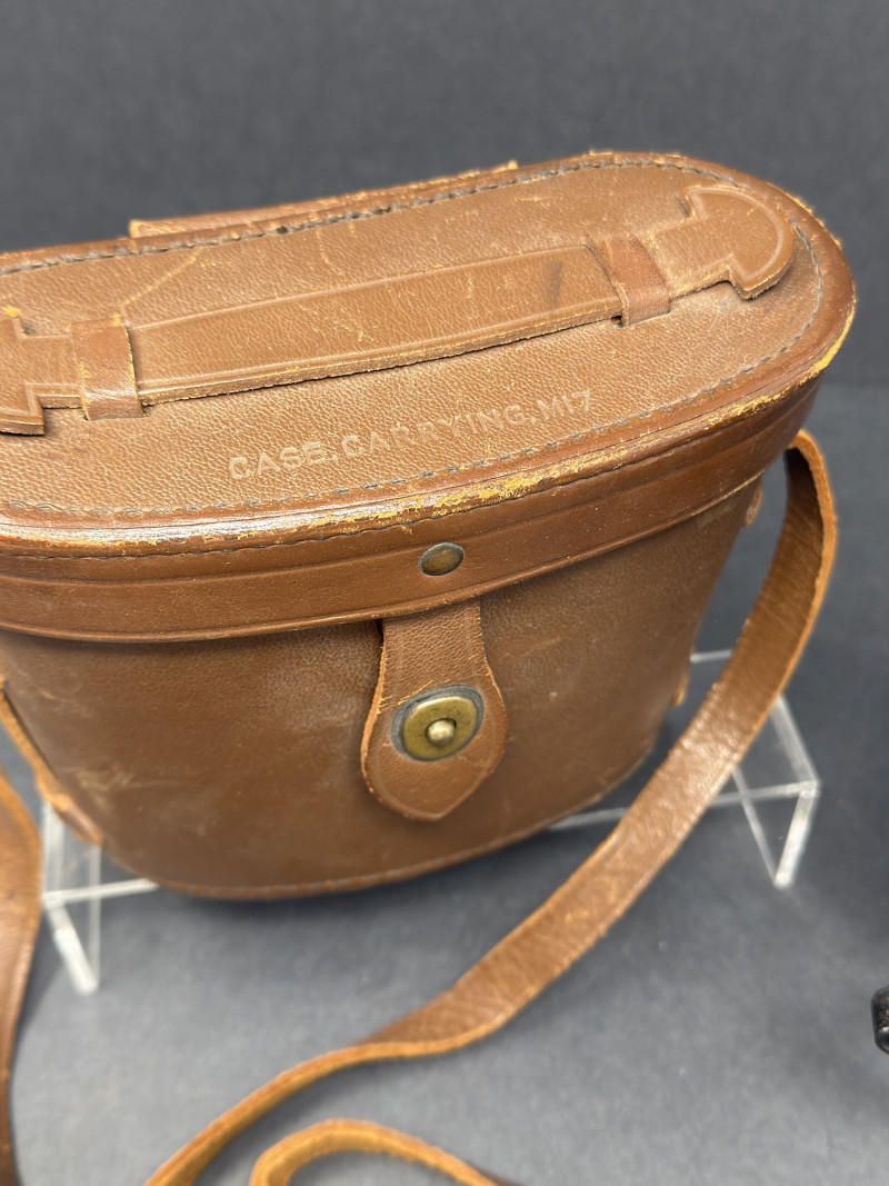 Vintage Military Binoculars with Leather Case – U.S. Army M13 6x30 – Circa WWII A classic set of M13 6x30 U.S. Army military binoculars, complete with the original Carrying Case M17 in brown leather. These field binoculars were standard issue during the WWII era, prized for their durability and sharp optics in combat and reconnaissance use. Maker/Model: U.S. Army M13 Binoculars Magnification: 6x30 Case: Original leather Carrying Case M17, with strap and secure closure Era: Circa 1940s (WWII military issue) Condition: Binoculars show wear consistent with military use but remain intact with clear optics. Case retains stitching and hardware, with some scuffs/patina appropriate for age. Why it’s special: These binoculars are a piece of U.S. military history, carried by soldiers during WWII. Collectors and history enthusiasts value them for both their functional quality and their role in wartime service. 📏 Dimensions: Binoculars approx. 6" wide x 4" tall Case approx. 7" x 5"