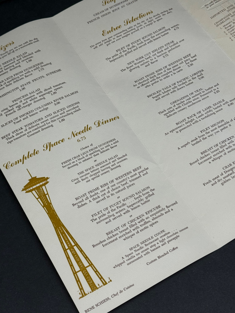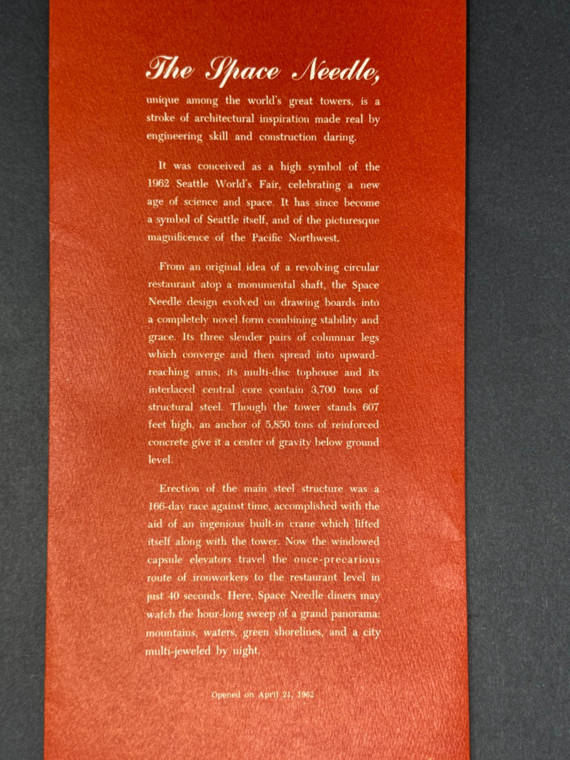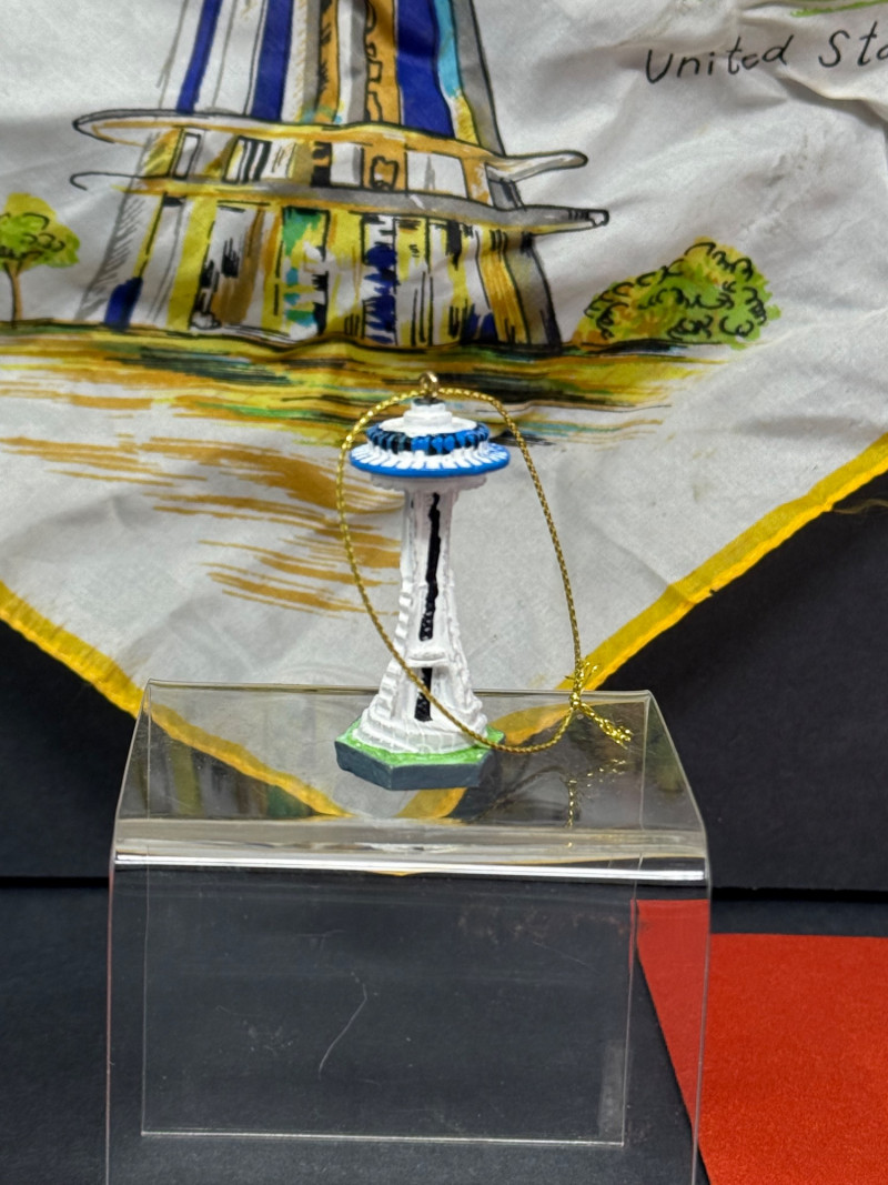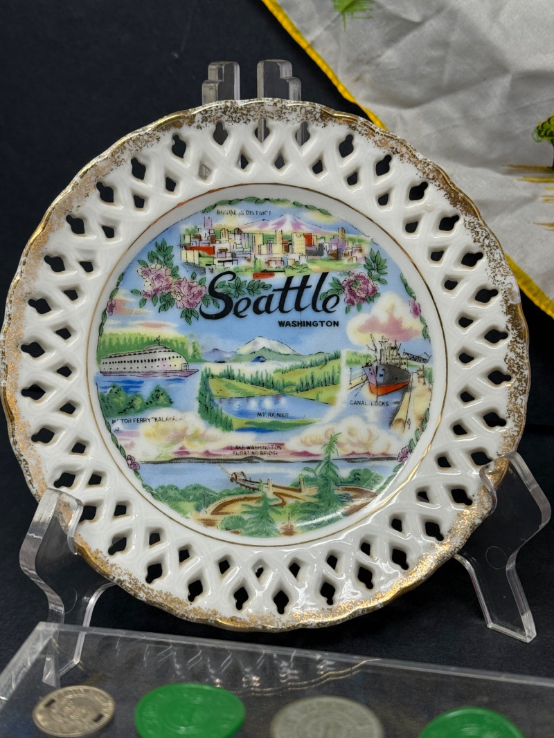 1962 Seattle World’s Fair Souvenir & Memorabilia Lot – Space Needle & Century 21 Expo Fantastic group of authentic souvenirs from the Century 21 Exposition (Seattle World’s Fair, 1962) — highlighting the iconic Space Needle and mid-century modern design. Includes: Original Space Needle Restaurant Menu – Complete dinner menu from the 1962 Space Needle Resturant, featuring classic entrées such as Pacific salmon, prime ribs, lobster tails, and the famous “Space Needle Coupe” dessert. Gold foil Space Needle illustration on the cover. Size: approx. 11” x 17” unfolded. Souvenir Silk Handkerchief/Scarf – Colorful textile with illustrations of the Space Needle, Monorail, and U.S. Science Pavilion. Size: approx. 16” square. Porcelain Seattle Souvenir Plate – Decorative porcelain plate with reticulated edge and gilt accents, showing local landmarks. Diameter: approx. 7.5”. Space Needle Miniature Figurine – Small novelty collectible figurine. Height: approx. 2.5”. Parking Tokens & Transit Tokens – Includes U.D.P.A. Shoppers Park brass tokens and green Seattle transit/ferry tokens from the fair period. Sizes: range from 0.75”–1” diameter. Additional Ephemera – Small display-ready Seattle keepsakes from 1962. Era: 1962 (Seattle World’s Fair / Century 21 Expo)