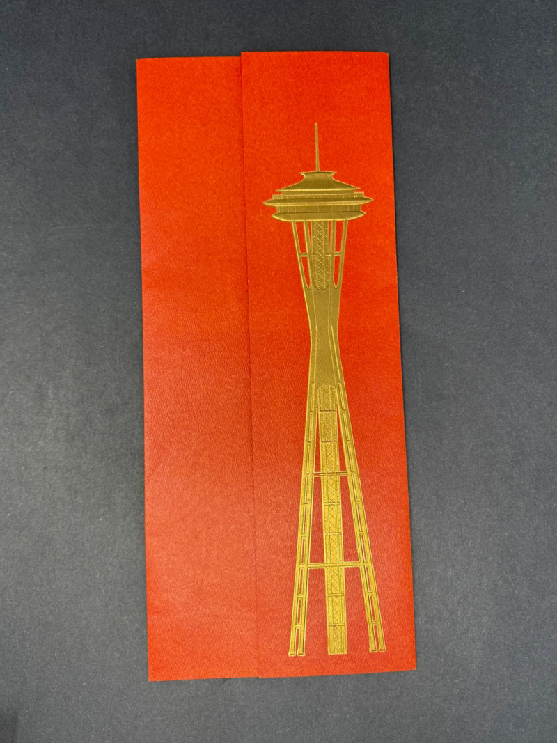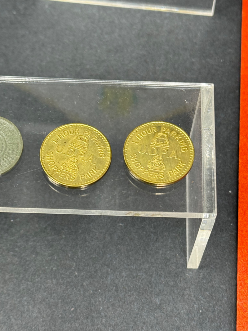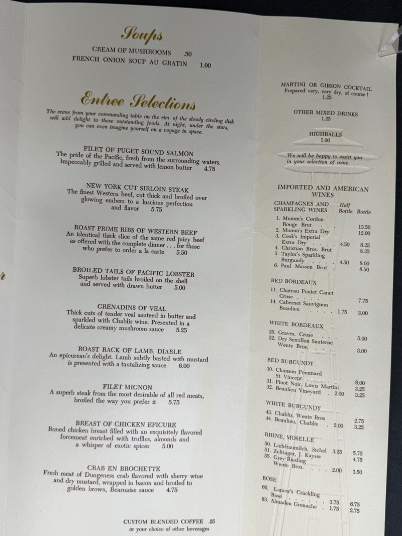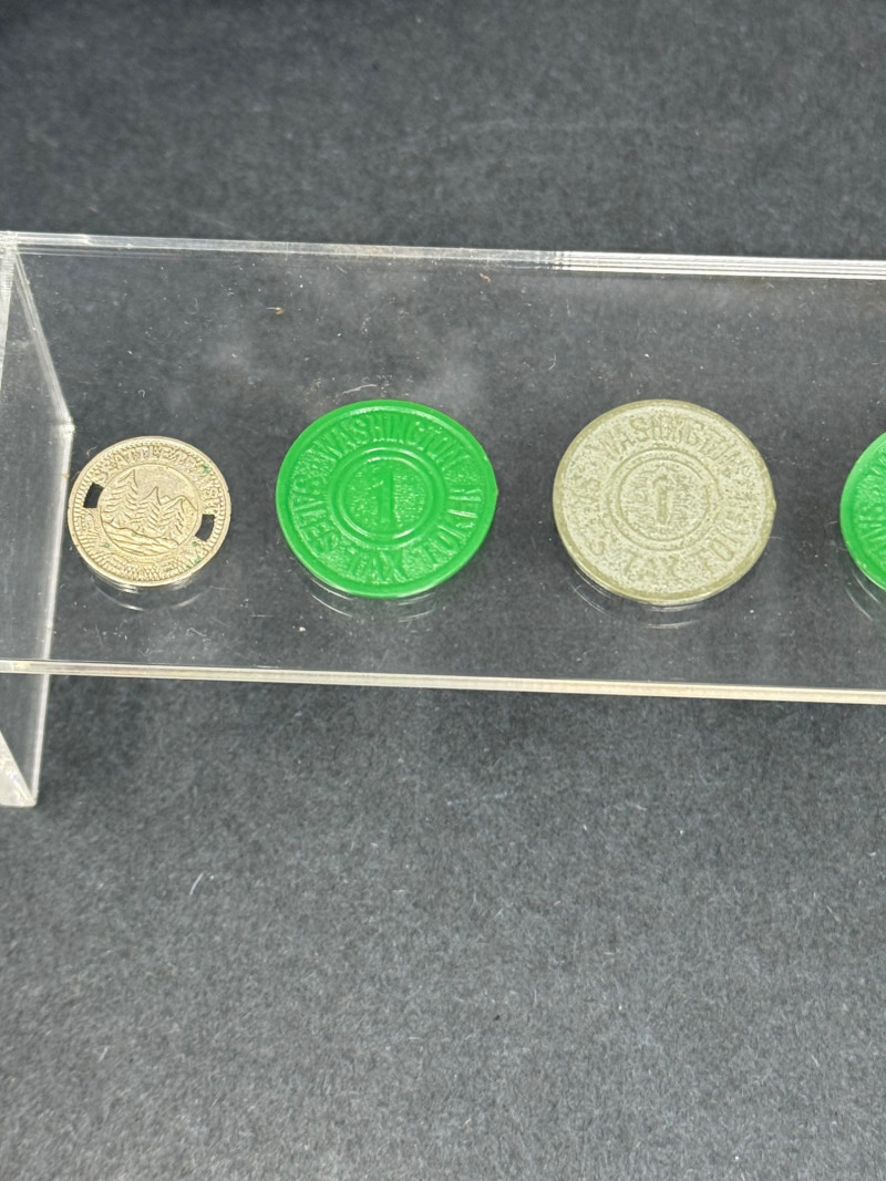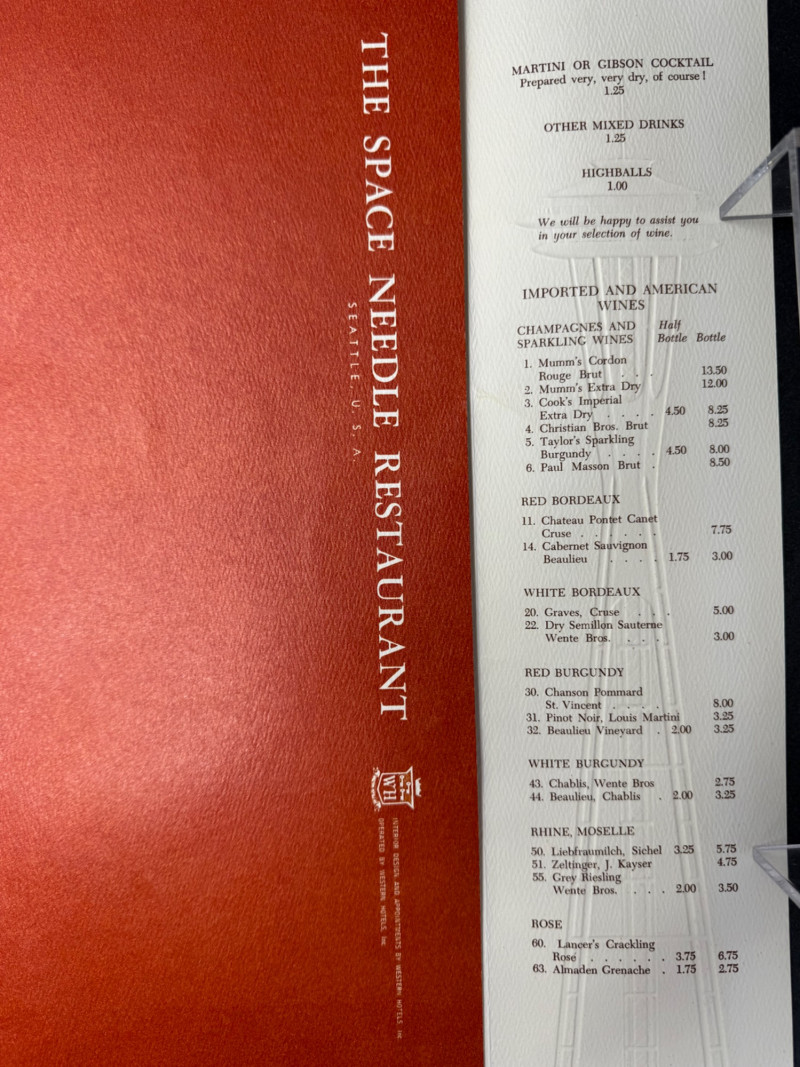 1962 Seattle World’s Fair Souvenir & Memorabilia Lot – Space Needle & Century 21 Expo Fantastic group of authentic souvenirs from the Century 21 Exposition (Seattle World’s Fair, 1962) — highlighting the iconic Space Needle and mid-century modern design. Includes: Original Space Needle Restaurant Menu – Complete dinner menu from the 1962 Space Needle Resturant, featuring classic entrées such as Pacific salmon, prime ribs, lobster tails, and the famous “Space Needle Coupe” dessert. Gold foil Space Needle illustration on the cover. Size: approx. 11” x 17” unfolded. Souvenir Silk Handkerchief/Scarf – Colorful textile with illustrations of the Space Needle, Monorail, and U.S. Science Pavilion. Size: approx. 16” square. Porcelain Seattle Souvenir Plate – Decorative porcelain plate with reticulated edge and gilt accents, showing local landmarks. Diameter: approx. 7.5”. Space Needle Miniature Figurine – Small novelty collectible figurine. Height: approx. 2.5”. Parking Tokens & Transit Tokens – Includes U.D.P.A. Shoppers Park brass tokens and green Seattle transit/ferry tokens from the fair period. Sizes: range from 0.75”–1” diameter. Additional Ephemera – Small display-ready Seattle keepsakes from 1962. Era: 1962 (Seattle World’s Fair / Century 21 Expo)