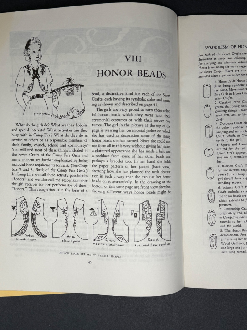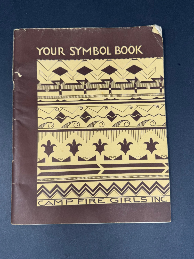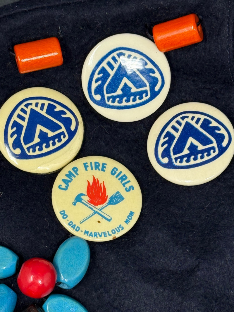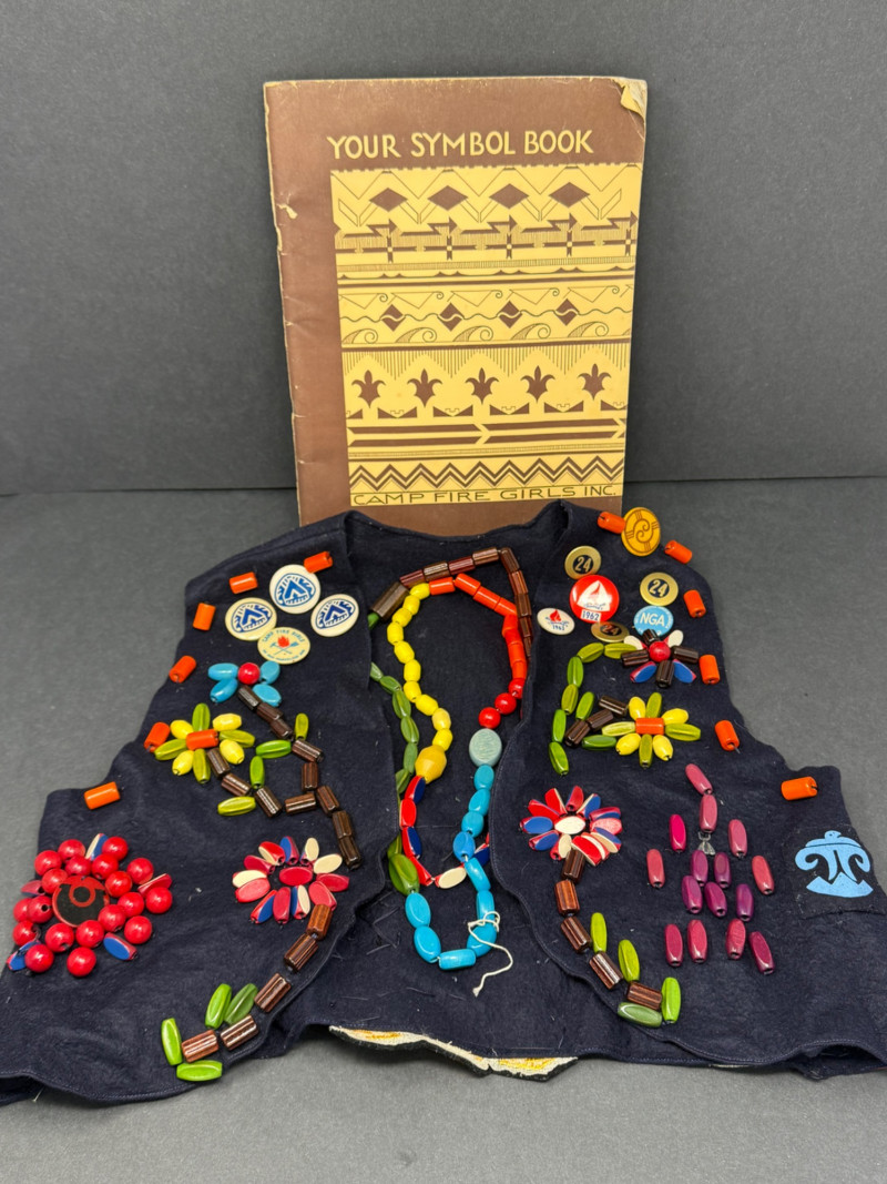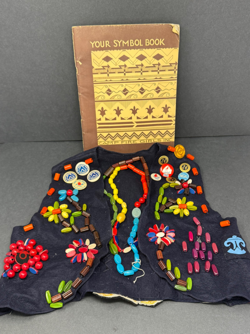Vintage Camp Fire Girls Lot – Beaded Felt Vest, Pins, Beads, & Handbook (1940s–50s) Charming collection of authentic Camp Fire Girls memorabilia, full of history and handmade details. Includes: Handmade Felt Vest – Traditional navy felt vest adorned with colorful seed beads, wood beads, and glass bead embellishments in floral and geometric patterns. Includes hand-sewn appliqué patches and several Camp Fire Girls pins/buttons attached. Size: approx. 14” x 17”. Bead Necklaces – Strands of original Camp Fire beads in red, blue, yellow, and green, worn to mark achievements. Lengths: approx. 12”–18”. Pins & Buttons – Includes enamel and metal Camp Fire Girls pins, dated examples including 1927 & 1937 anniversary badges. Sizes: 0.5”–1.25” diameter. “Your Symbol Book” Handbook – Softcover guidebook published by Camp Fire Girls Inc., detailing symbolic meanings and practices. Size: approx. 8.5” x 6”. Era: 1940s–50s A rare and colorful grouping of mid-century Camp Fire Girls history — ideal for collectors of scouting memorabilia, folk crafts, or women’s social organizations.