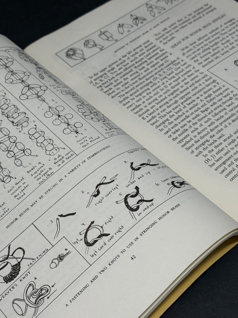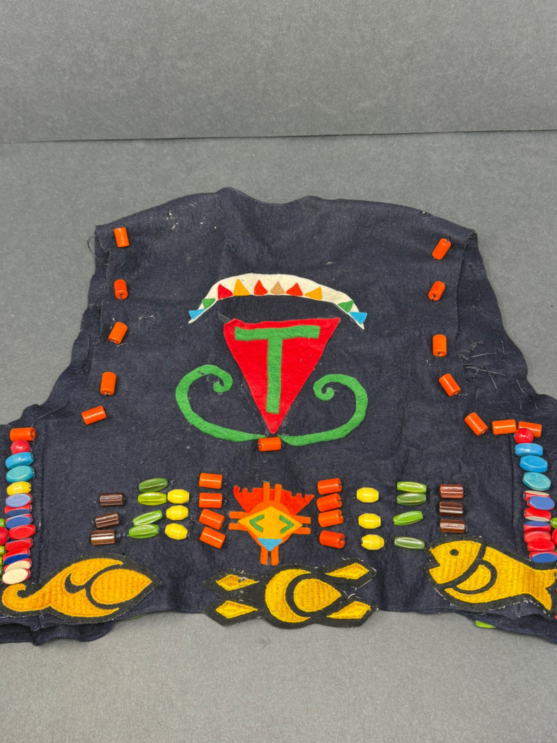 Condition: Vest shows light wear and fraying consistent with age; beadwork intact and vibrant. Pins in very good vintage condition. Handbook shows edge wear but remains legible and complete.