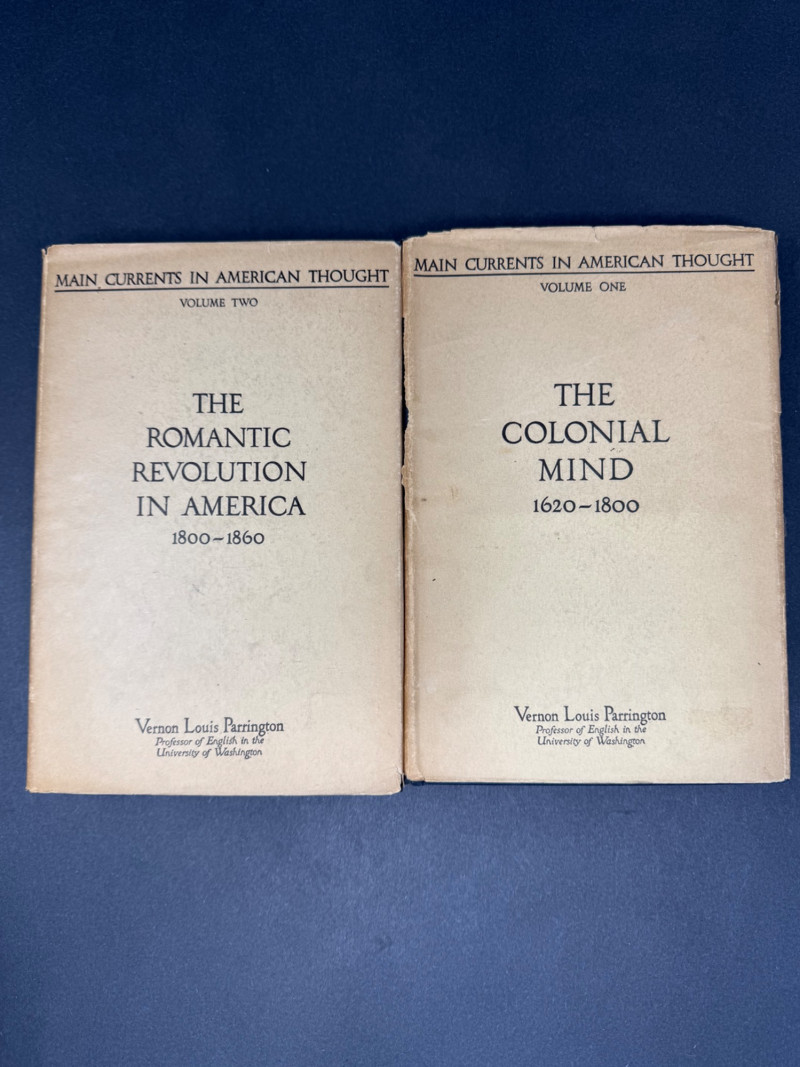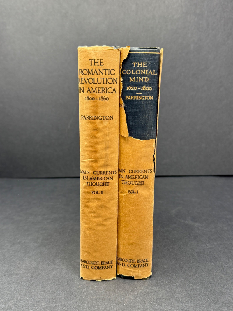 Main Currents in American Thought – Vernon Louis Parrington (First Editions, 1927) A significant pair of first edition volumes from Vernon Louis Parrington’s Pulitzer Prize–winning Main Currents in American Thought, a cornerstone in the study of American intellectual and cultural history. Volumes Included: Volume I: The Colonial Mind, 1620–1800 Volume II: The Romantic Revolution in America, 1800–1860 Author: Vernon Louis Parrington, Professor of English, University of Washington Notes: Awarded the Pulitzer Prize for History (1928) Represents one of the earliest systematic efforts to trace the intellectual foundations of the United States Highly regarded by historians and collectors alike for both content and historical importance Condition: Covers show toning, edge wear, and light creasing consistent with age Spines remain intact with some shelf wear Pages clean for era, with only mild foxing or age spotting Measurements: Why They’re Special: