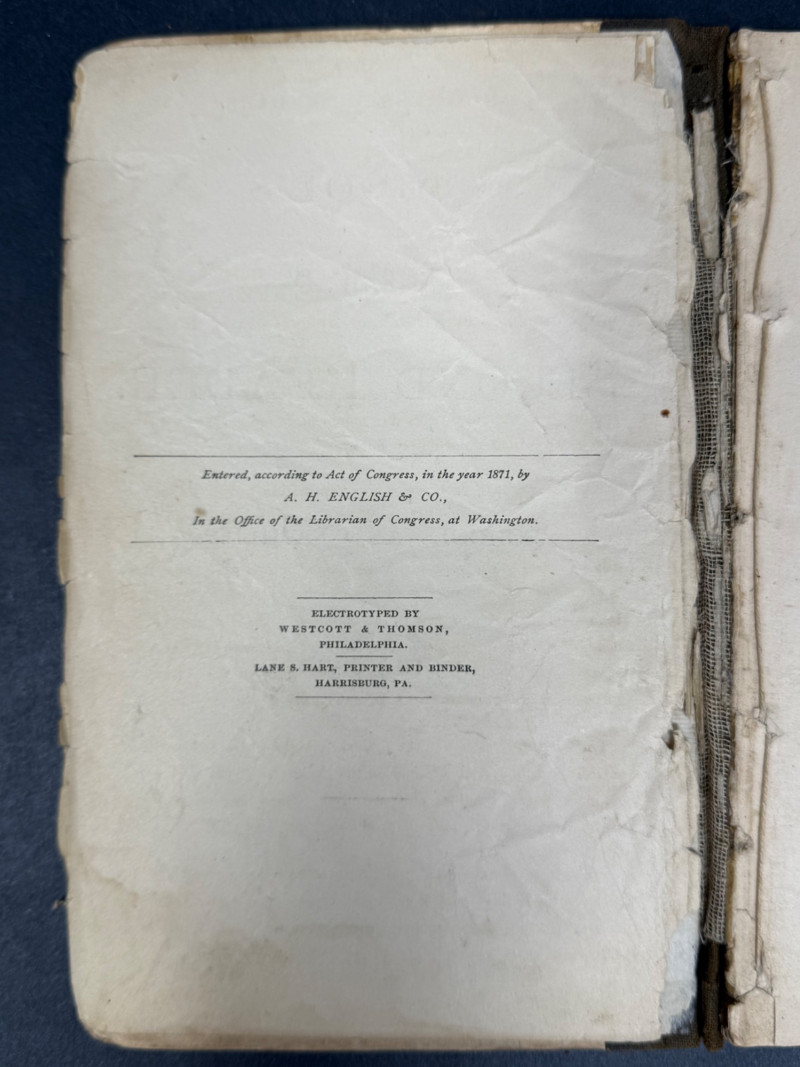 Antique 1871 Osgood’s American Second Reader – Early Schoolbook A scarce and historically important 1871 edition of Osgood’s American Second Reader, published by A.H. English & Co. This volume represents one of the foundational texts in 19th-century American education, designed to introduce children to reading and recitation with patriotic, moral, and literary selections. Title: Osgood’s American Second Reader Publisher: A.H. English & Co., Philadelphia Copyright: 1871, by A.H. English & Co. Printer/Bindery: Lane S. Hart, Harrisburg, PA Binding: Original cloth-backed boards with decorative cover (heavily worn but intact) Condition: Acceptable for age – covers show significant wear, rubbing, and fading; spine reinforced but binding remains complete; pages exhibit toning and scattered foxing; early schoolhouse wear consistent with a working textbook. Historical Note: Measurements: This example is a true survivor of 19th-century American schoolrooms—a collectible artifact for those interested in early education, Americana, or historic schoolbooks.
