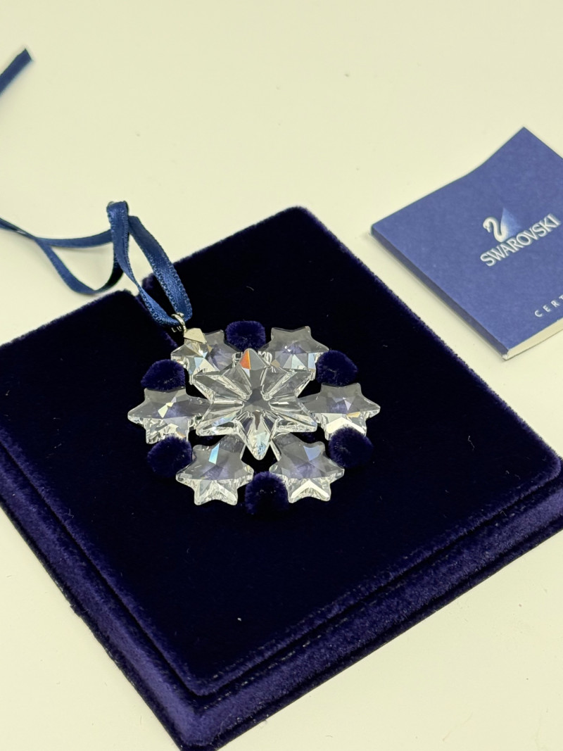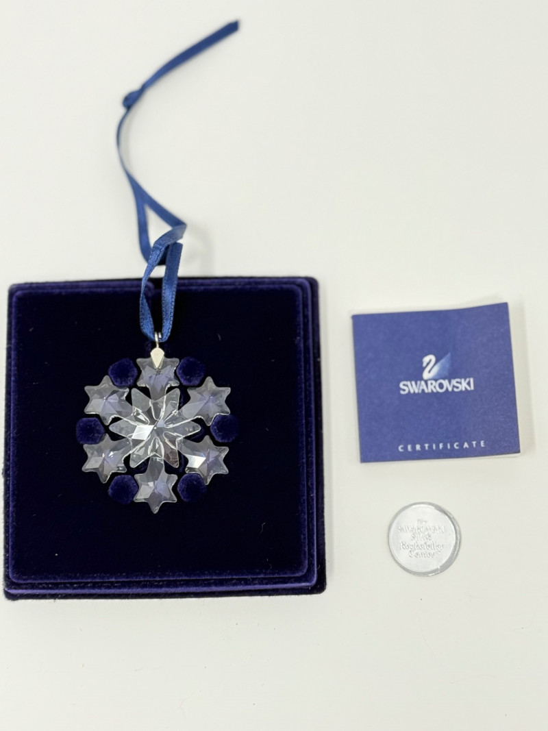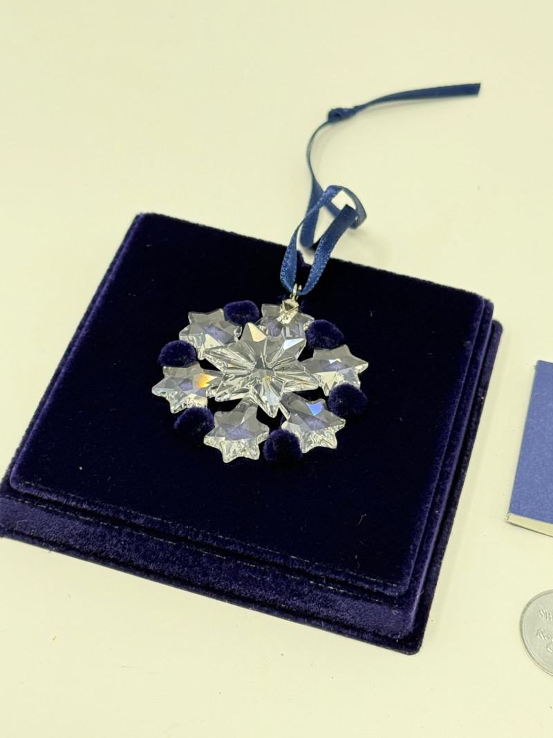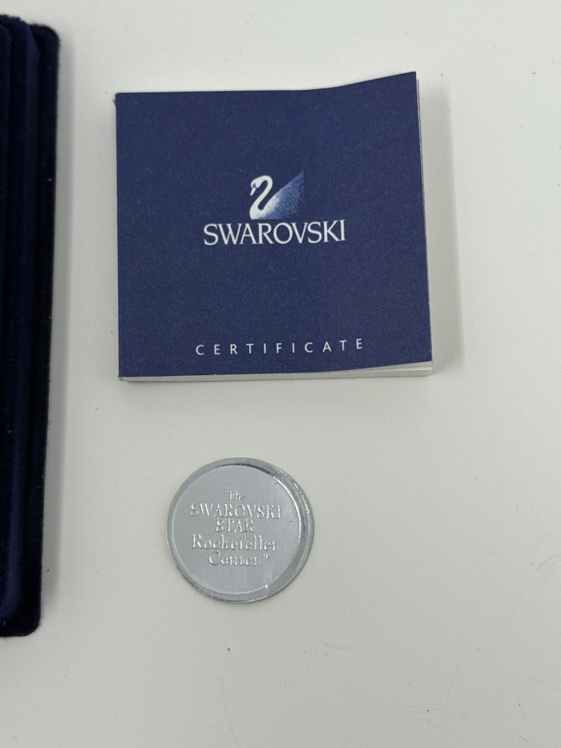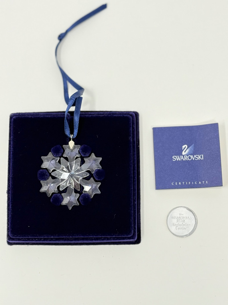 Swarovski Rockefeller Center Snowflake Ornament – Limited Edition with Certificate A stunning and collectible Swarovski crystal ornament, released as part of the brand’s exclusive holiday line in collaboration with Rockefeller Center. Details: Maker: Swarovski Design: Snowflake with faceted crystal star points, suspended on a deep blue satin ribbon Edition: Rockefeller Center Exclusive Includes: Original Swarovski blue velvet presentation box, certificate of authenticity, and commemorative coin/tag Measurements: Approx. 3" diameter Condition: Excellent condition, crystal clear with no chips or cracks; ribbon intact; box shows minimal storage wear Why it’s special: