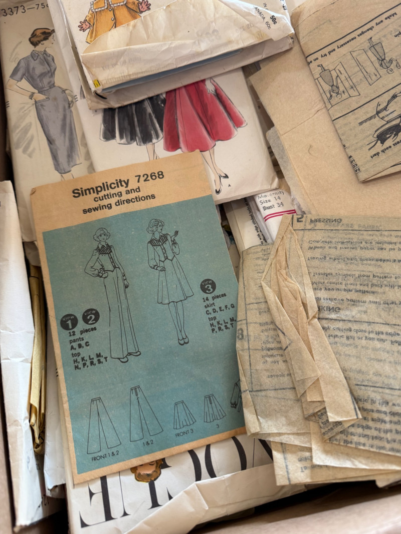 2 Mystery Boxes – Vintage Sewing Patterns (Vogue, Simplicity, McCall’s & More) Step into the world of mid-century sewing with this exciting lot of two large mystery boxes filled with vintage sewing patterns. A true treasure trove for crafters, costume designers, collectors, or resellers. Contents (examples shown in photos): Patterns from well-known brands including Vogue, Simplicity, and McCall’s. A variety of decades, primarily mid-20th century. Ranges include women’s, juniors’, children’s, and doll clothing patterns. Women’s sizing spans Bust 30"–40" (approx. US sizes 10–18 depending on pattern). Children’s and doll clothing patterns vary widely, from toddler to young child. Mix of dresses, blouses, coats, separates, and specialty garments. Condition: Patterns show typical vintage wear—some envelopes may be torn, stained, or fragile, but the majority appear complete with instructions. These have been stored for decades and are sold as-is, offering an authentic vintage sewing experience. Quantity: 2 medium-sized boxes packed full. Exact count of patterns not taken—buyer will receive the full mystery assortment as pictured. Whether you’re a sewing enthusiast, a collector of vintage fashion ephemera, or a reseller looking for inventory, these boxes are a goldmine of mid-century style.