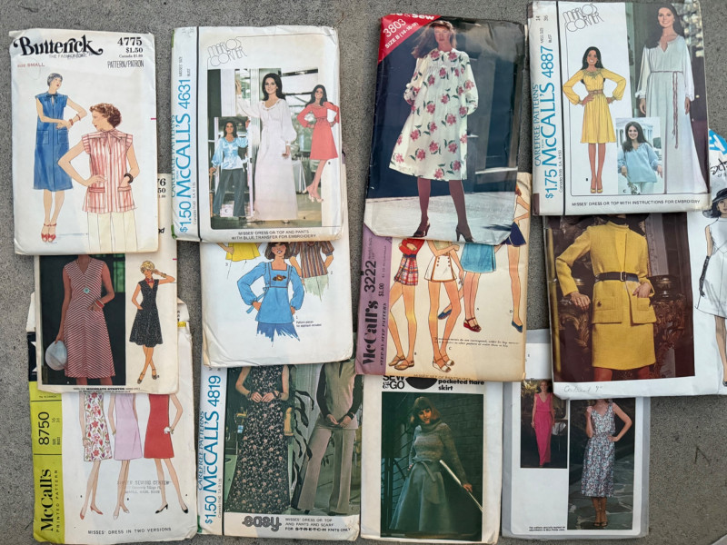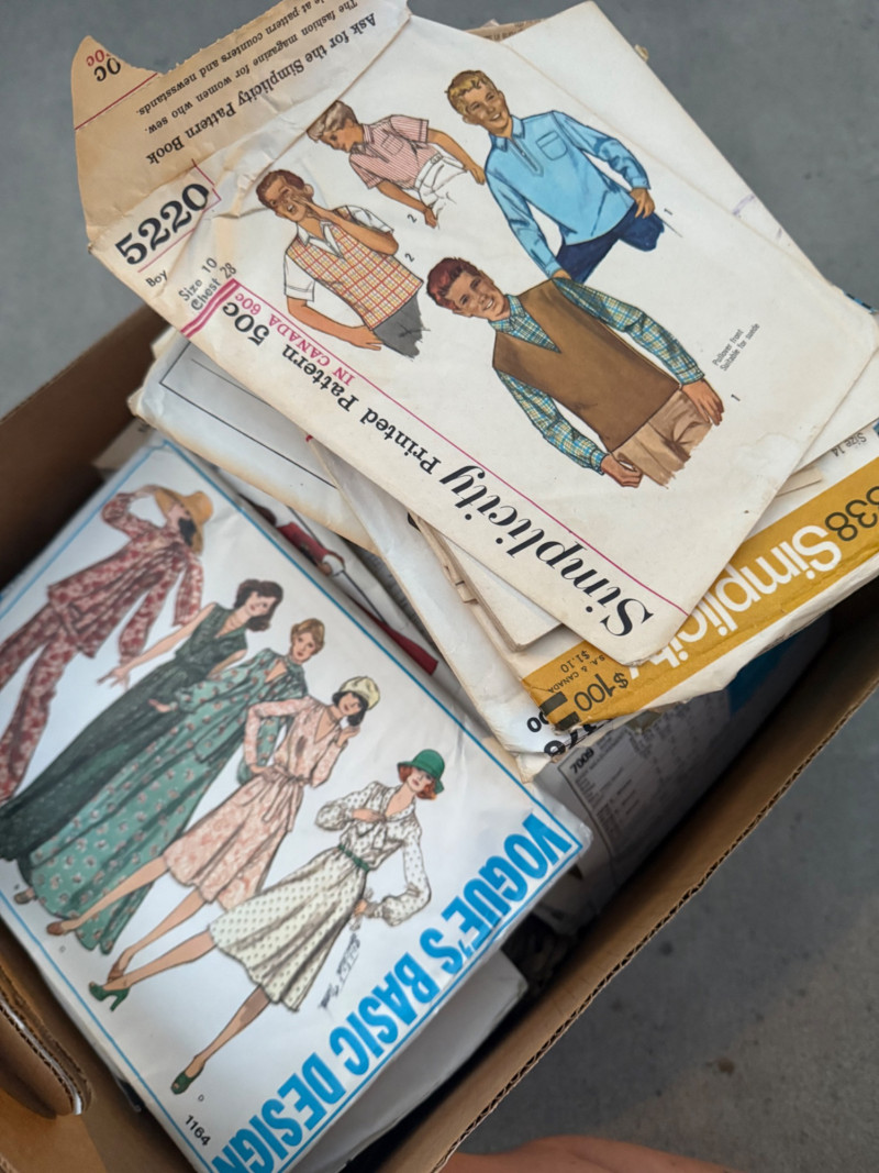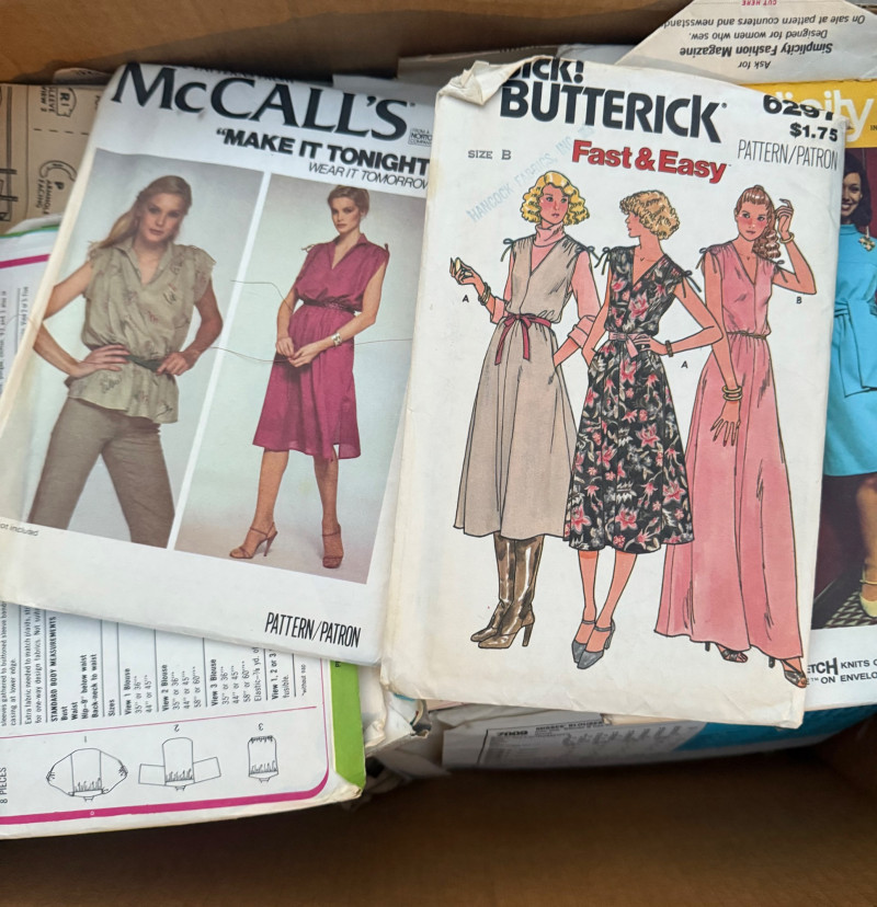 Step back into the golden age of sewing with two mystery boxes filled with authentic vintage sewing patterns from the mid-century through the 1970s. These patterns feature a range of timeless styles—dresses, skirts, coats, blouses, and more—showcasing the fashion history of the era. Contents & Highlights: A mix of brands including McCall’s, Butterick, Simplicity, and Stretch & Sew Patterns spanning 1950s–1970s, featuring mod, boho, tailored, and classic silhouettes Range includes women’s wear, day dresses, formal looks, separates, and more Each box contains a generous variety (dozens of patterns in total) Measurements & Sizes: Patterns cover a range of vintage sizes, generally Bust 30”–40” / Waist 24”–32” / Hip 33”–42” Some may be uncut, others gently used with original instructions included As these are vintage patterns, sizing runs smaller than modern equivalents Condition: Pre-owned vintage condition Some envelopes show wear, creases, or tears, but patterns inside are usable A true “treasure hunt” mix—perfect for collectors, seamstresses, or designers looking for authentic mid-century styles Why It’s Special:2 Mystery Boxes – Vintage Sewing Patterns (McCall’s, Butterick, Simplicity & More)