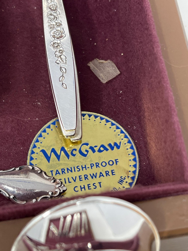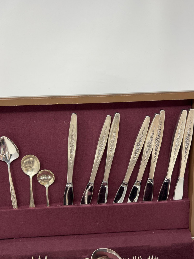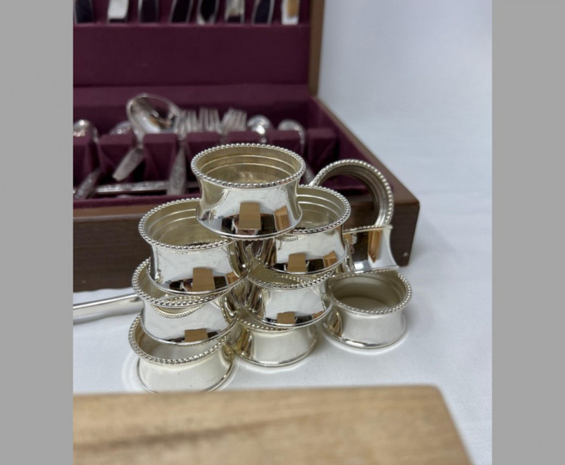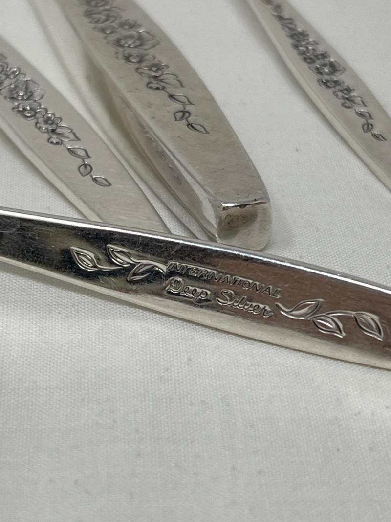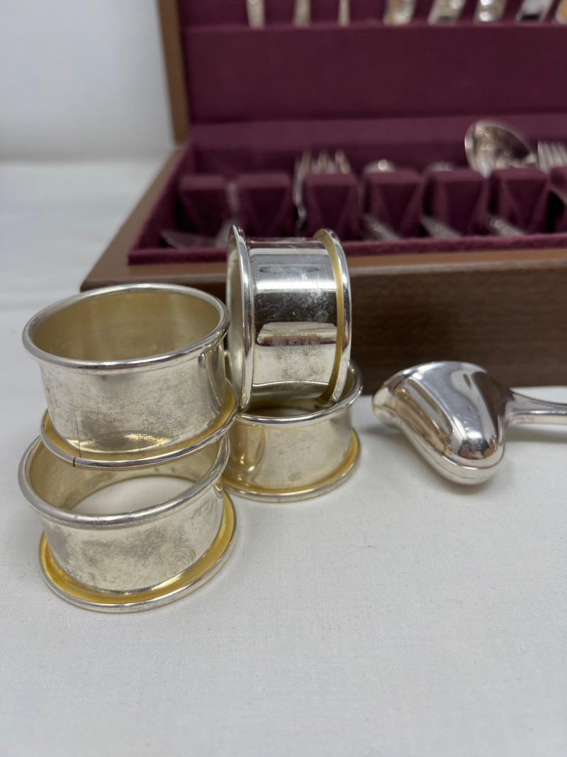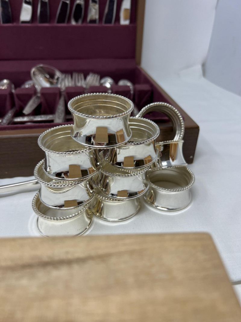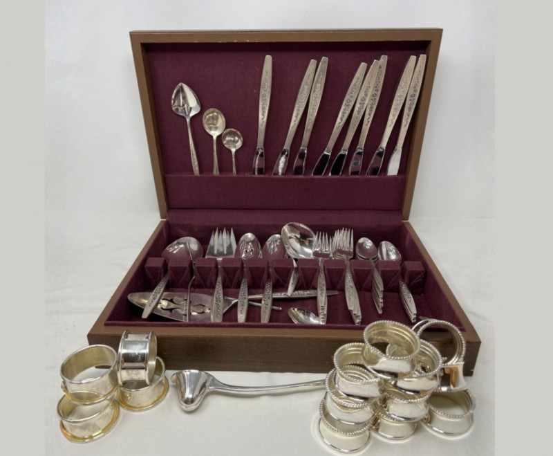 An elegant dining ensemble anchored by an 8-place setting of International Deep Silver flatware, accompanied by a selection of silverplate accessories. This lot includes: Gerity Silverplate Candle Snuffer 4 Leonard Silverplate Napkin Rings 10 Beaded Concave Silver-Toned Napkin Rings McGraw Tarnish-Proof Storage Box Perfect for formal entertaining or vintage table styling, this collection blends timeless design with practical charm. The flatware’s classic lines and silverplate finish pair beautifully with the gleaming napkin rings and thoughtful presentation box.