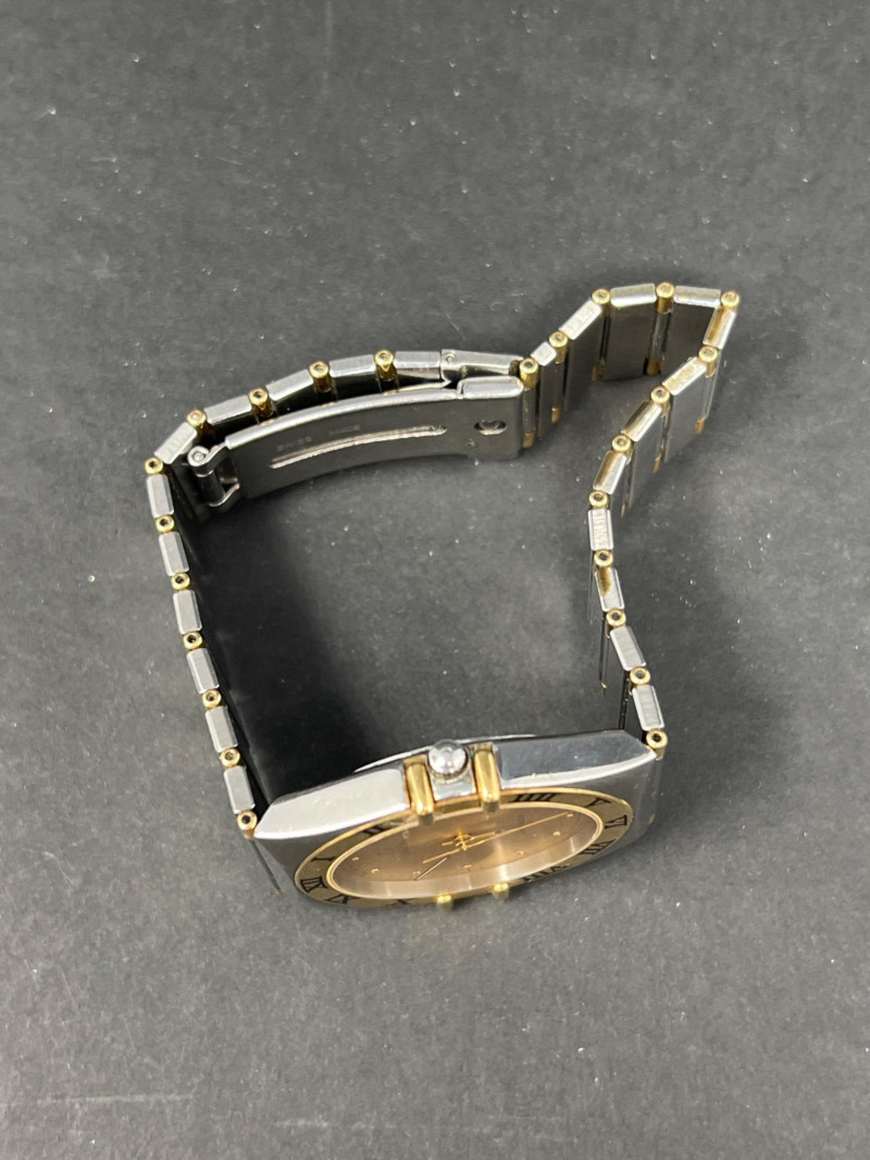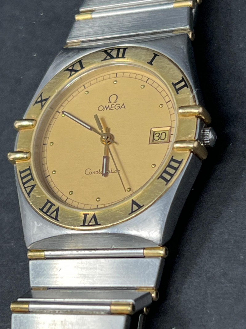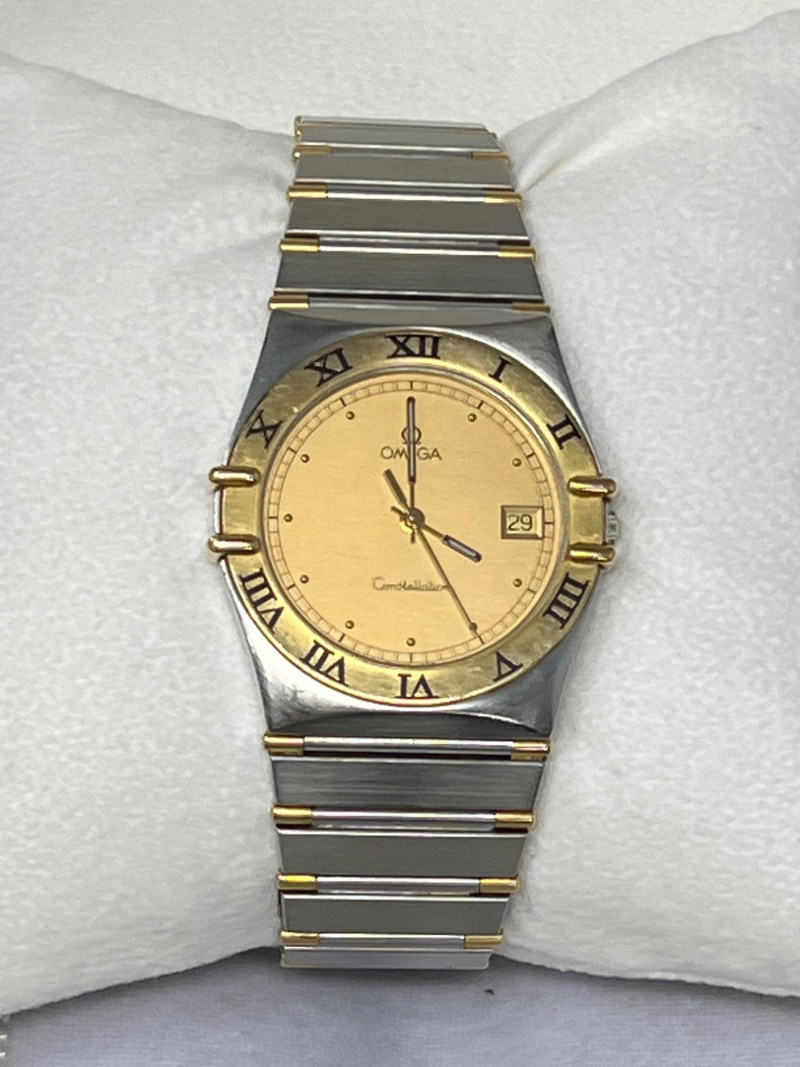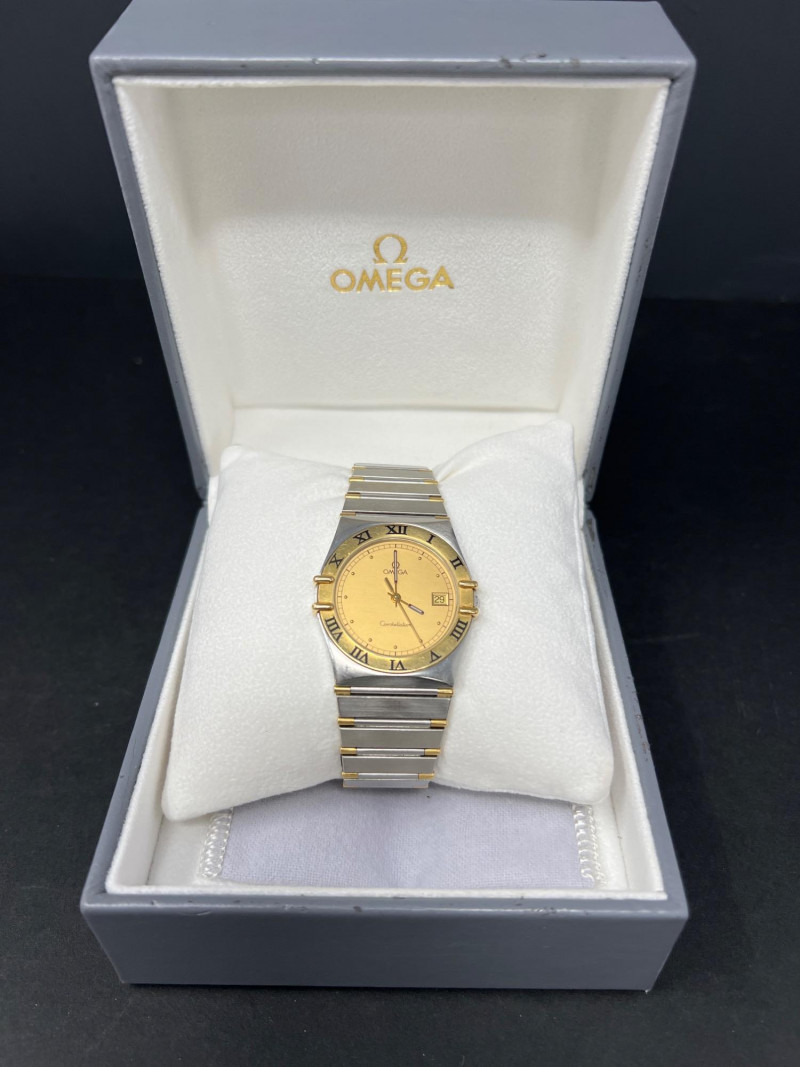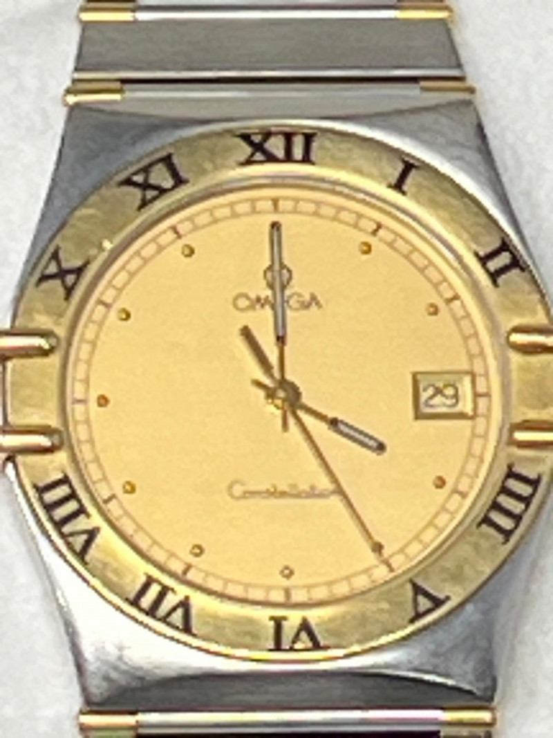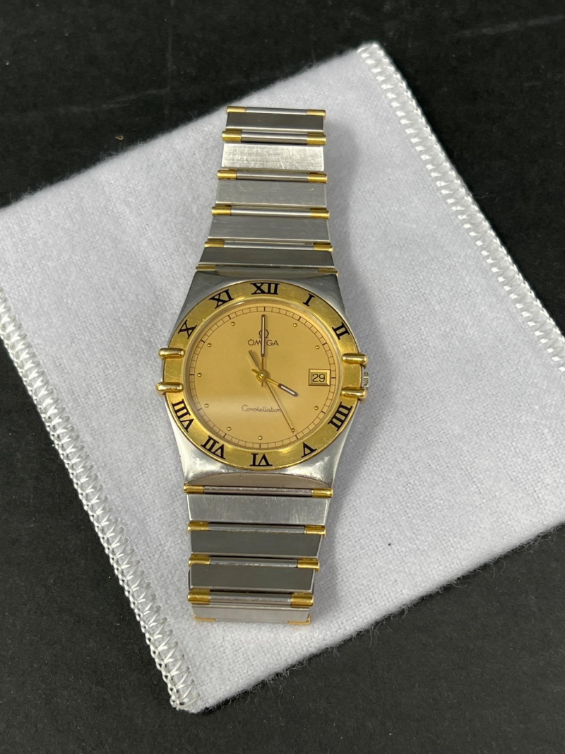 A timeless Omega Constellation wristwatch, complete with its original presentation case, manual insert, and link band. This elegant timepiece features a Roman numeral dial, day viewer, and sweeping second hand. Though it currently requires a new battery, both hands adjust smoothly via independent crown settings. A refined addition for collectors of vintage Swiss horology or those seeking a legacy piece with enduring style. Additional information: face of watch is 1.25" from crown to other side (approx. 3.2 cm). The serial number is 54435767, year 1993 or 1994. The watch is run on battery. The make is a Constellation. There are two additional links for the band (not shown) - Fits 7" diameter wrist at this time. Potentially stainless steel with solid gold bezel (see this vintage Omega info).