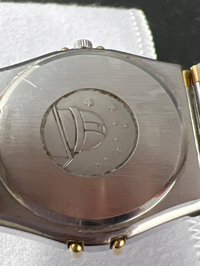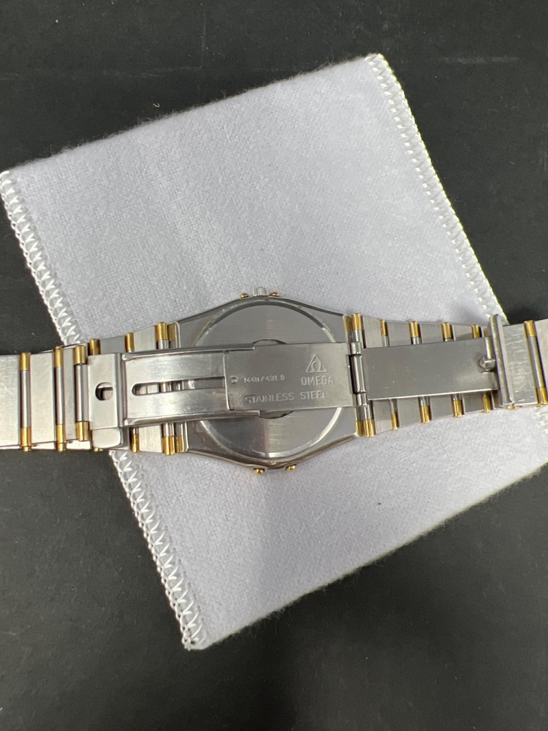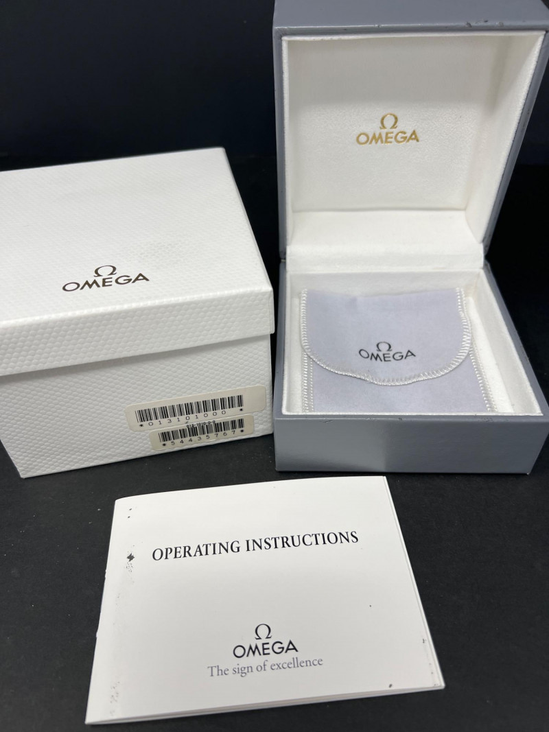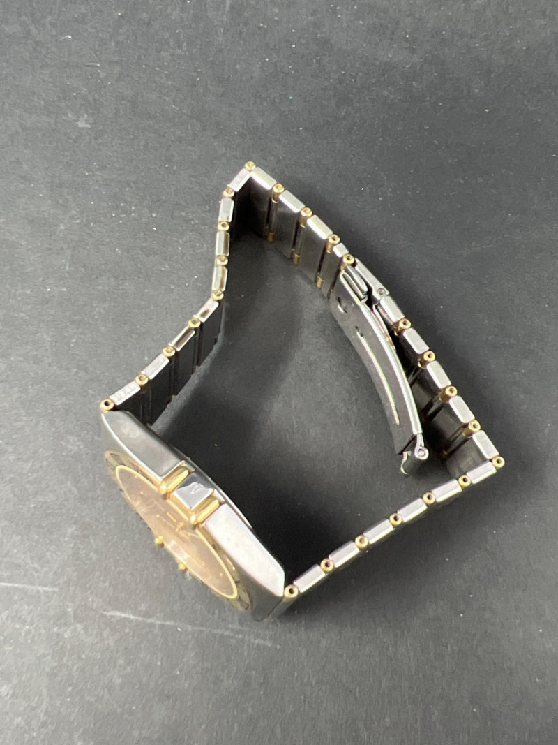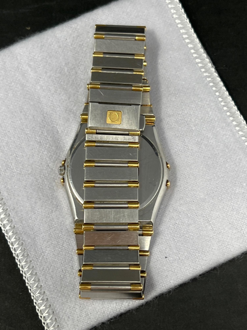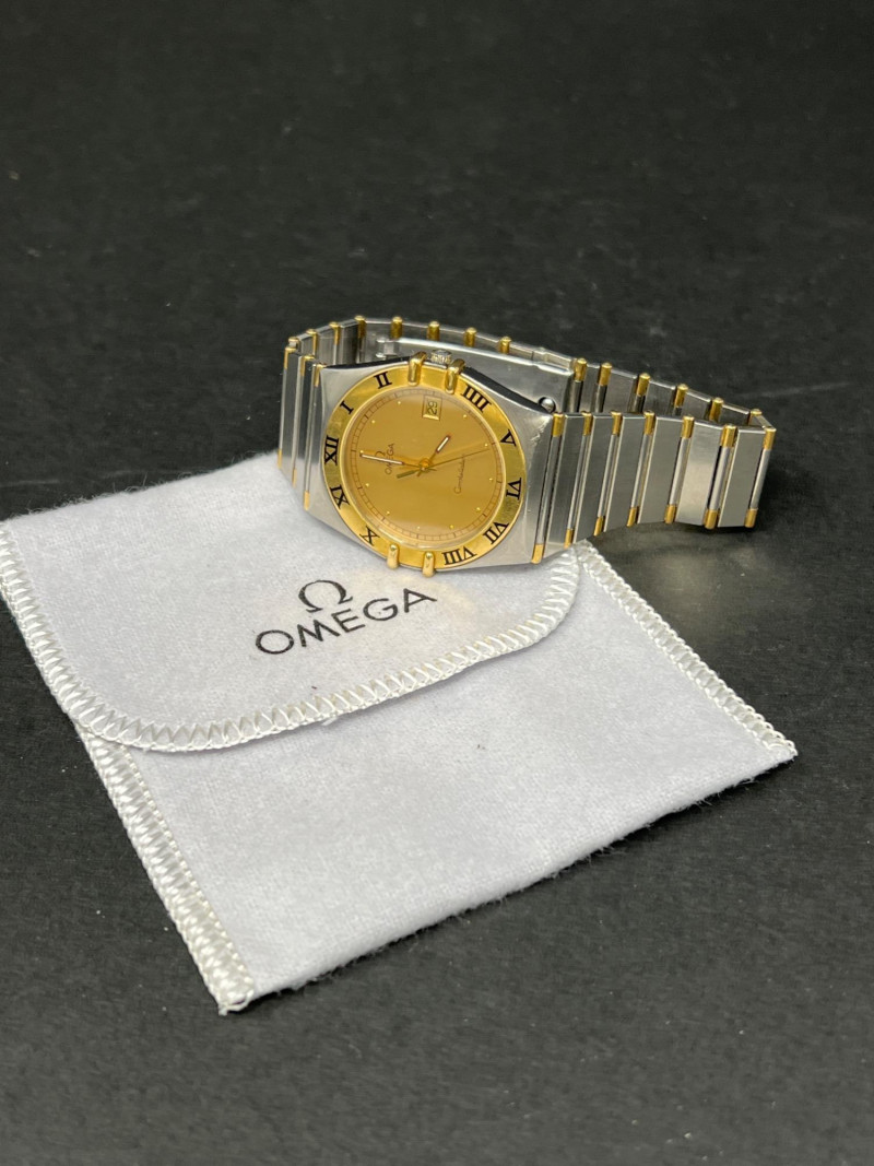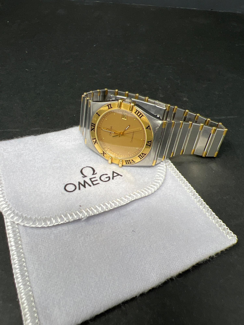 A timeless Omega Constellation wristwatch, complete with its original presentation case, manual insert, and link band. This elegant timepiece features a Roman numeral dial, day viewer, and sweeping second hand. Though it currently requires a new battery, both hands adjust smoothly via independent crown settings. A refined addition for collectors of vintage Swiss horology or those seeking a legacy piece with enduring style. Additional information: face of watch is 1.25" from crown to other side (approx. 3.2 cm). The serial number is 54435767, year 1993 or 1994. The watch is run on battery. The make is a Constellation. There are two additional links for the band (not shown) - Fits 7" diameter wrist at this time. Potentially stainless steel with solid gold bezel (see this vintage Omega info).
