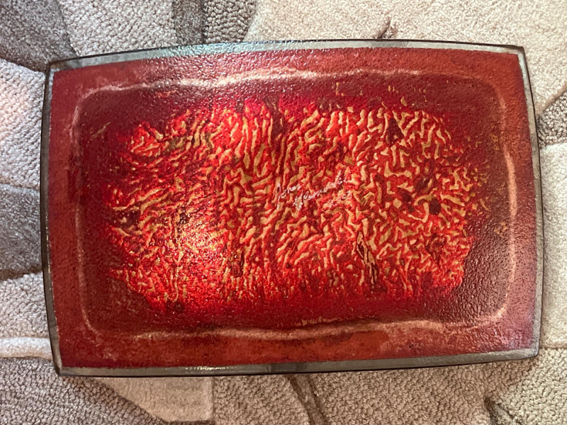 A kiln-formed glass art plate signed Jones Glassworks and dated 2003, featuring layered coloration and a gently curved rectangular form. The piece reflects early 2000s studio glass aesthetics—balancing translucence, texture, and controlled abstraction. Its elongated shape and painterly surface suggest a decorative object intended for wall display or tabletop presentation. The signature is etched on the reverse, confirming studio origin and individual craftsmanship.
