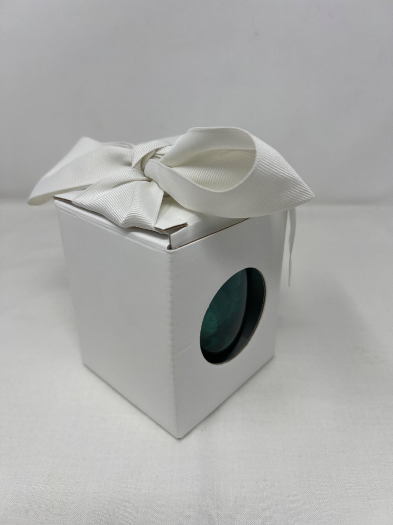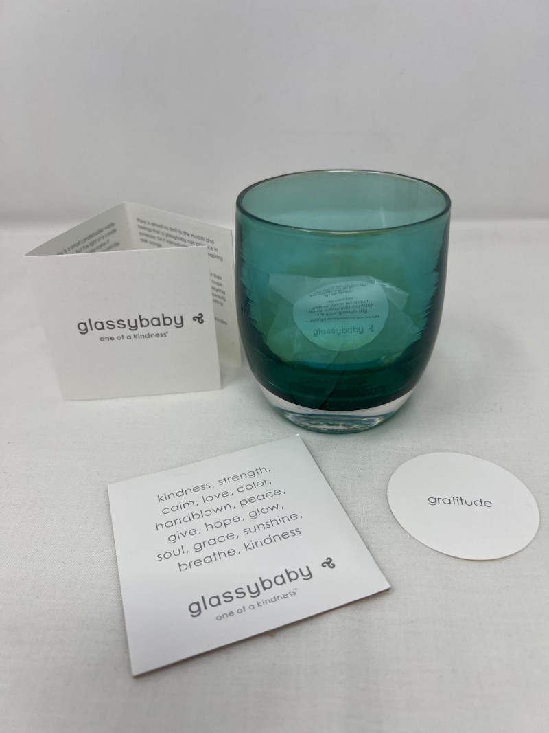 A hand-blown Glassybaby votive titled “Gratitude”, crafted in a rich teal hue with subtle translucence and rounded form. Known for their emotional resonance and Pacific Northwest origins, Glassybaby pieces blend simplicity with sentiment—each one shaped by hand and intended to evoke a quiet moment of reflection. This votive carries the studio’s original gift-boxed presentation and brochure hallmarks.